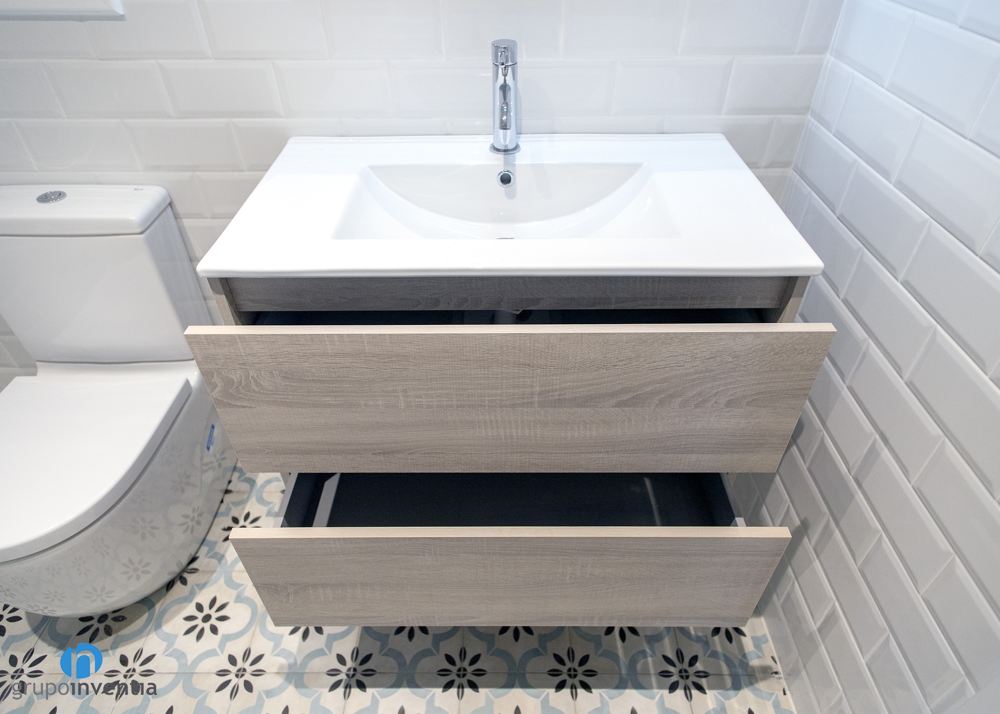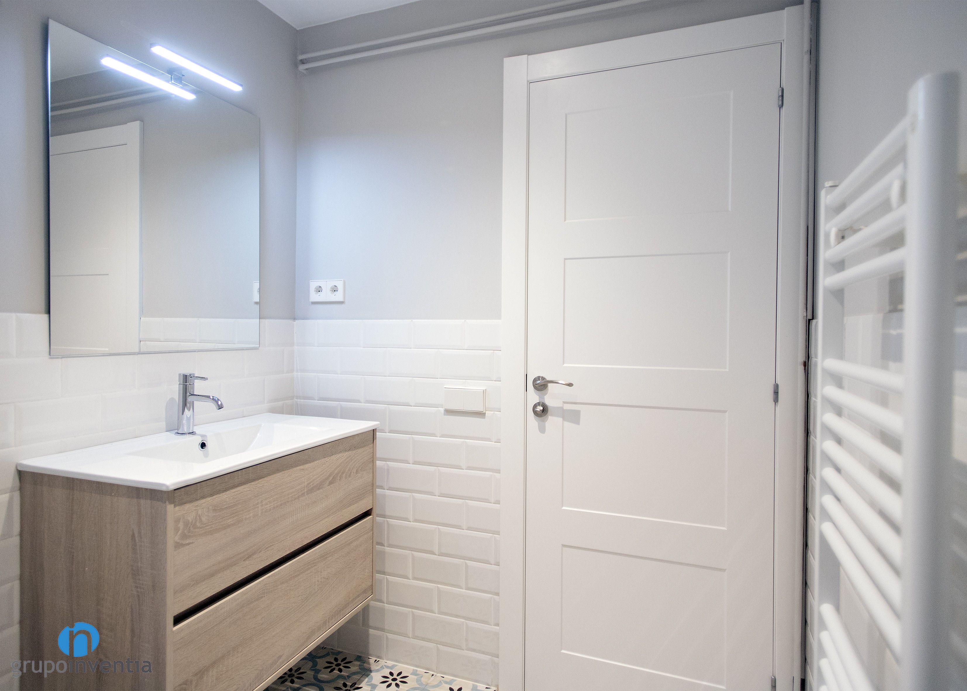 To get a more modern image in the bathroom the walls were tiled in medium height with white meter tiles. The rest of the wall until reaching the ceiling was painted in a soft gray tone. Thanks to these neutral tones, a spacious and bright space was reached, culminated with a hydraulic pavement that gives it a lot of style and personality.