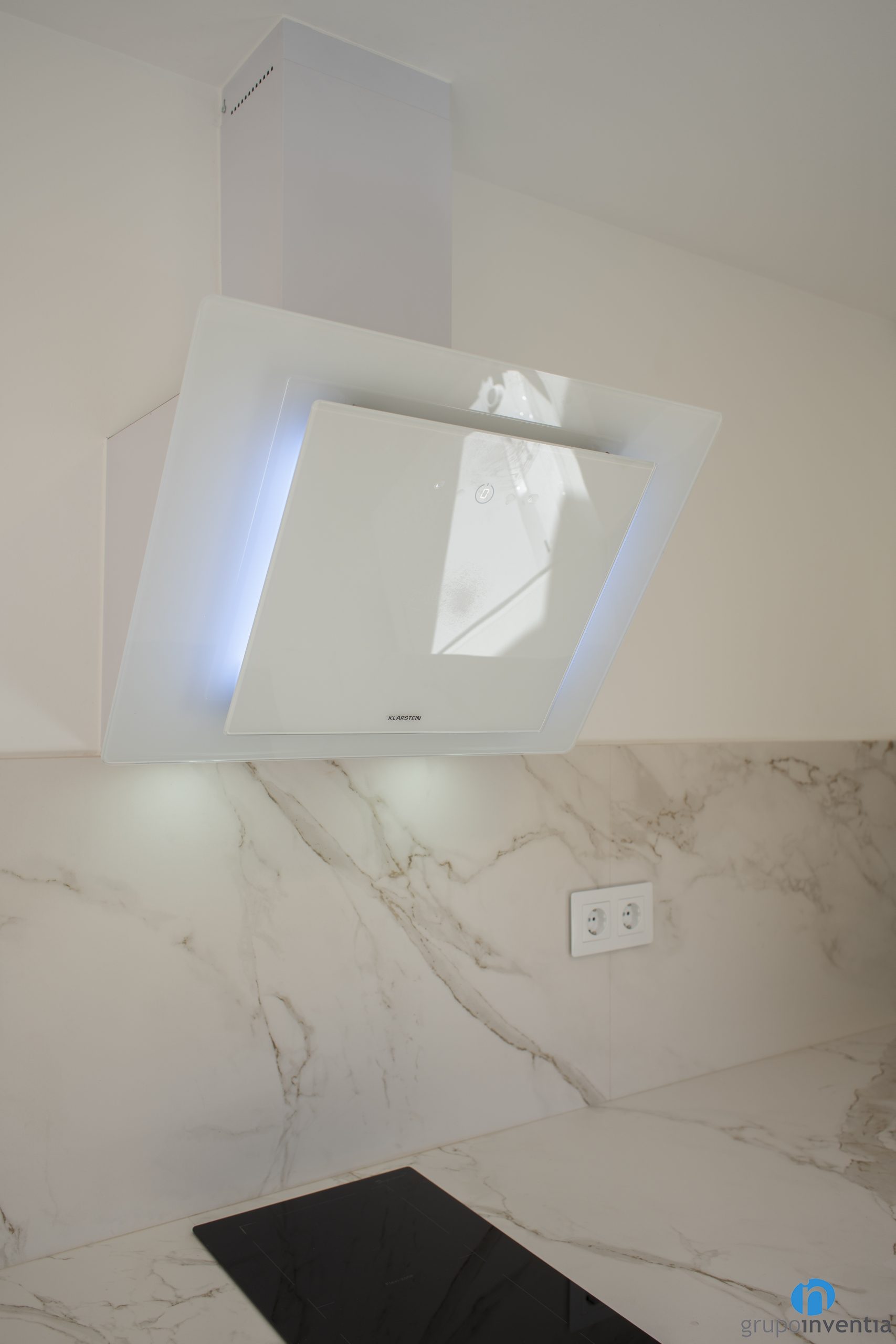 On it we have installed the vitroceramic plate and it is accompanied by a design extractor hood in white. On the left side appears a new countertop that can be used as a breakfast bar. Another improvement in this kitchen reform is that it has storage capacity in the entire lower part.
