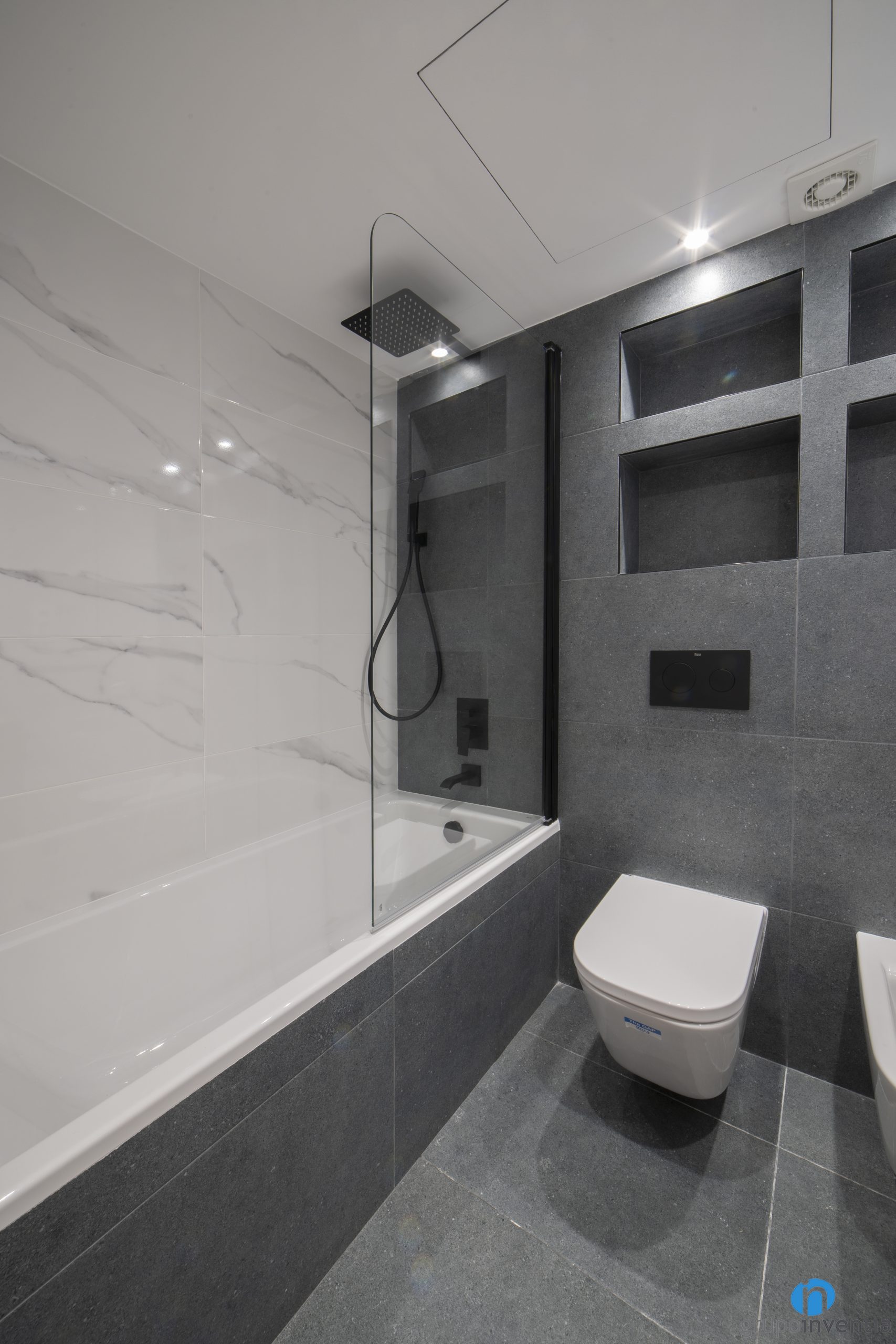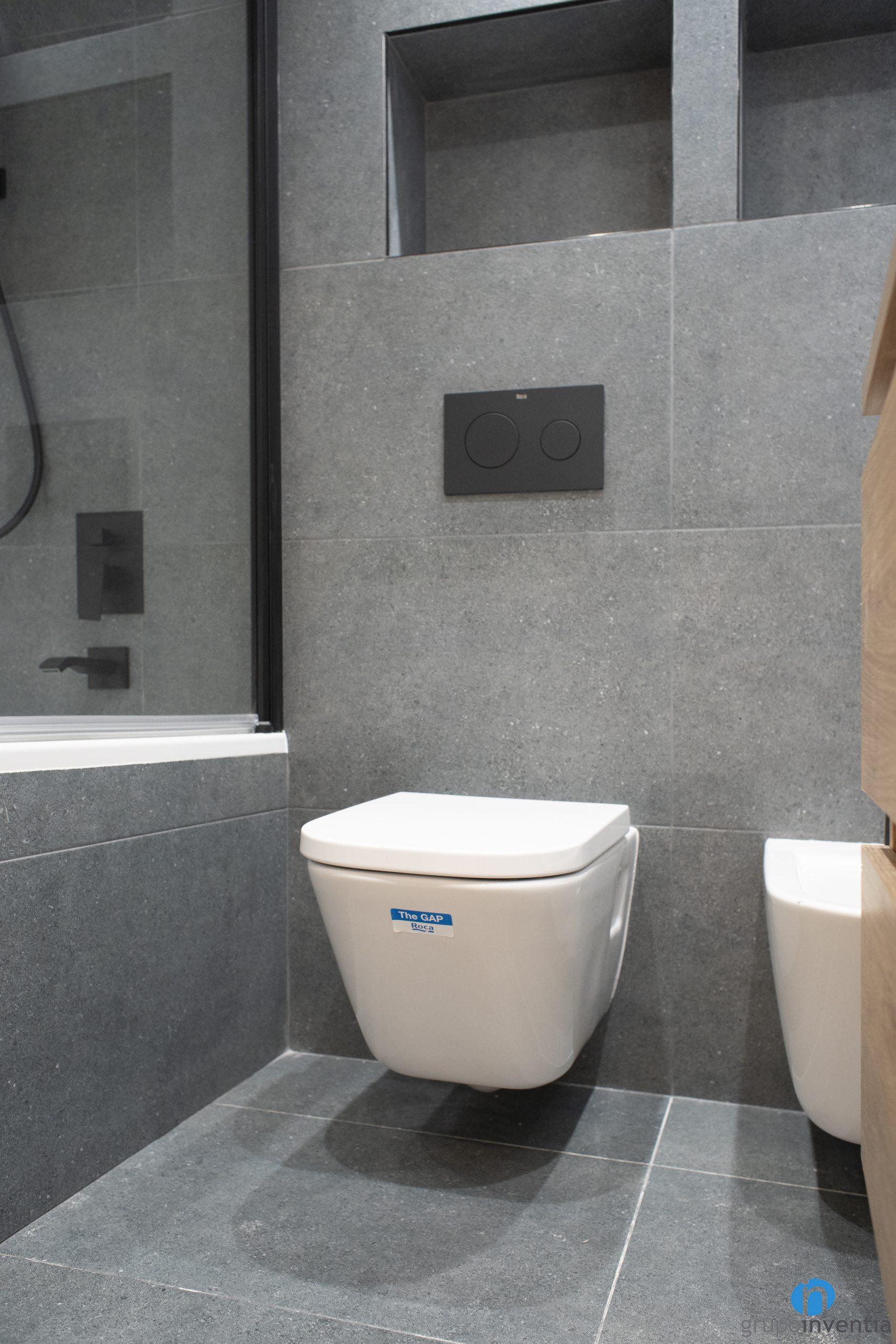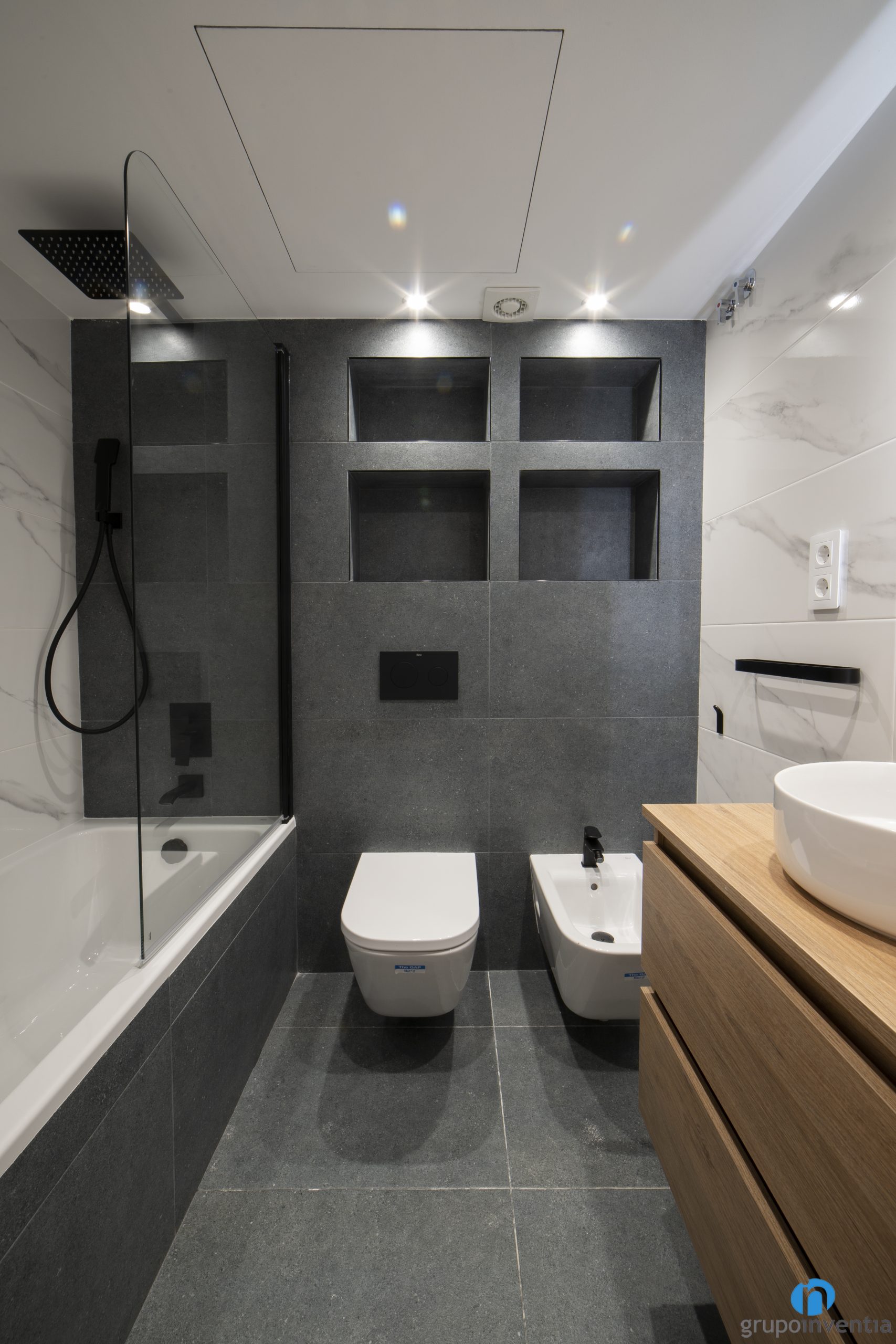 The sanitary equipment in this bathroom consists of a toilet with storage furniture, a pair of floating toilet and bidet and a bathtub. It is a very complete bathroom renovation that can be used in the best conditions at all times. On a practical level, it is a toilet space that is complemented by day-to-day needs.