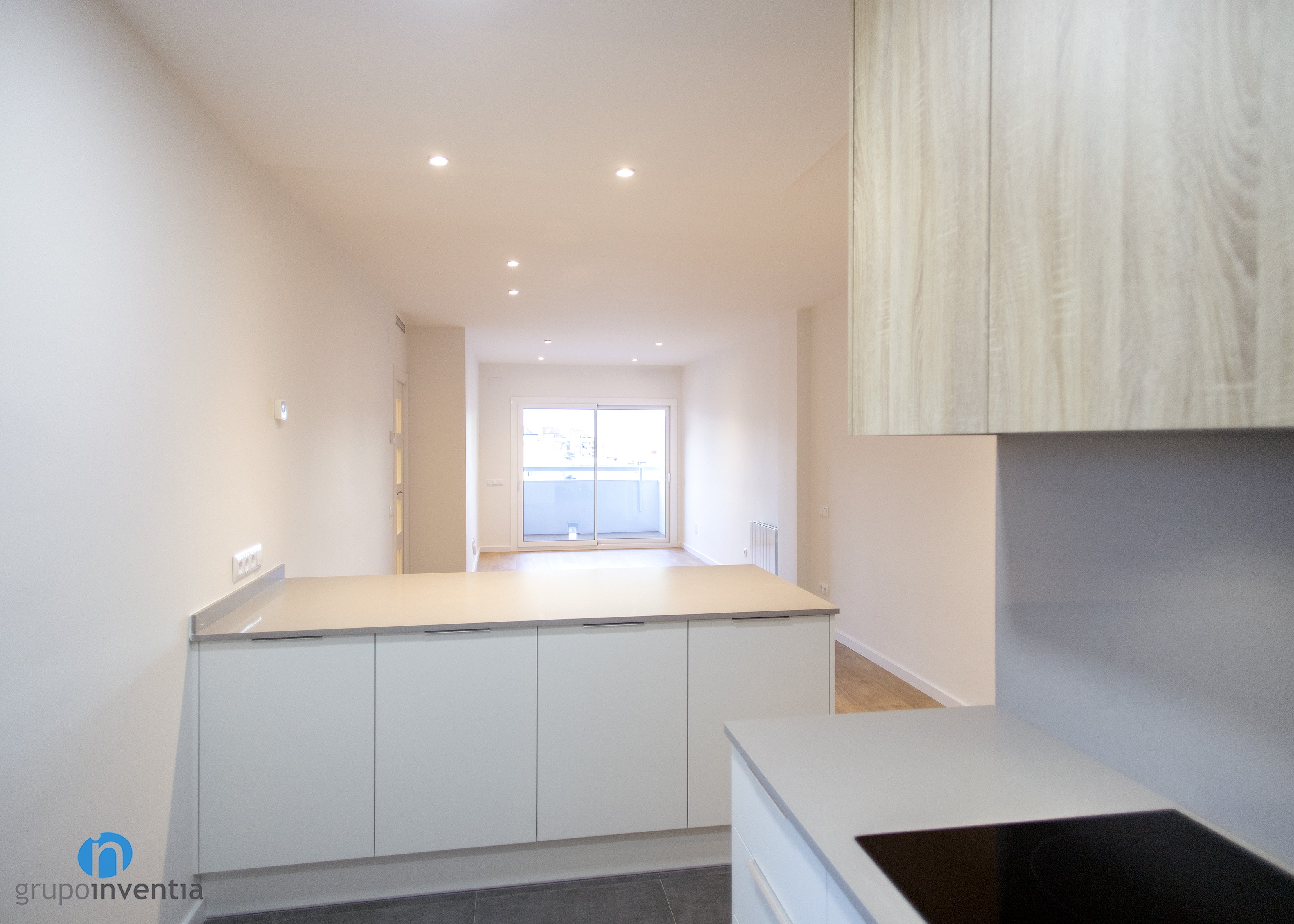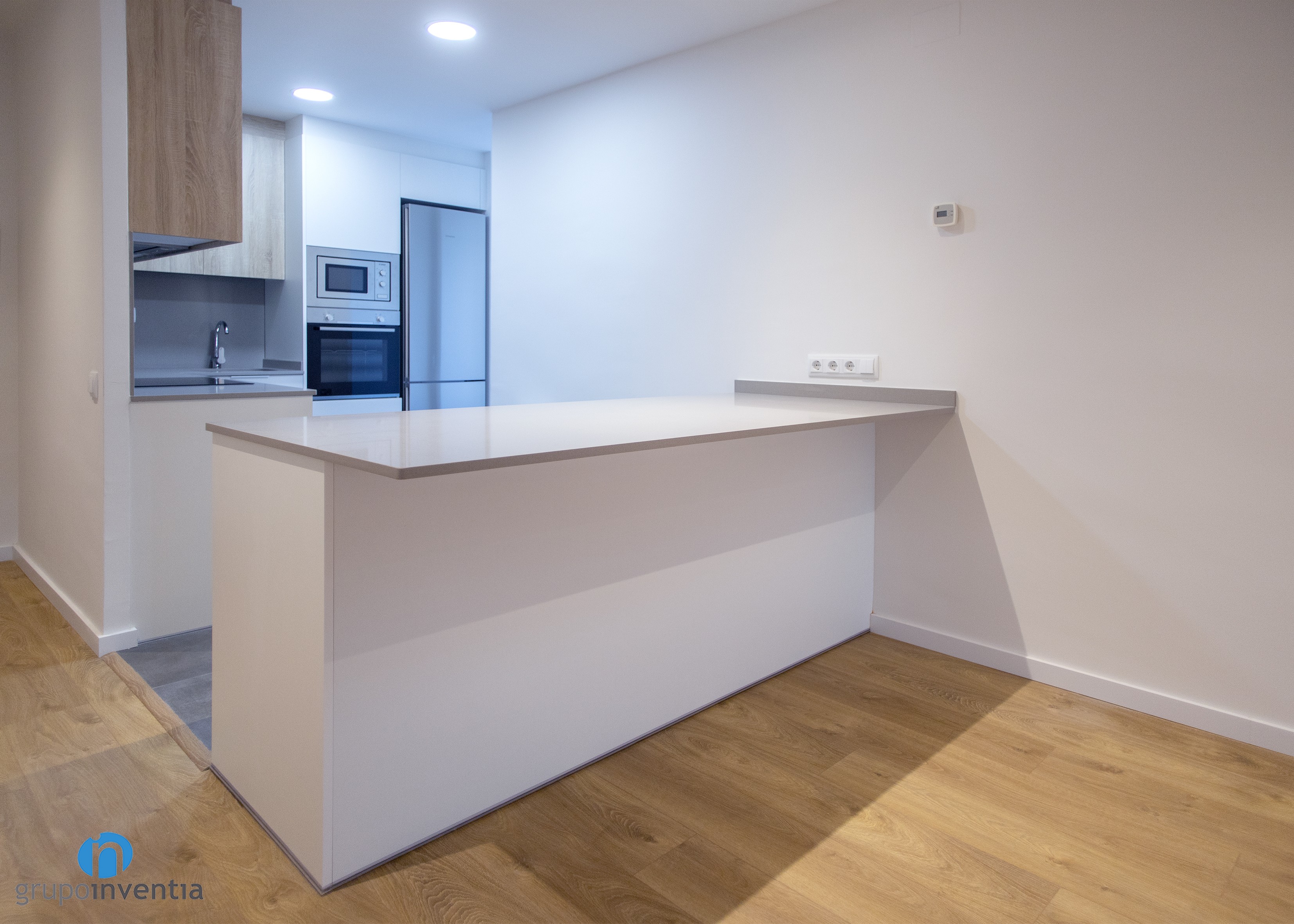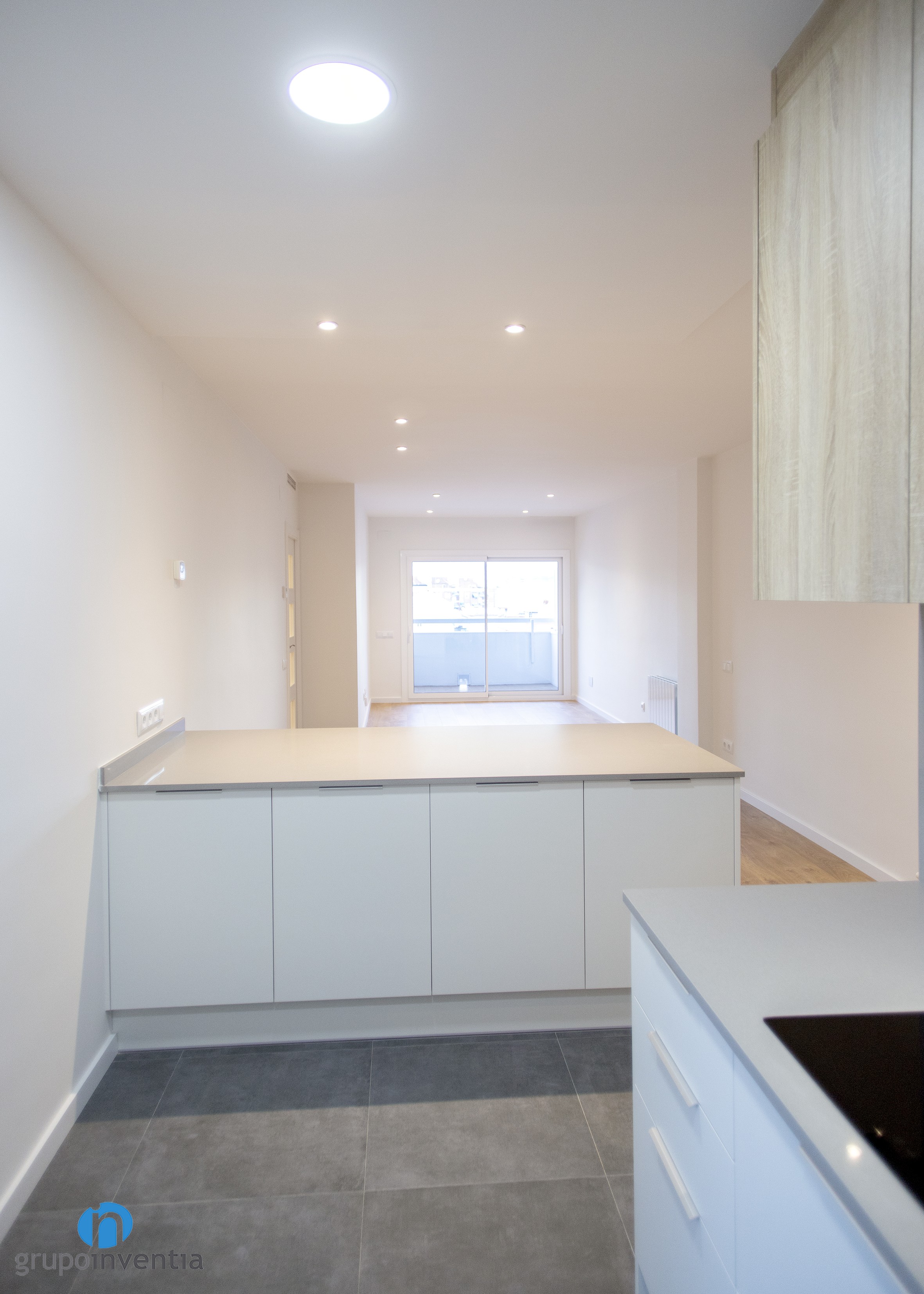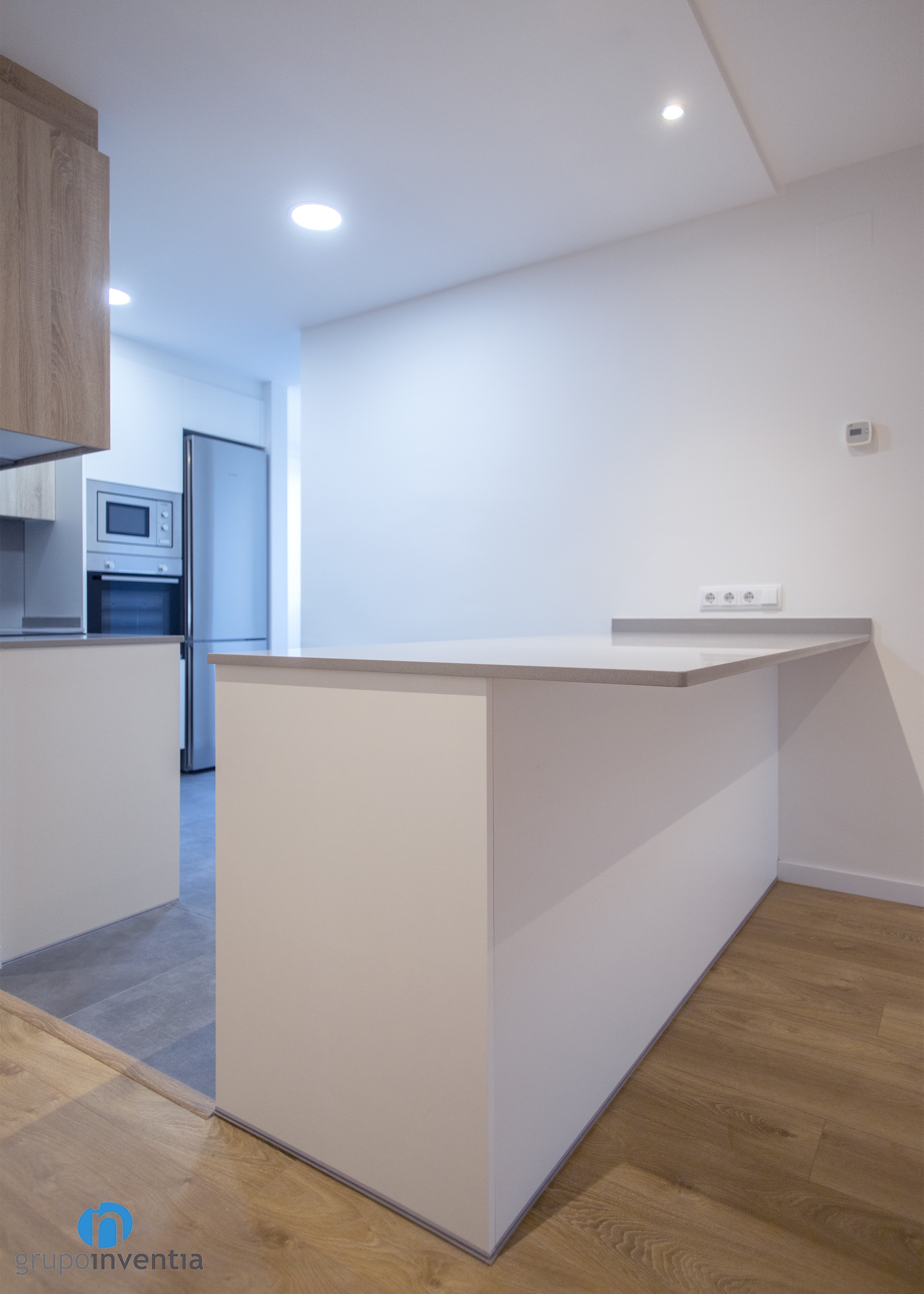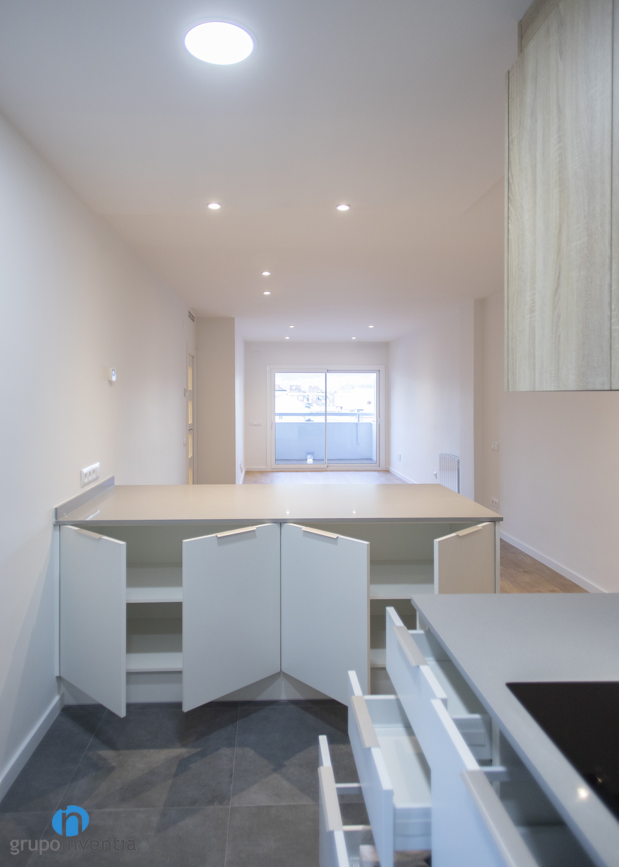 At Grupo Inventia we carried out a complete house renovation in Huelva street of Bracelona. Work was done to print a contemporary design in all its rooms. In addition, the spaces of the kitchen and the bathrooms were completely equipped.