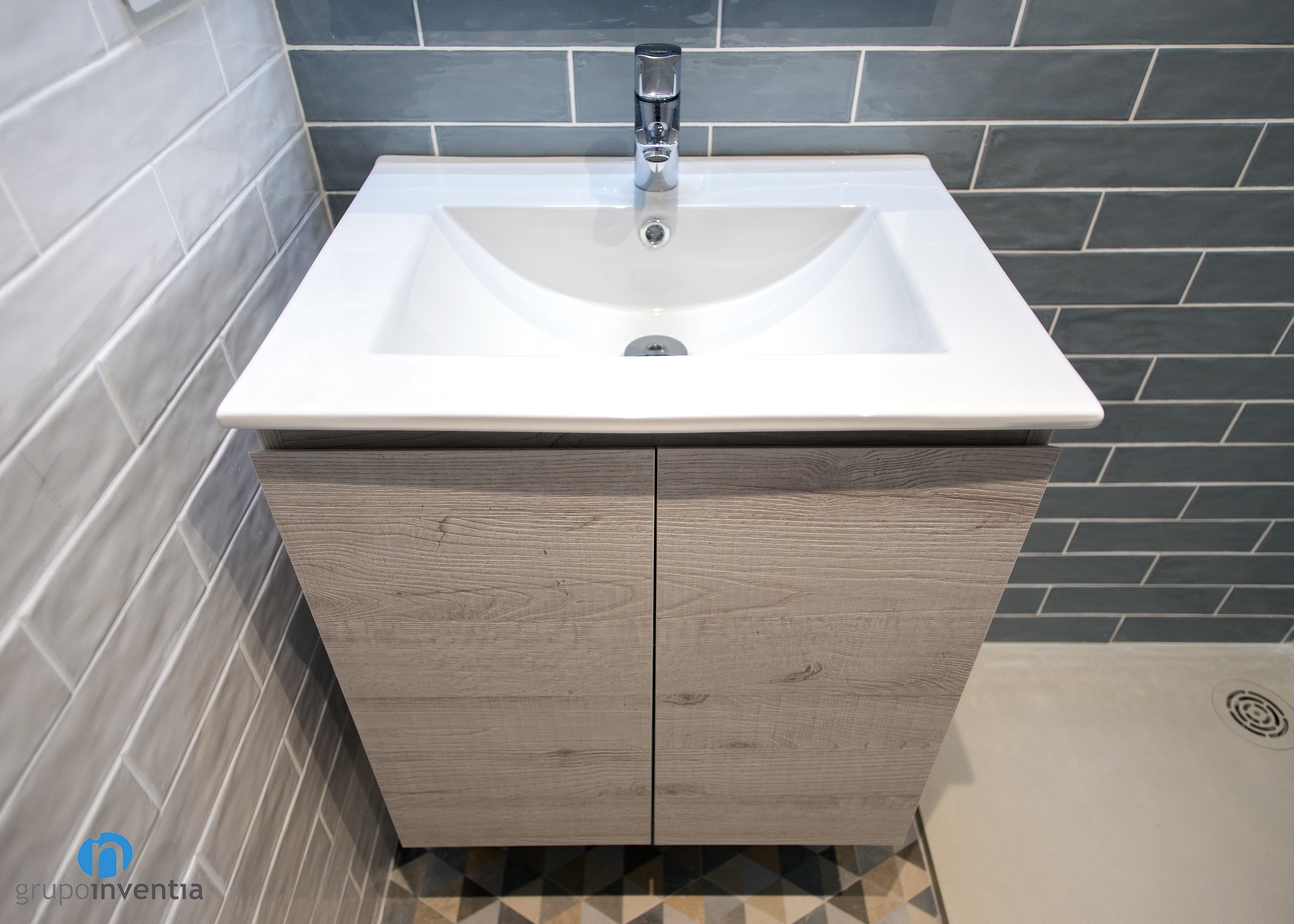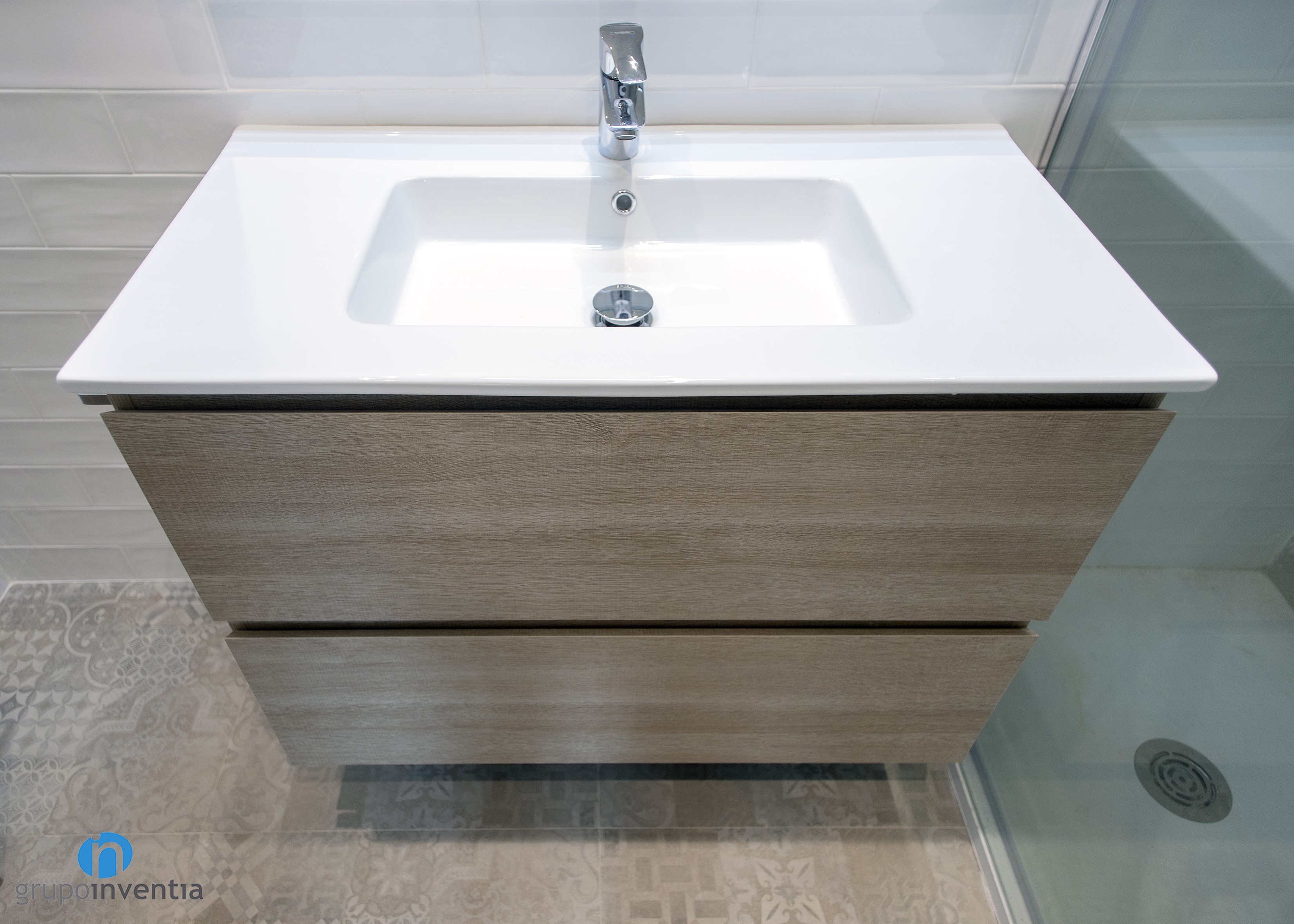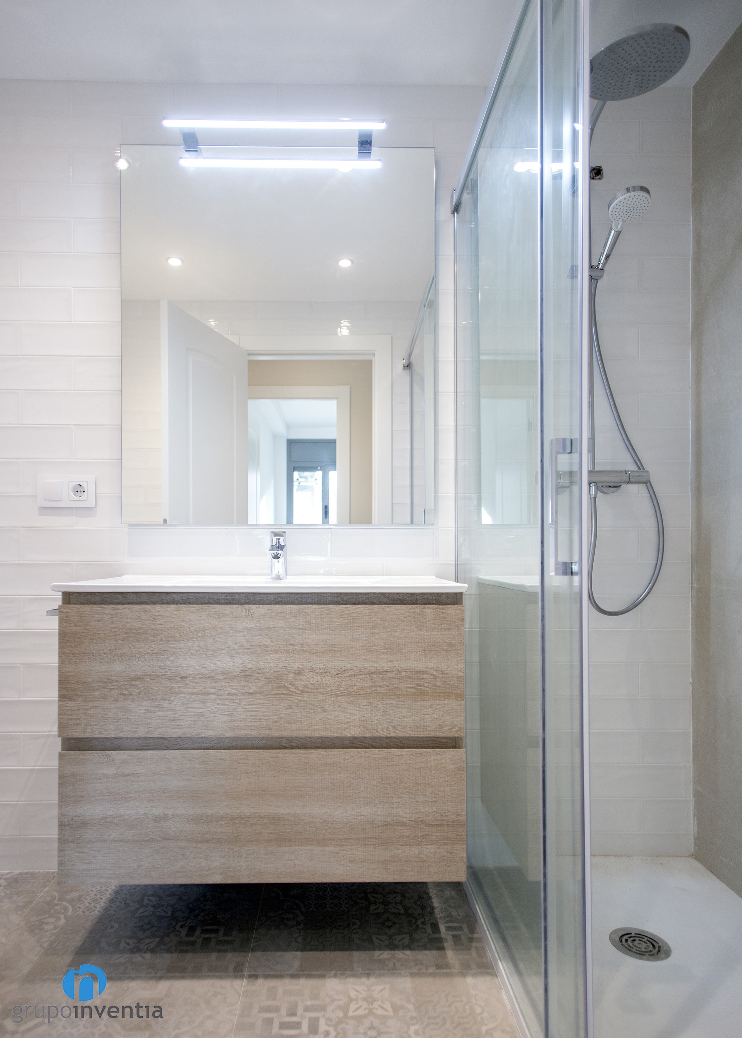 With regard to the interior design, in both cases, a total wall tiled was committed. In the main bathroom white tiles were used, as in courtesy, but with the difference that in this the wall of the sink was tiled with gray tiles. This is combined with a hydraulic flooring with which you get a fantastic image.