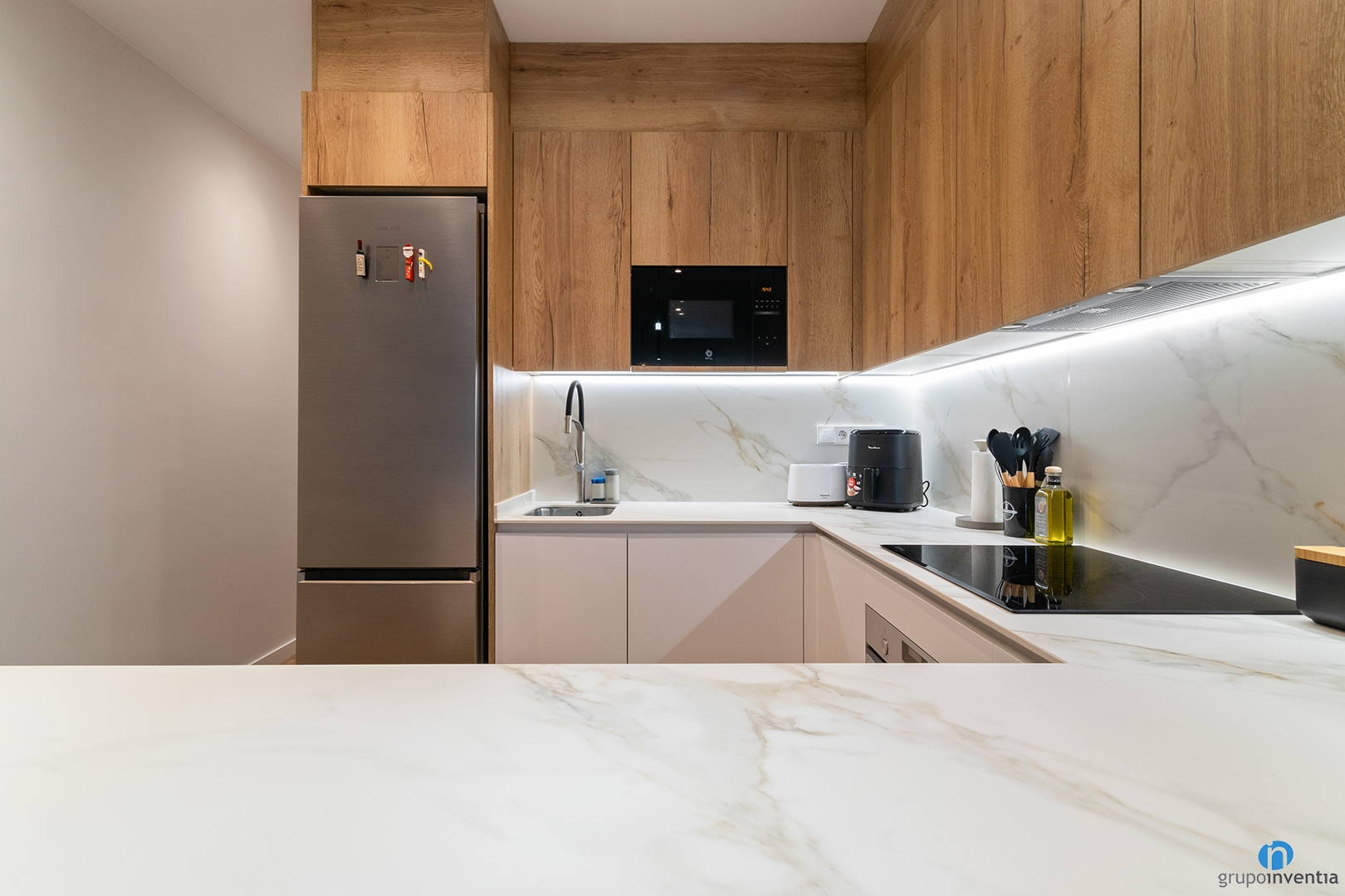 The kitchen is located just to the right of the entrance to the flat. This is an open kitchen renovation with a U-shaped layout. In addition to a kitchen design integrated into the rest of the flat, it is fully equipped.