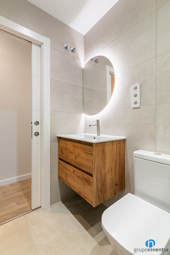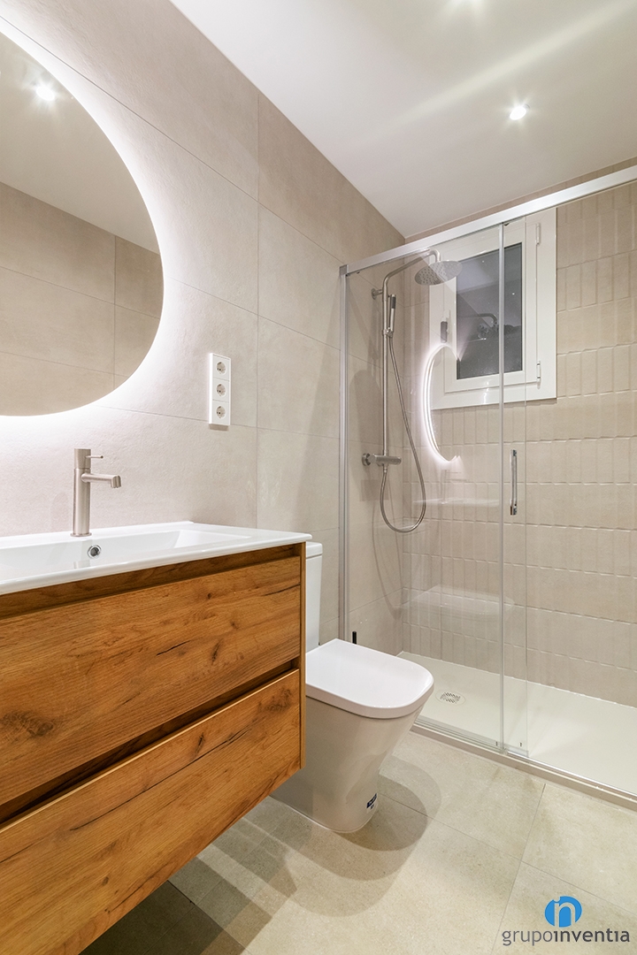 In this house renovation, we have also renovated the bathroom on this floor. It is a bright and pleasant space with neutral tones. We tiled the walls with beige tiles. In the new image of this bathroom there is room for wood finishes, such as the bathroom furniture.