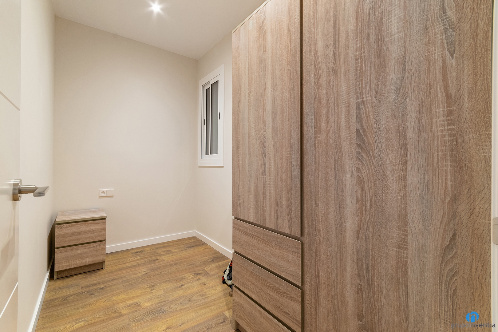 Another innovation that complements this new contemporary interior design is the flooring. We installed a parquet floor in natural wood tones. It is combined with the wooden furniture that we can see both in the rooms and in the kitchen cabinets. On the other hand, for the new doors we have chosen the color white.