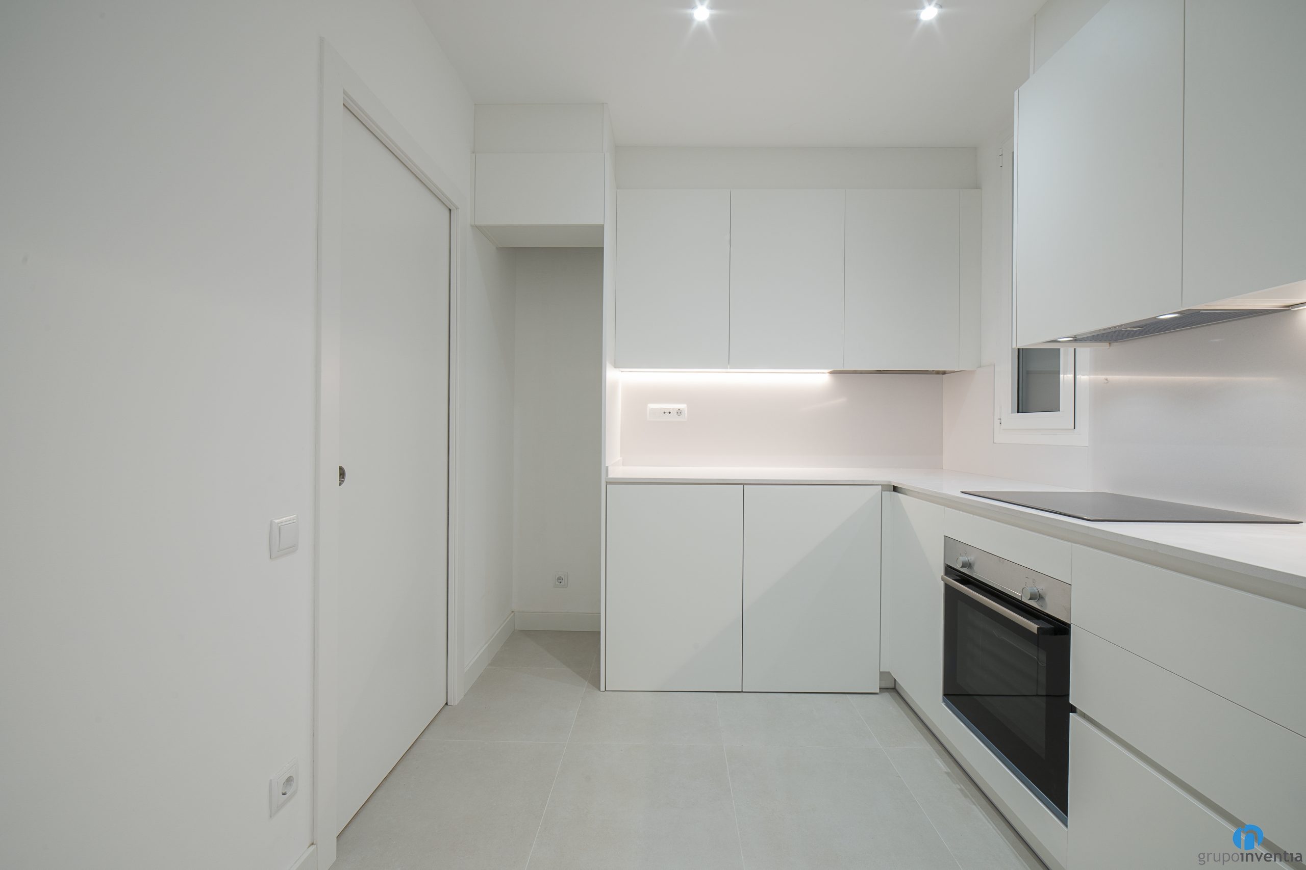 The image of the kitchen is similar to the rest of the house. Neutral tones predominate with the aim of generating a bright and casually spacious space. The panels of the kitchen furniture are smooth and white. A white worktop has also been installed and a gray tiled floor has been installed.