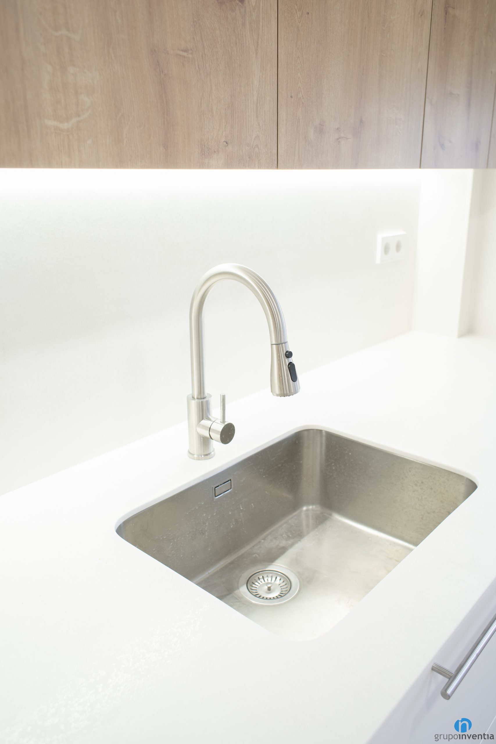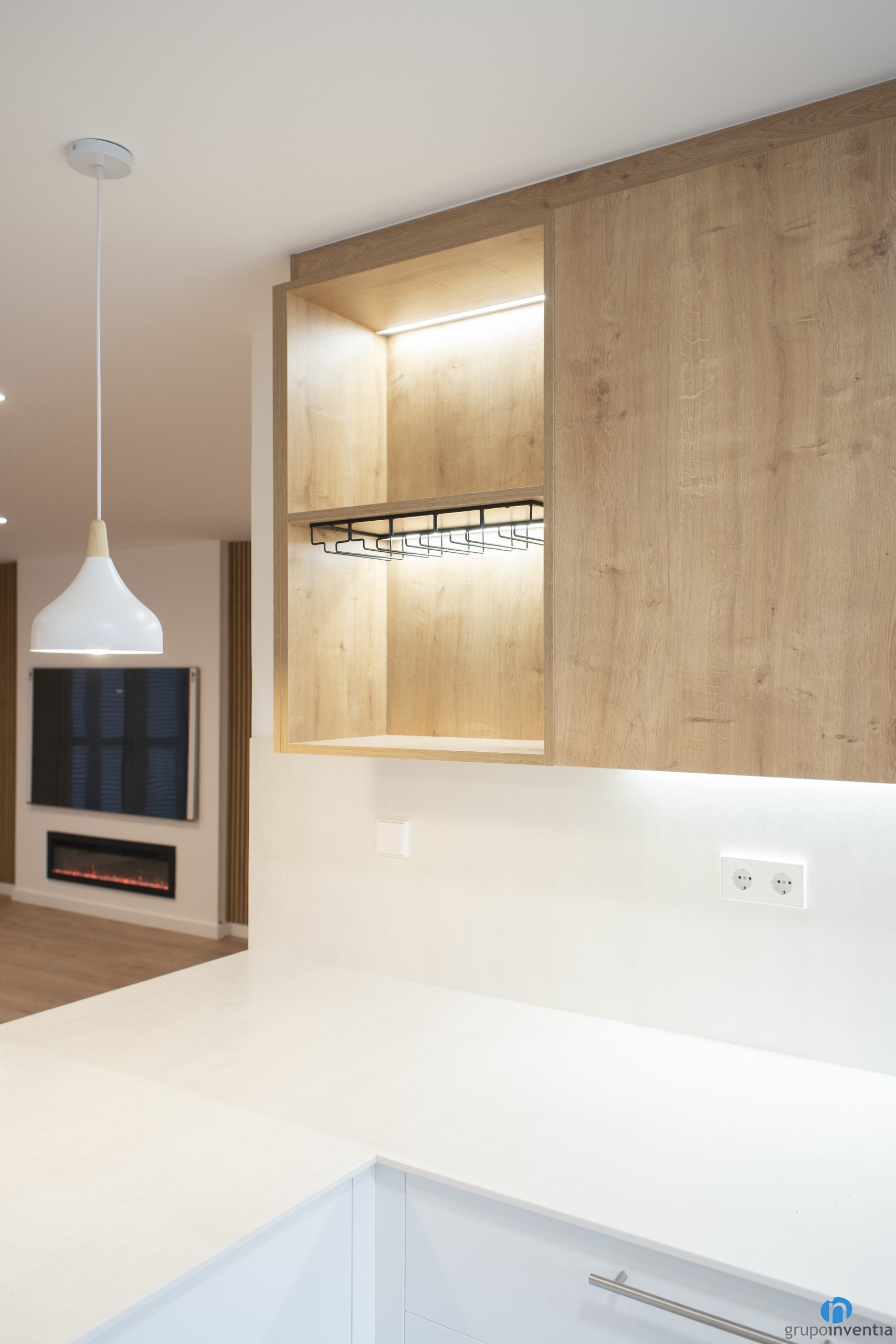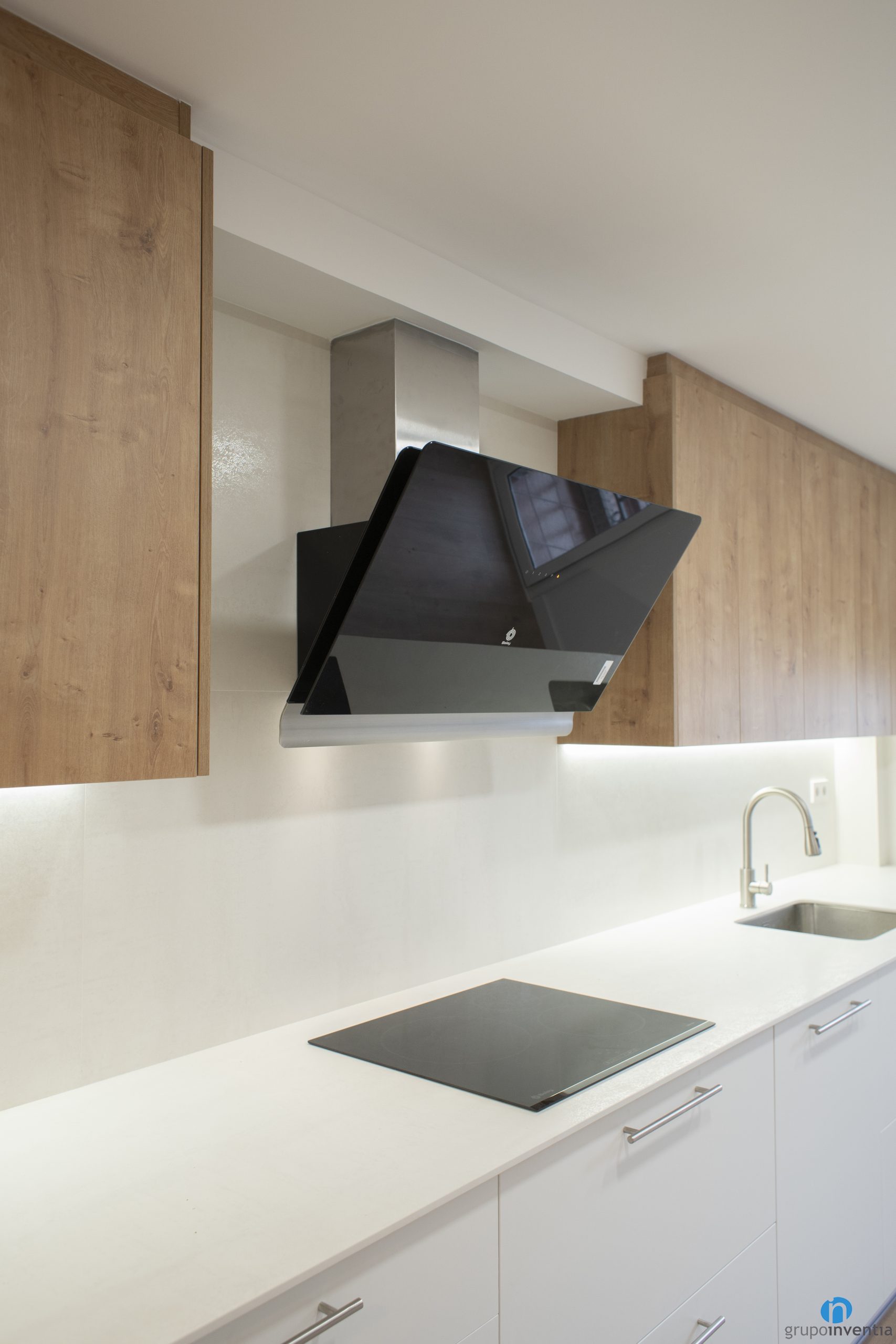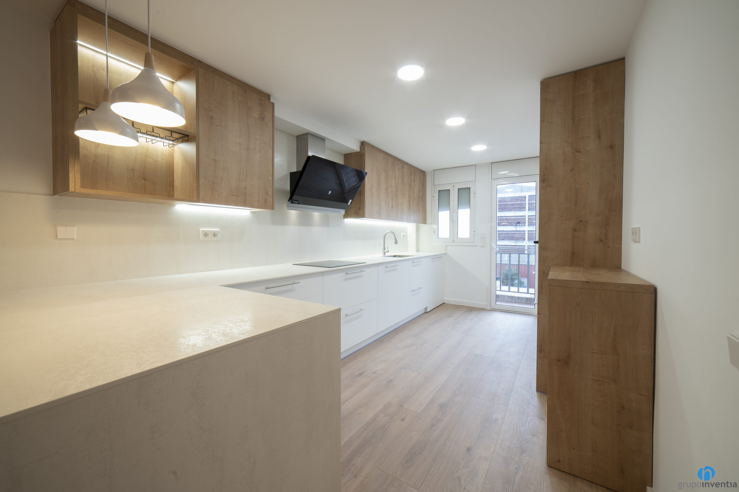 Another improvement in this kitchen renovation in Sant Adrià del Besòs is that we have expanded the storage capacity. It has white drawers and cabinets at the bottom of the counter. At the top we have anchored several cabinets with a wooden finish. It is a combination that is in trend in kitchen renovations.
