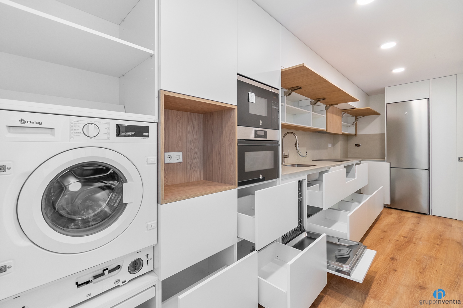 We integrated the washing machine and the dishwasher into the lower cabinets. Both stay hidden behind the cabinet doors. The oven and microwave are also built into the column. The fridge is perfectly fitted into the kitchen unit.