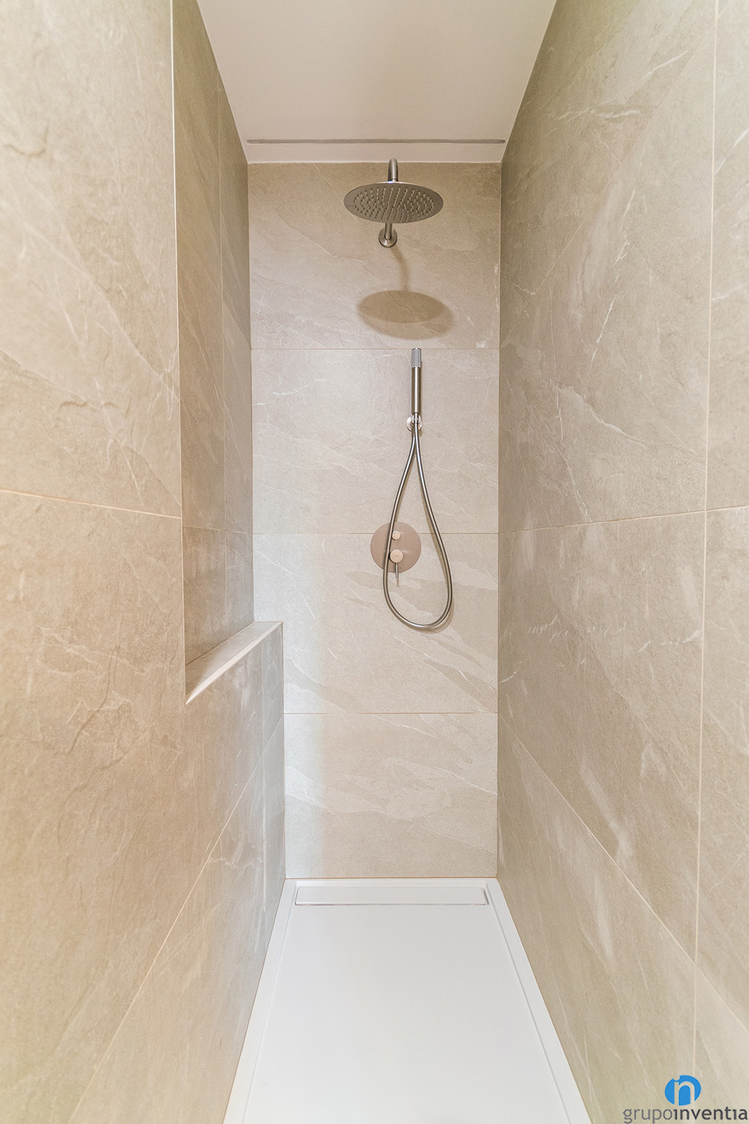 The bathroom has been fully renovated. All walls are tiled with beige ceramic tiles. This finish creates a warm and balanced atmosphere. It also adds a modern and calm look.
