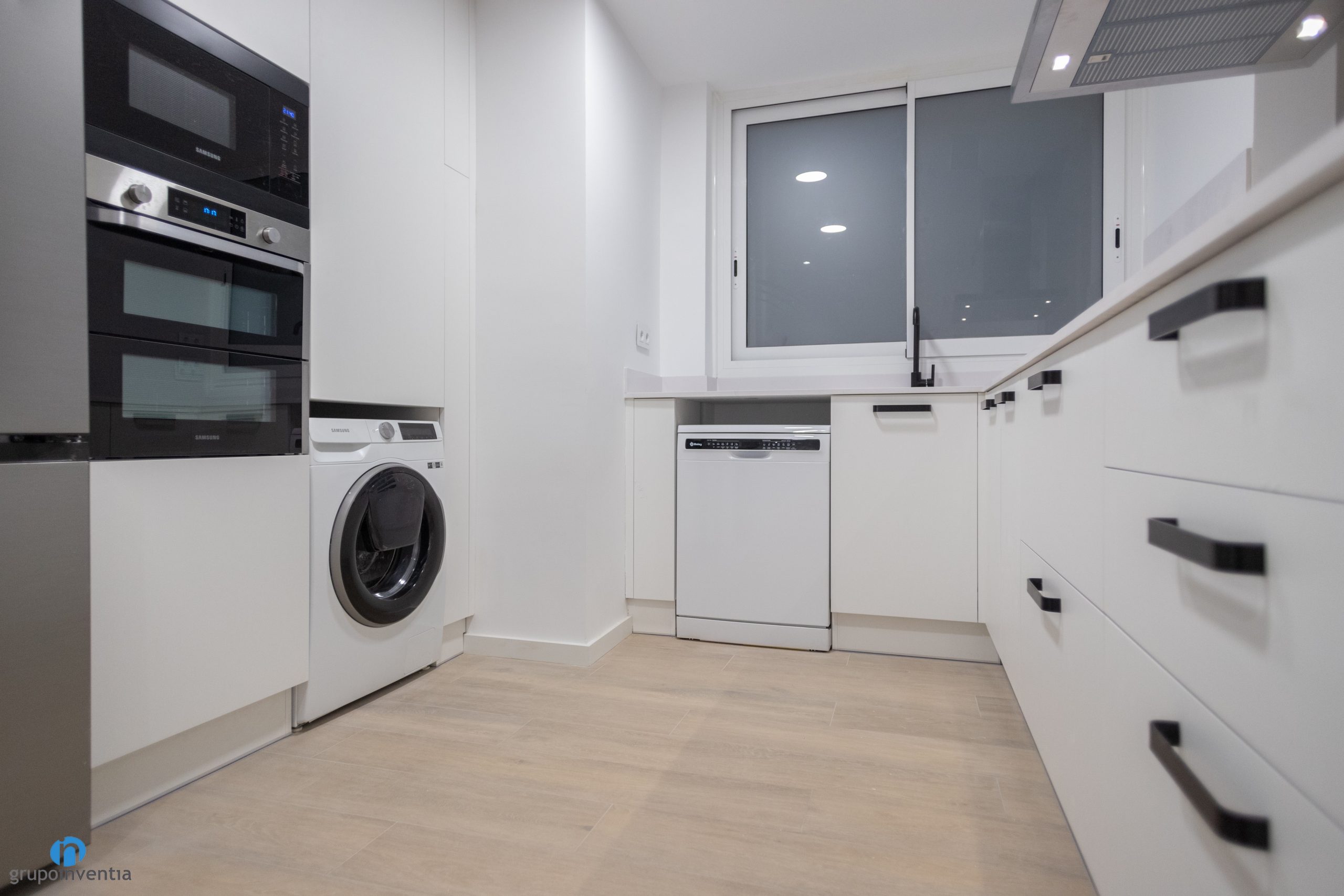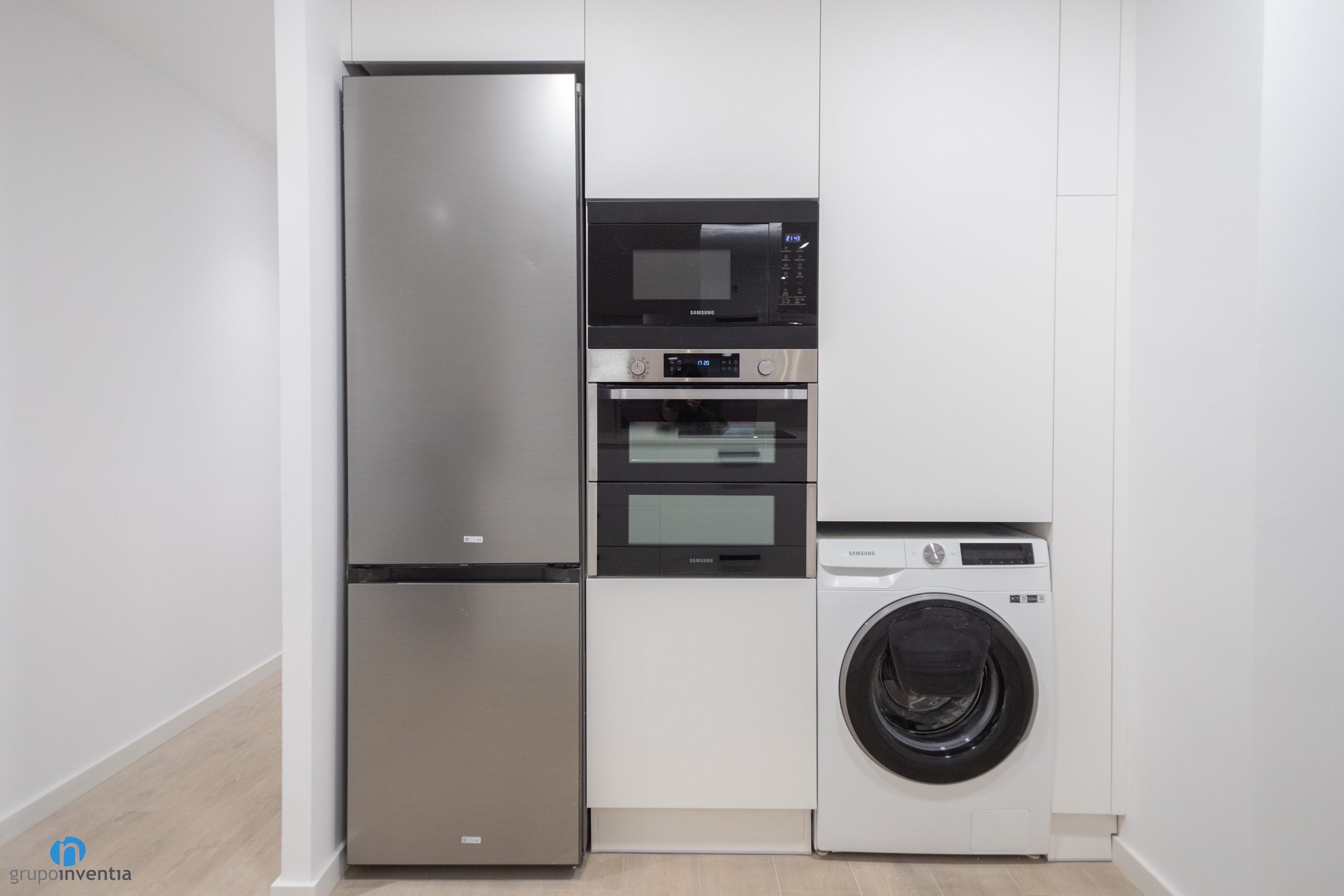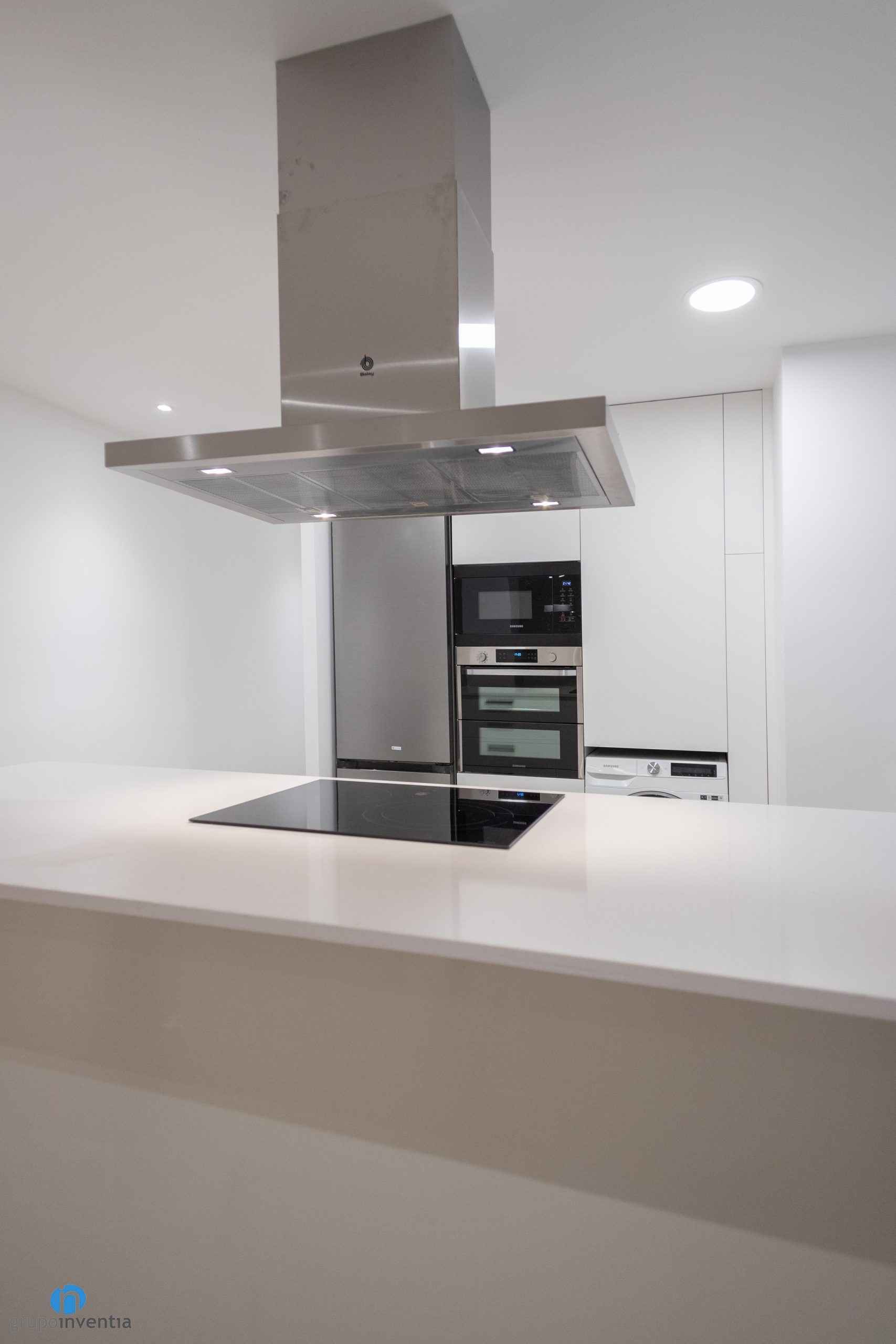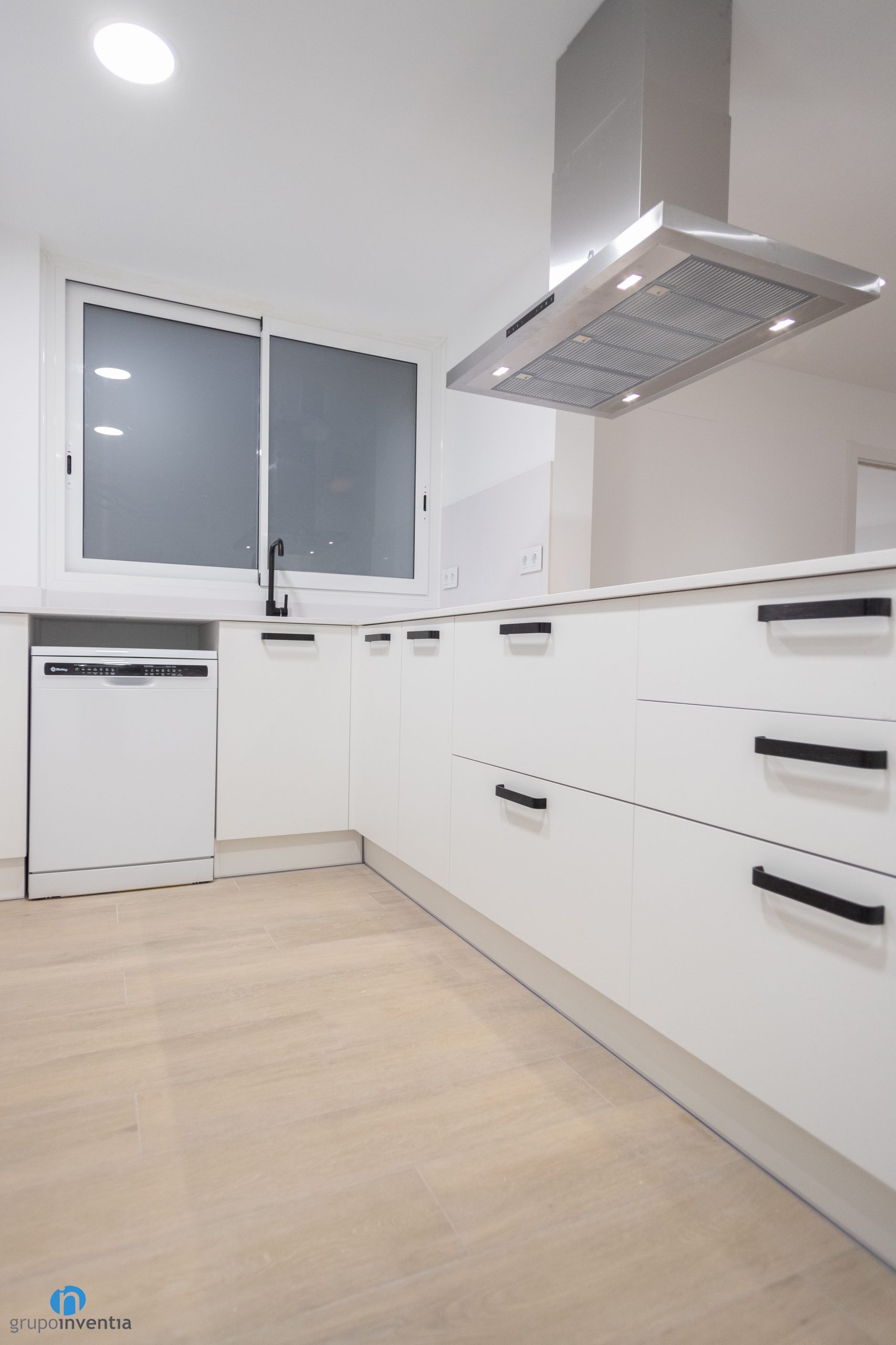 The kitchen also has a built-in slot to integrate the washing machine and dishwasher. In the same way that it has two countertops that provide a large support and work surface. They have been fitted with a single sink and a modern ceramic hob. Another improvement over this kitchen renovation is that it has storage capacity at the bottom of the countertops.