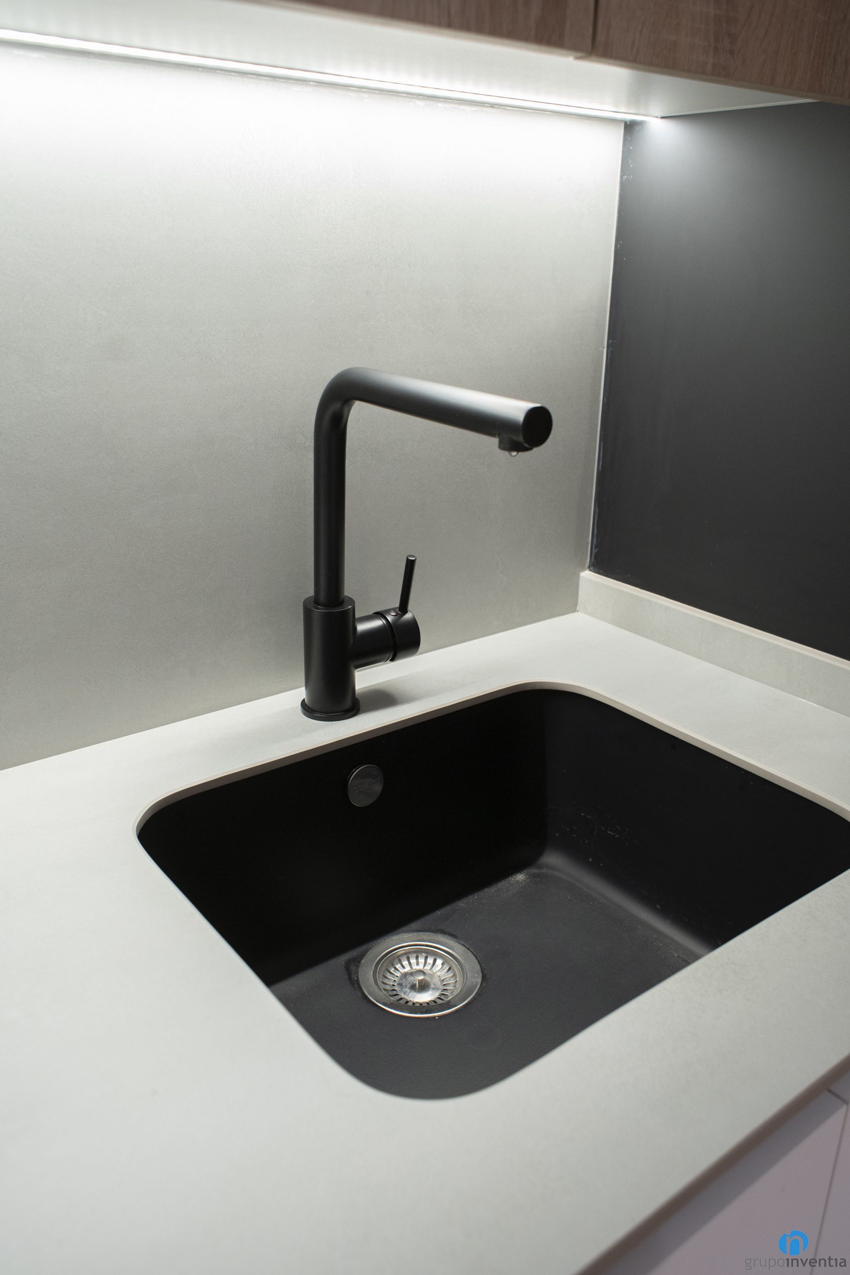 The linear kitchen unit has a worktop equipped with a cooking plate and a single-bowl sink. Both in the lower and upper part it has drawers and cupboards that expand the kitchen storage. At the ends we have integrated the new appliances. To the left is the oven and microwave, both with a black finish, and to the right is the fridge. We have also integrated a dishwasher in the lower kitchen unit.