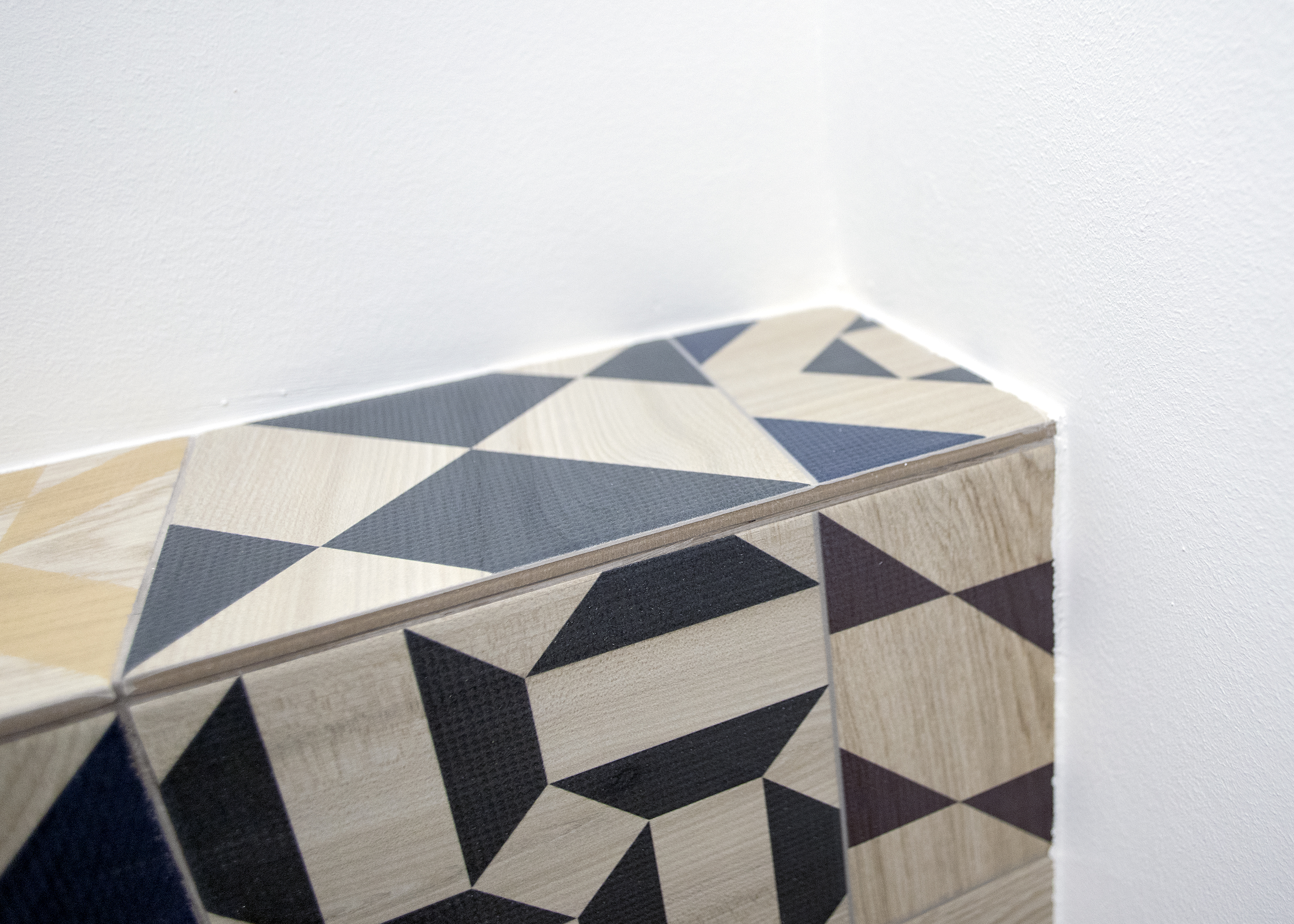 At the far right, custom-made hollow gates were installed to fit the refrigerator, oven and microwave. Next there is a section of counter that will house the sink, just below the window that leads to the outside. The counter tans to the left and gives way to a second section that will have a ceramic hob and storage plate both lower and higher. Already on the left side a breakfast bar was placed.