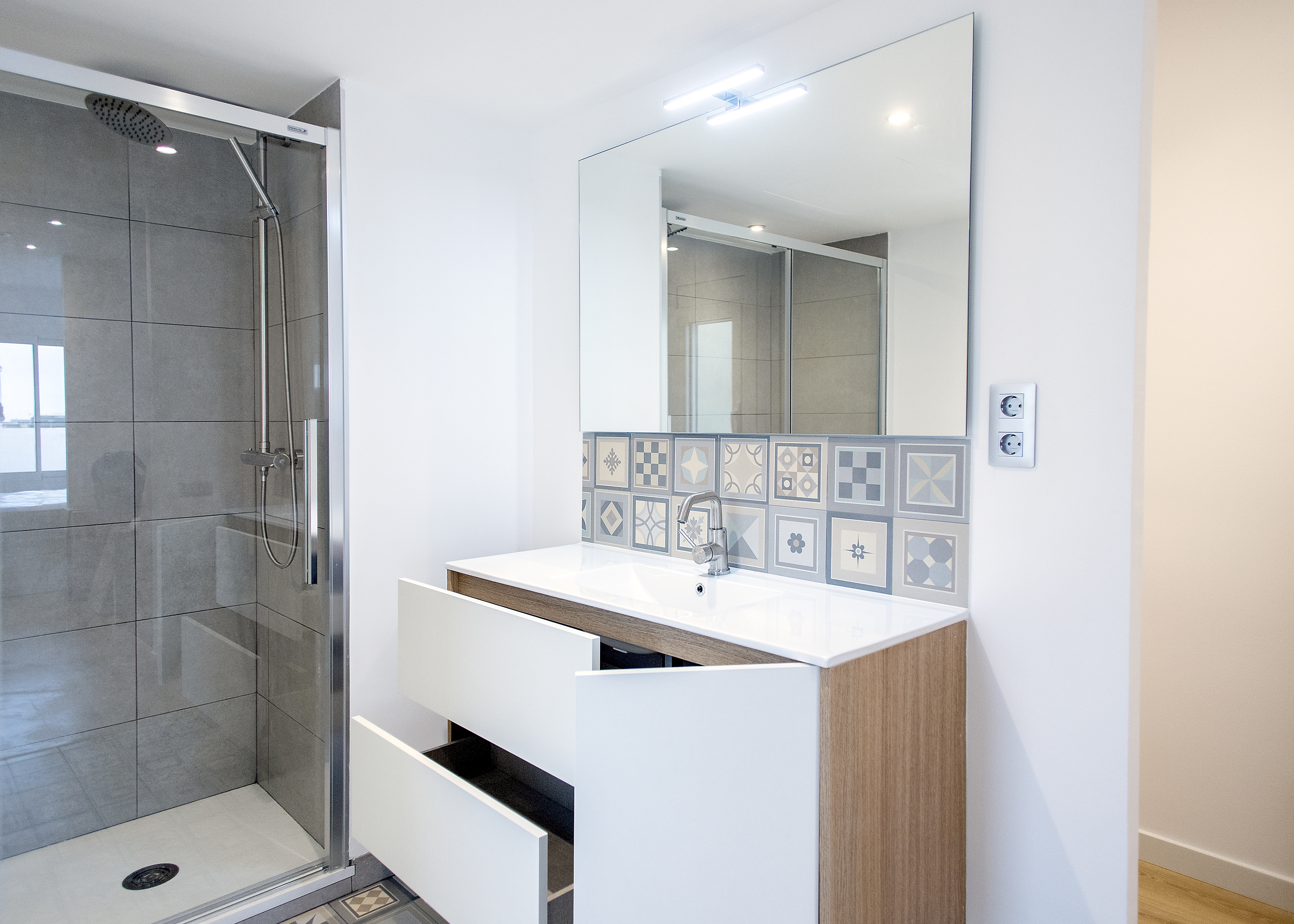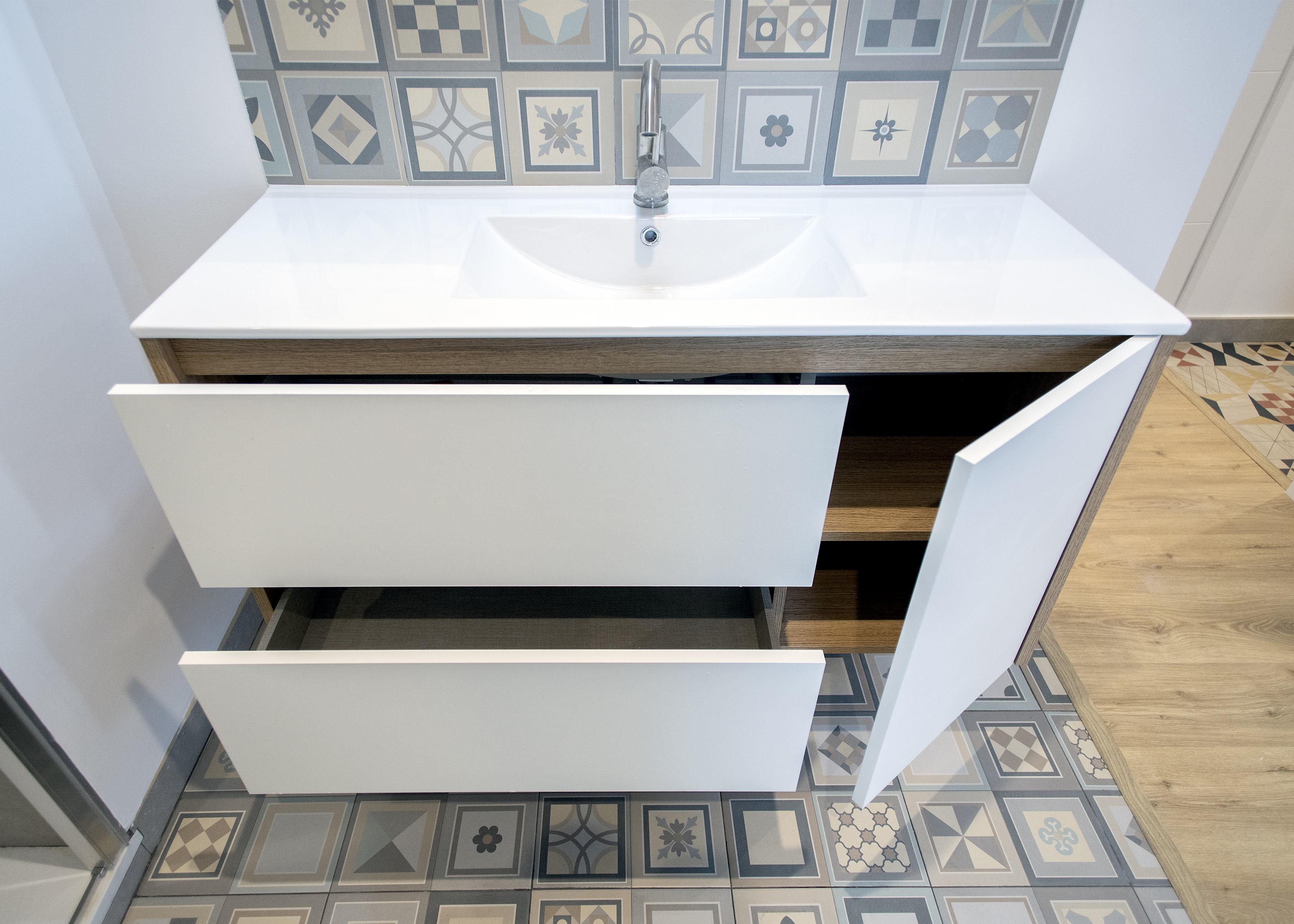 The bathroom renovation involved a complete renovation with regard to the sanitary equipment of the room, being divided into two spaces. In one of them there is the new toilet suspended, while the other installed a sink with built-in storage furniture and a large shower protected by transparent sliding door screens.