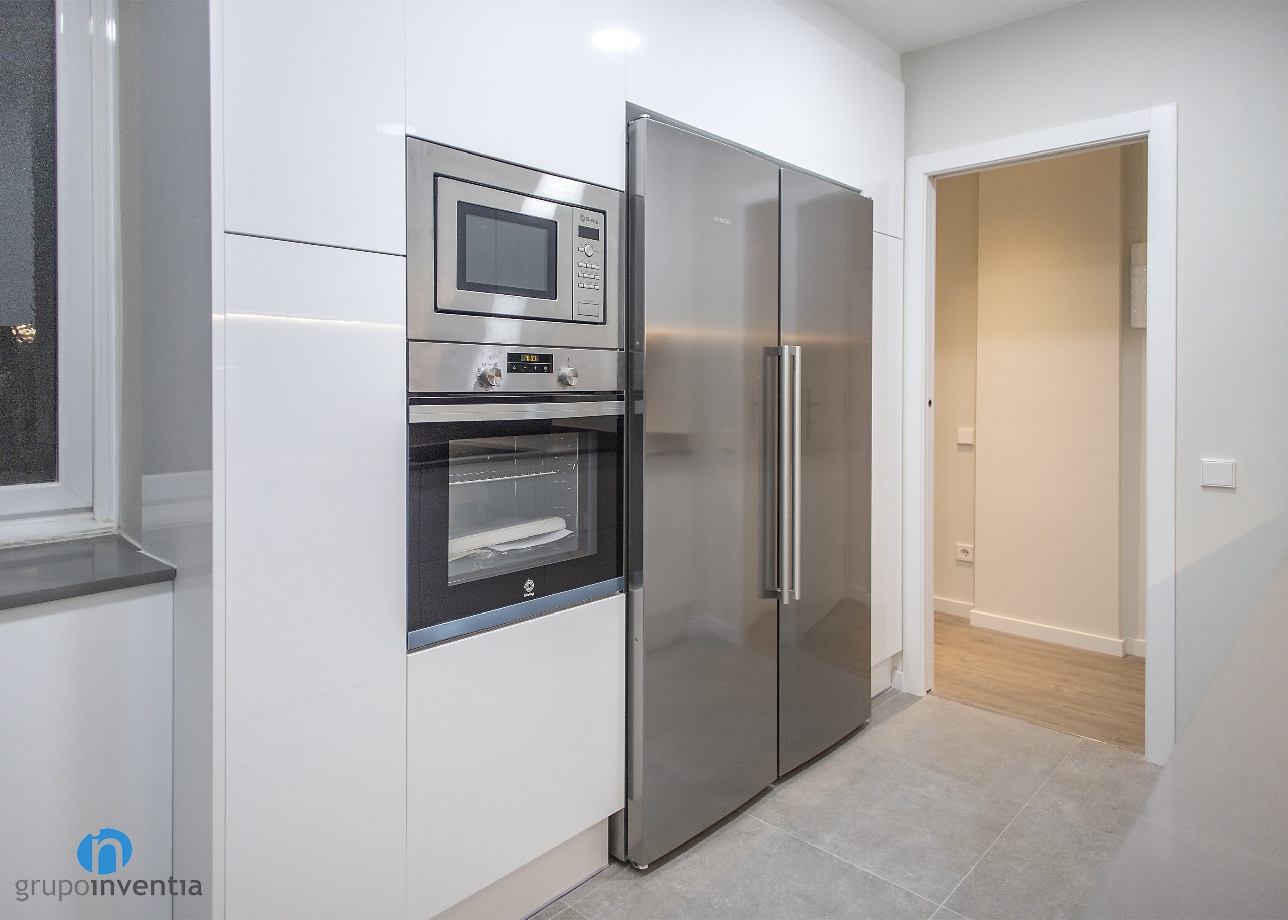 The kitchen is located in a separate room with a large surface area. Due to its characteristics, a kitchen layout on two fronts has been opted for, the best provision for a wide range of mobility when using the new equipment. To the right of the entrance you will find the appliances, consisting of a double door fridge, oven and microwave.