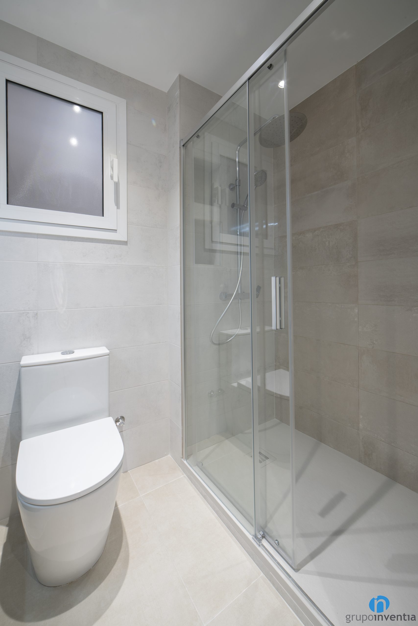 These are two toilet spaces that complement each other very well, since they can be used at all times. Each one has a sink with lower storage unit and also a toilet. In the case of the bathroom we have also fixed the water area, a shower with sliding screens.