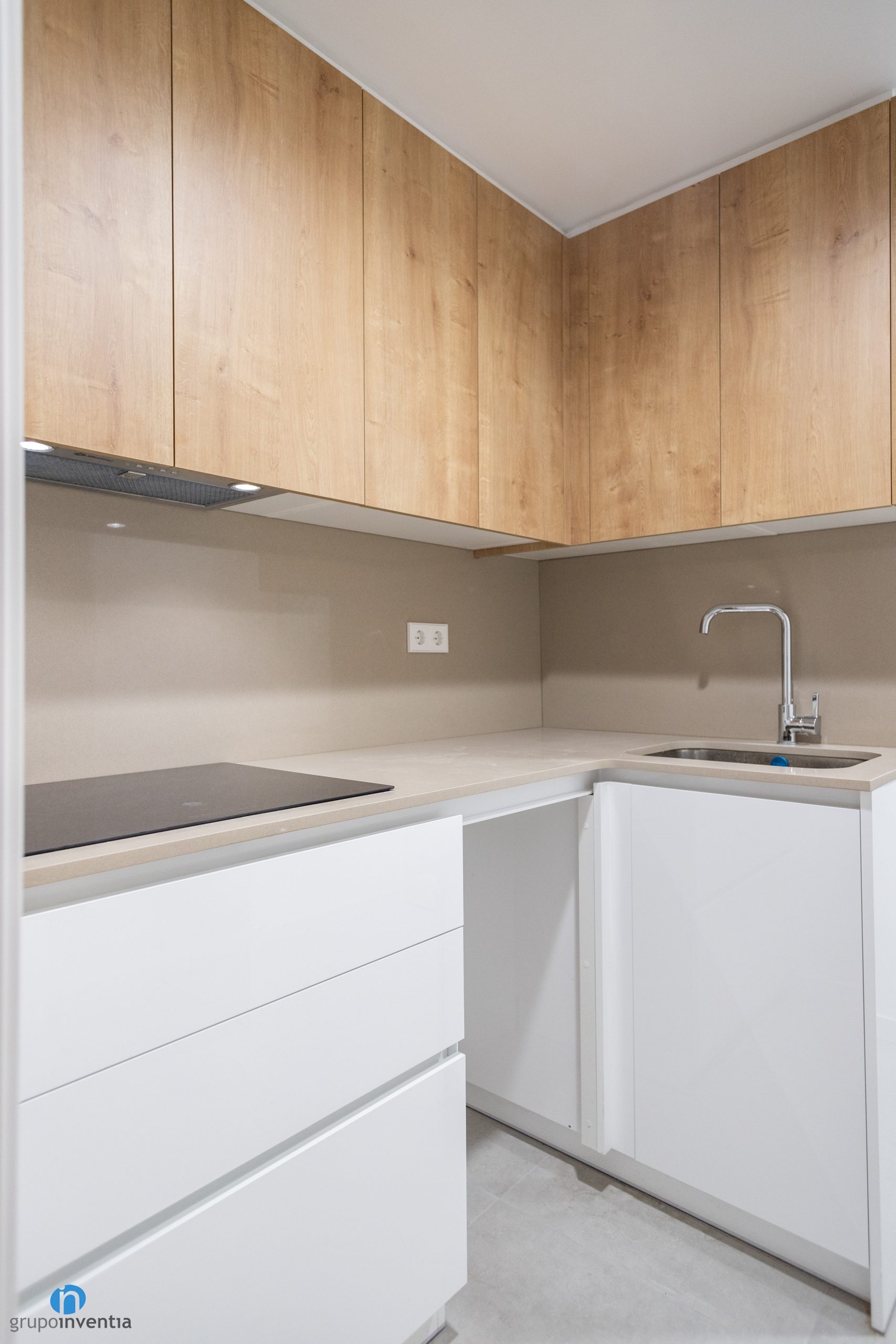 Another improvement over the original condition of this kitchen is the expansion of storage capacity. Now at both the bottom and top of the countertops there are drawers and cabinets so that everything is well organized. Following the decorative line of the house has also opted for neutral tones. This comprehensive kitchen renovation combines colors such as white, beige and wood finish.