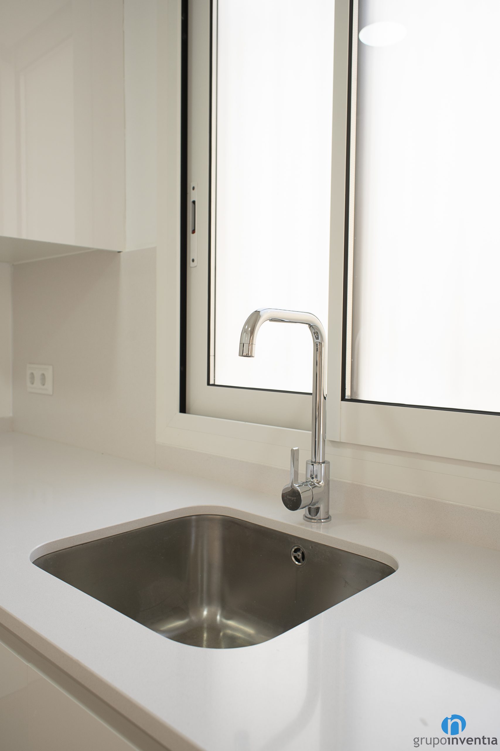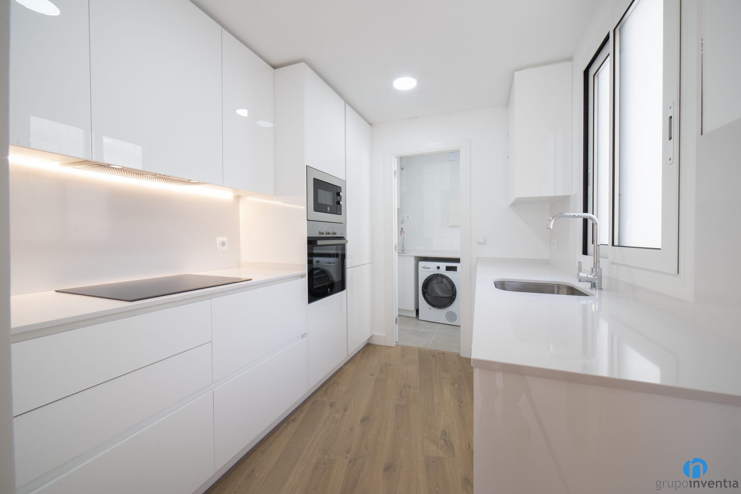 On the right side of the kitchen there is another worktop. It expands and offers a large support and work area. In turn, it is equipped with a single sink. This kitchen renovation has an attached room that functions as a gallery. We have placed the new washing machine and dryer there.