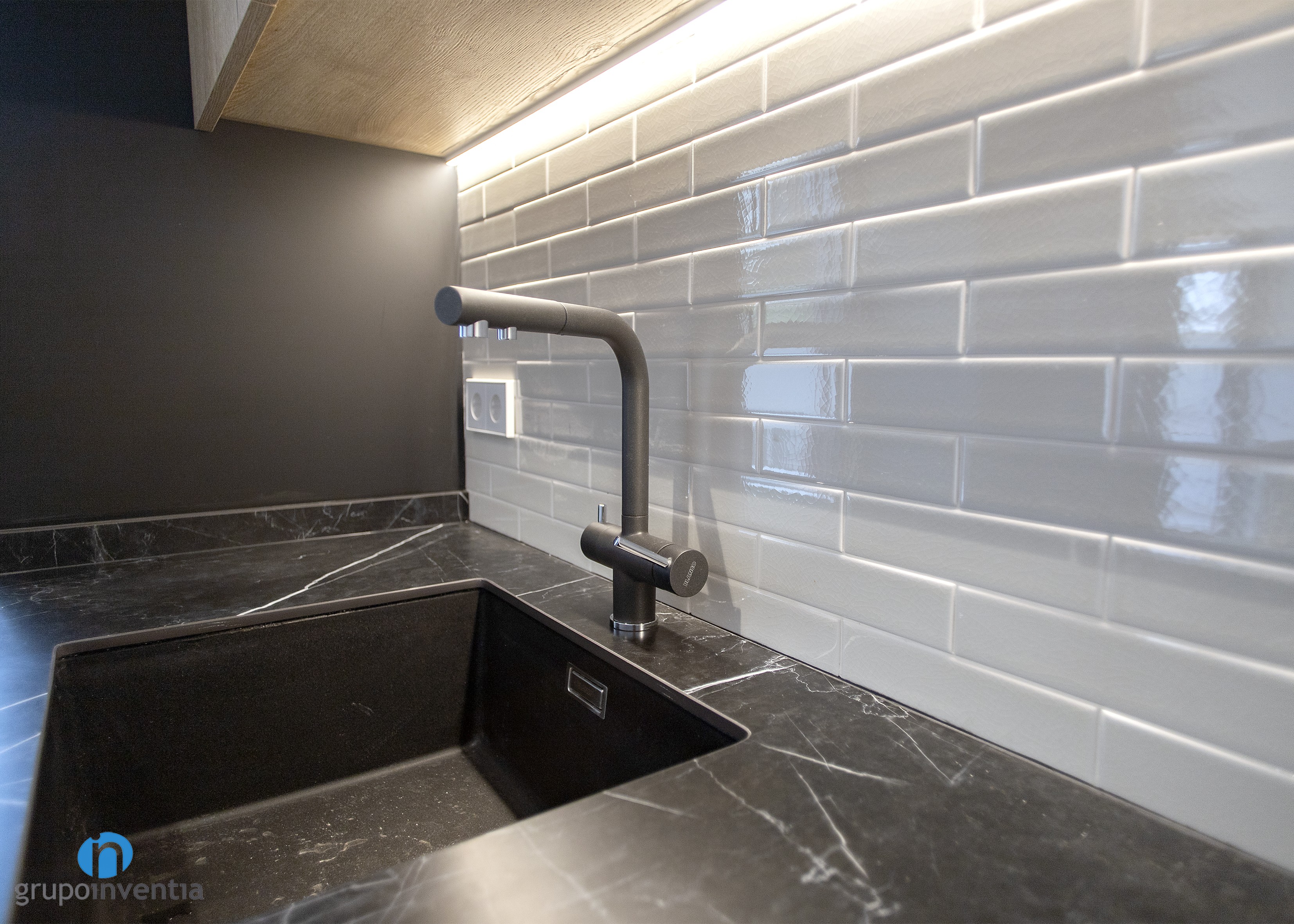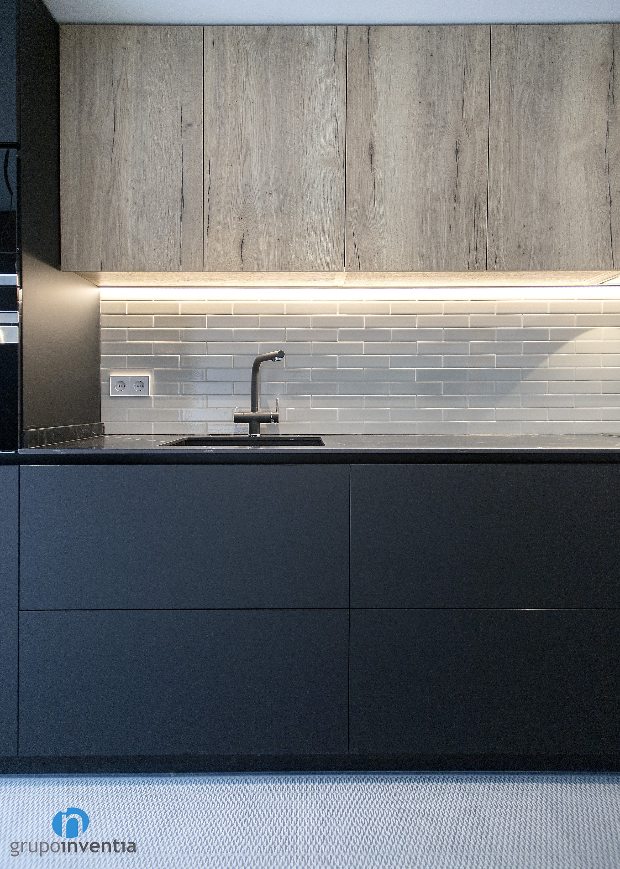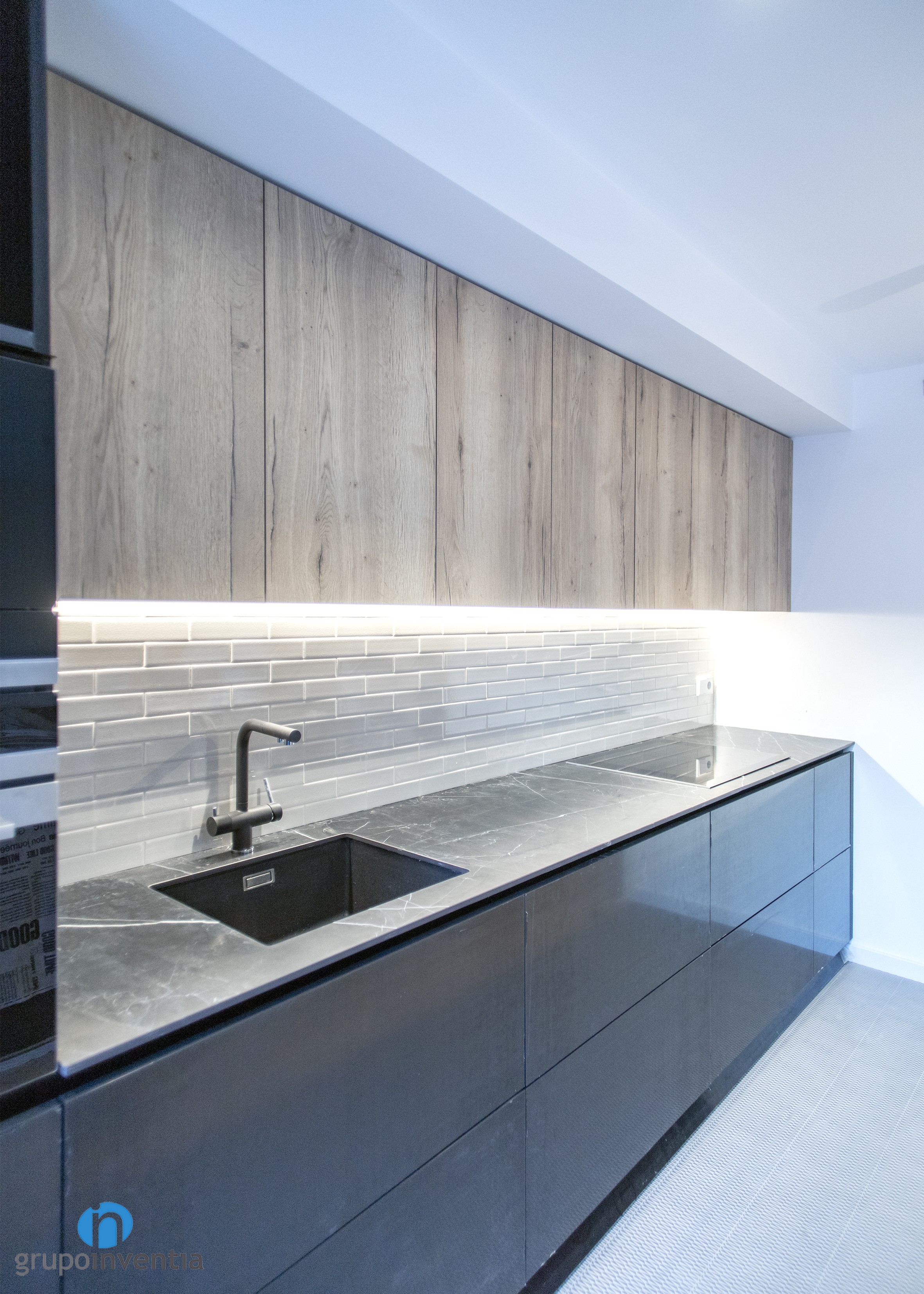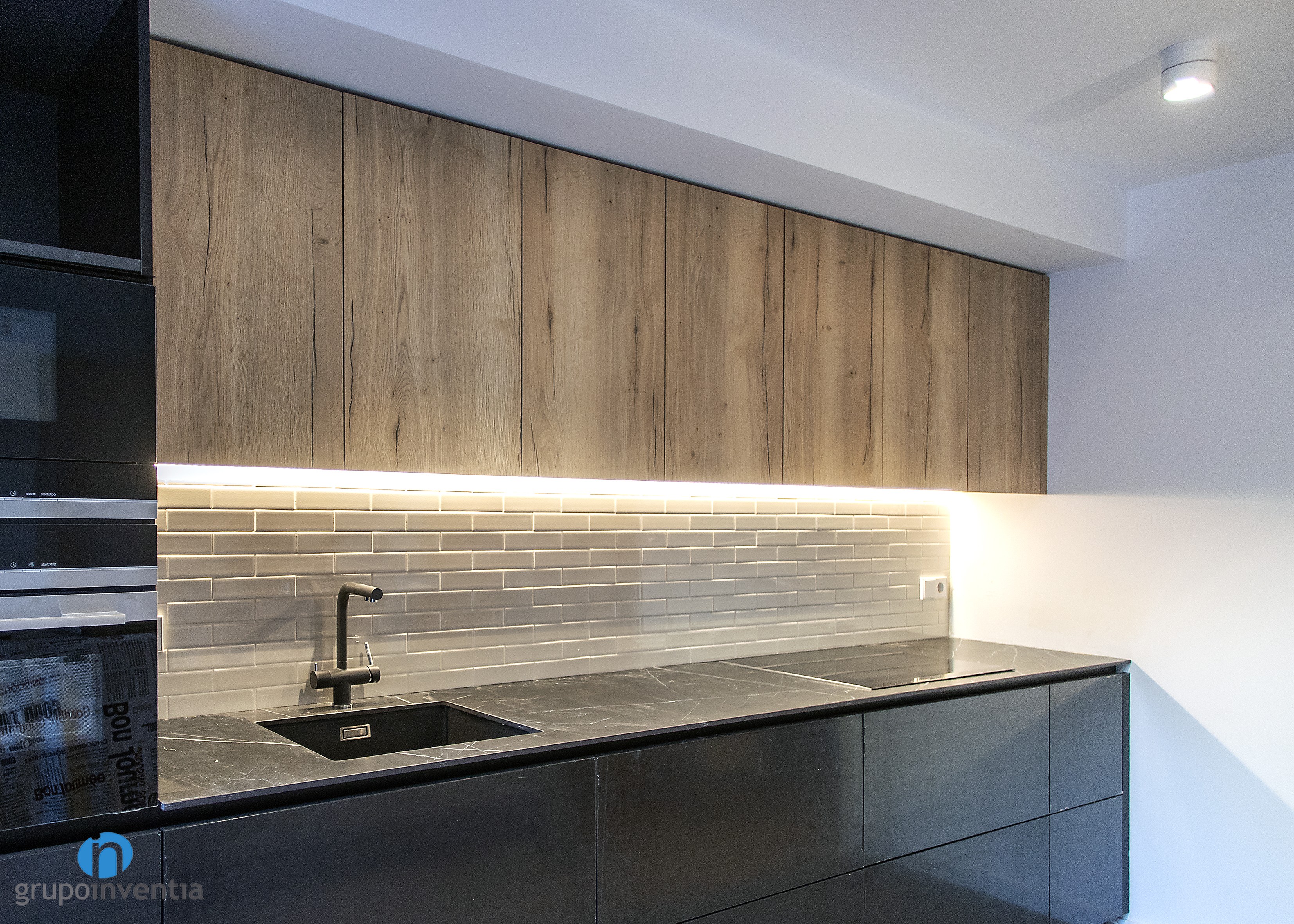 It is an open kitchen and distributed in a linear fashion. Without a doubt, it was possible to take full advantage of available space and generate a correct mobility when using any of the elements installed in this kitchen renovation. A black kitchen furniture and wooden finish was used, while its tiled panel with bevelled tile gives it a lot of personality.