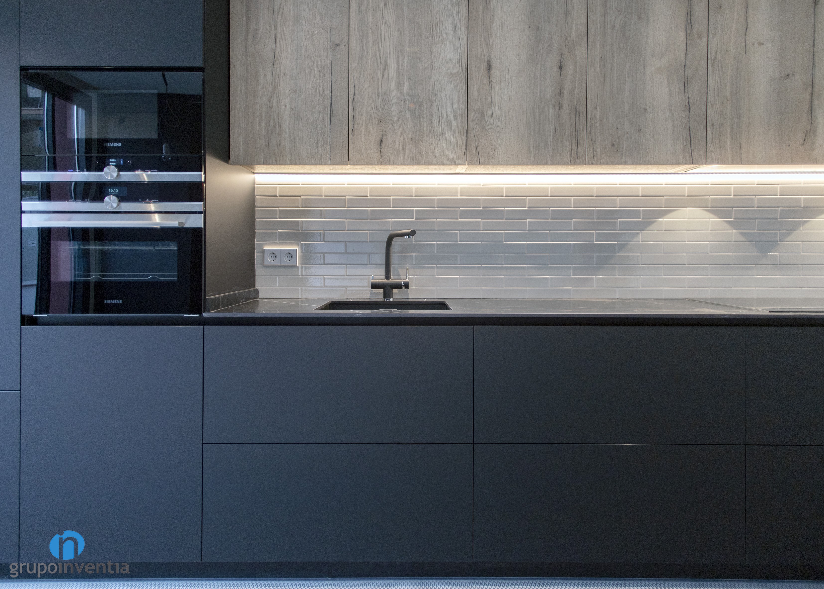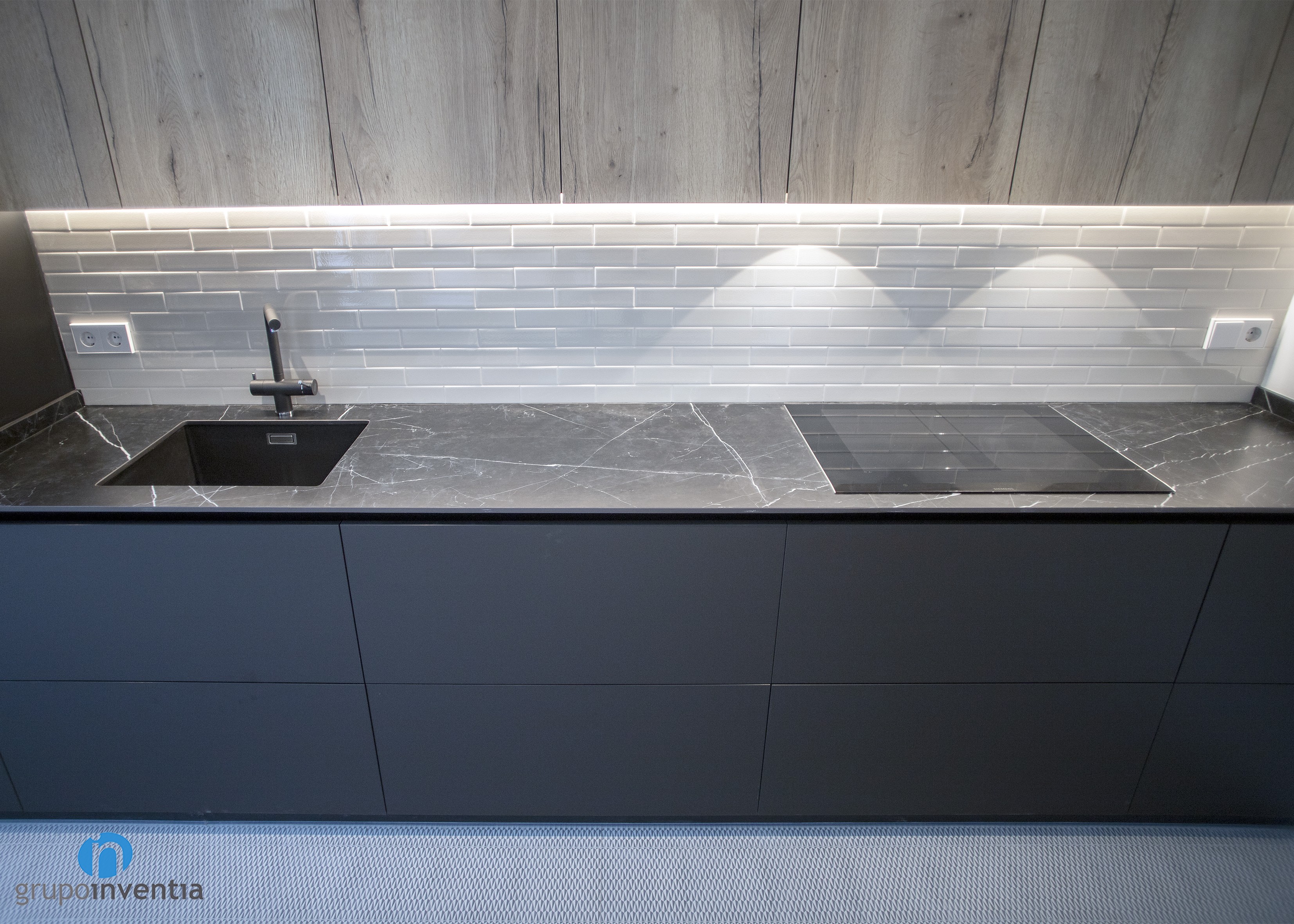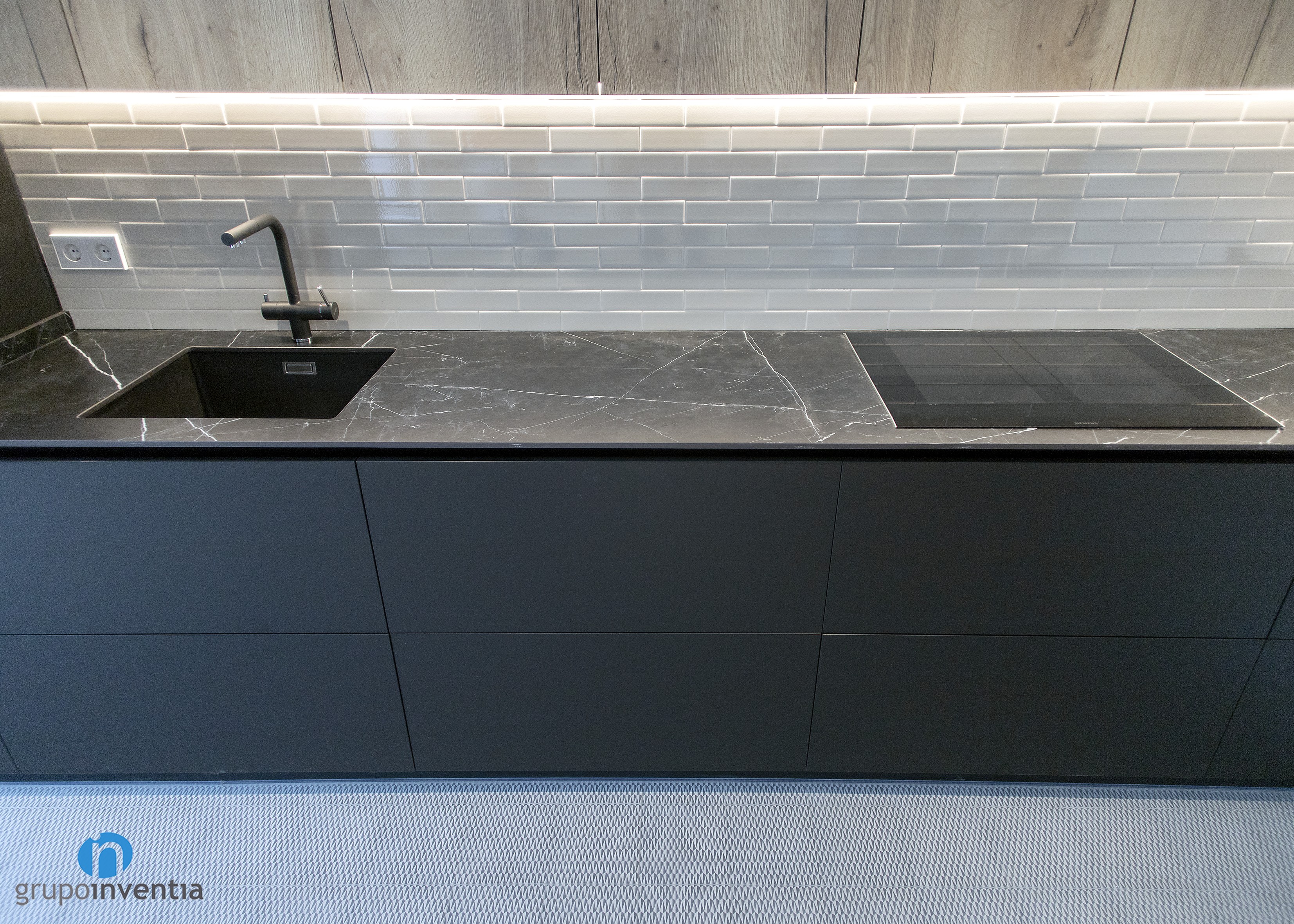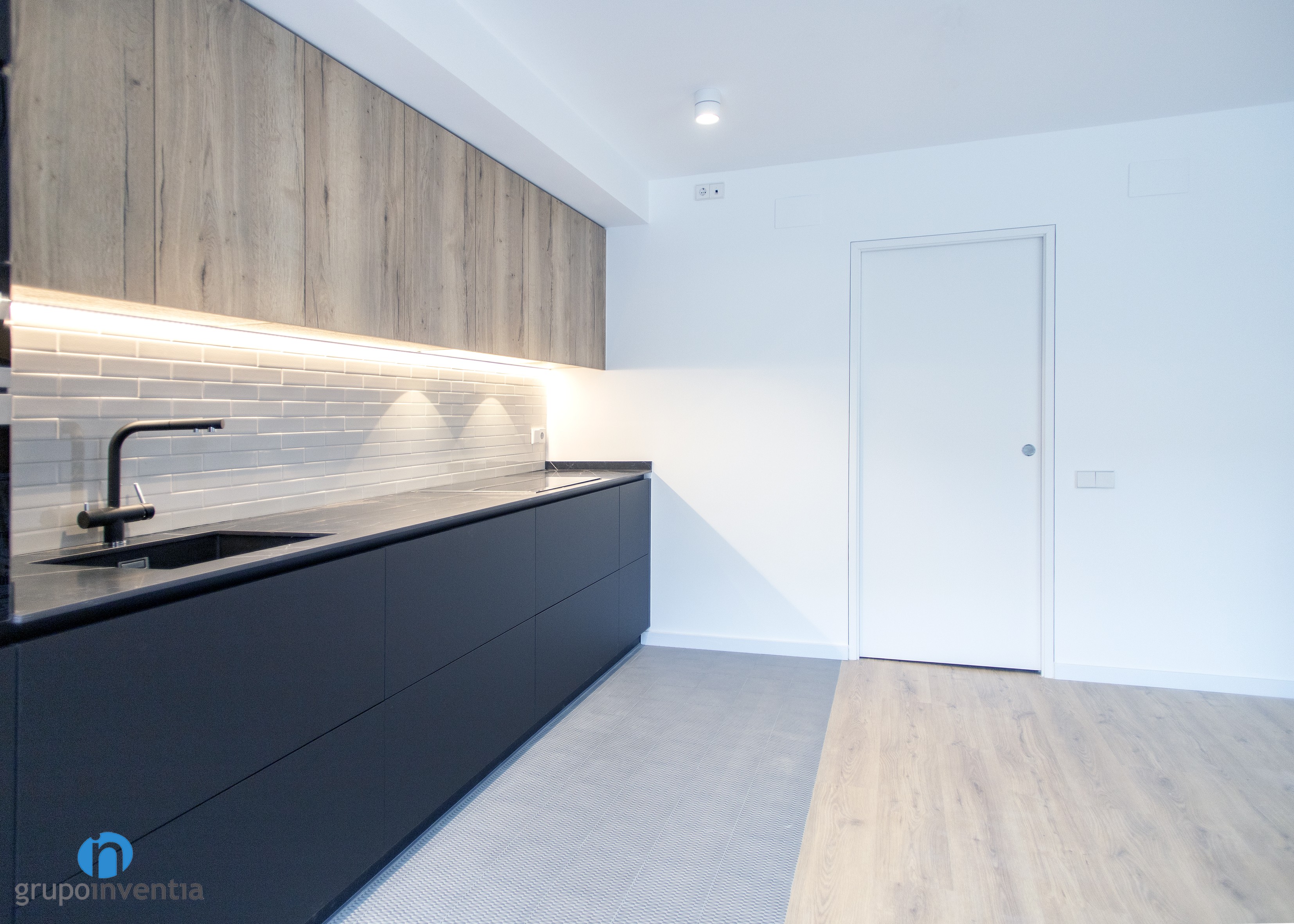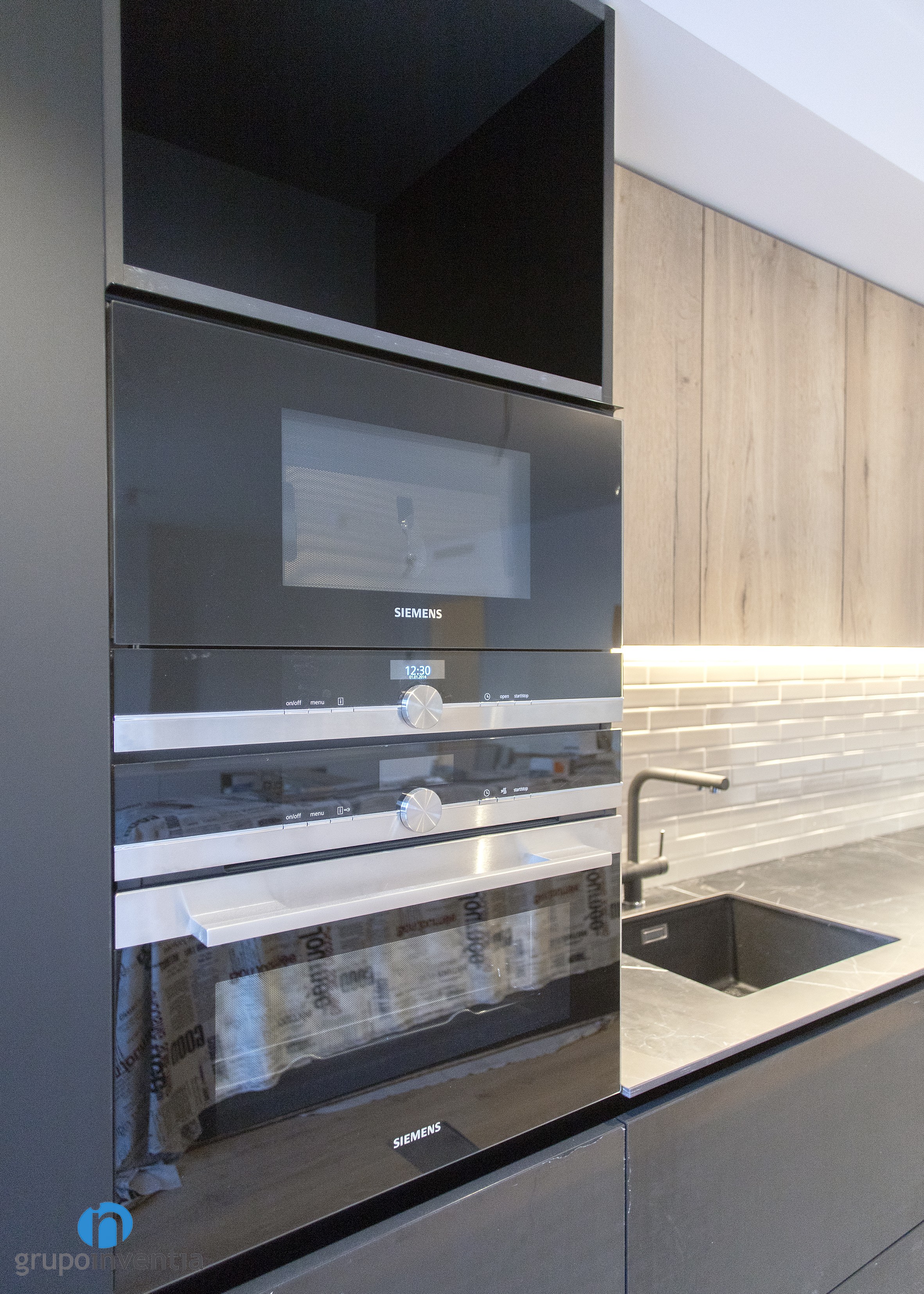 It is an open kitchen and distributed in a linear fashion. Without a doubt, it was possible to take full advantage of available space and generate a correct mobility when using any of the elements installed in this kitchen renovation. A black kitchen furniture and wooden finish was used, while its tiled panel with bevelled tile gives it a lot of personality.