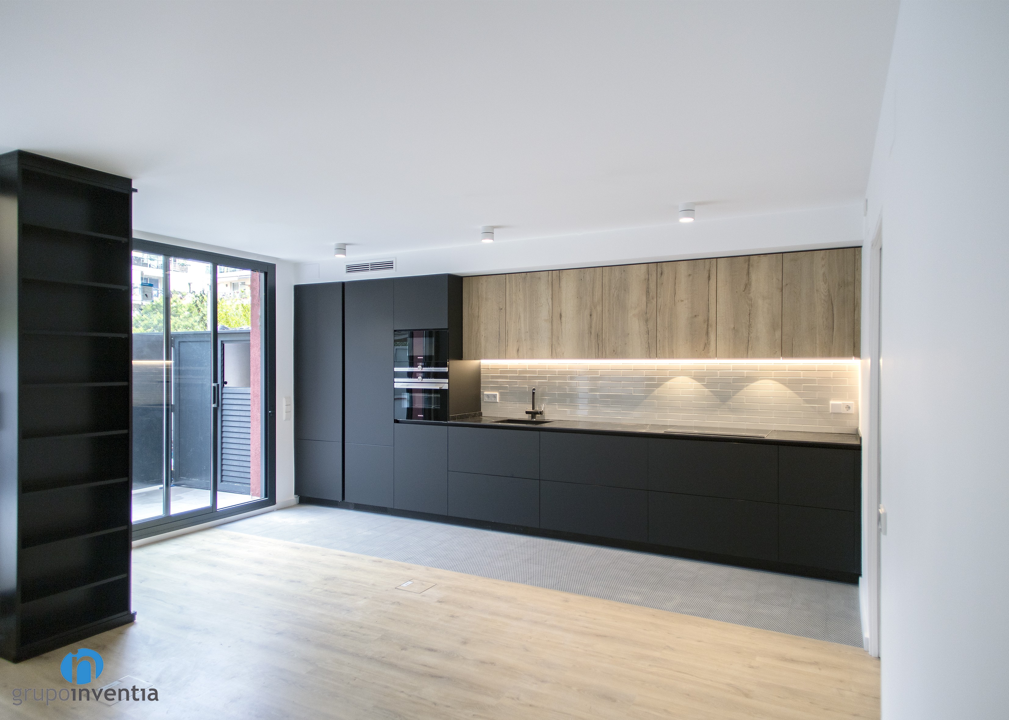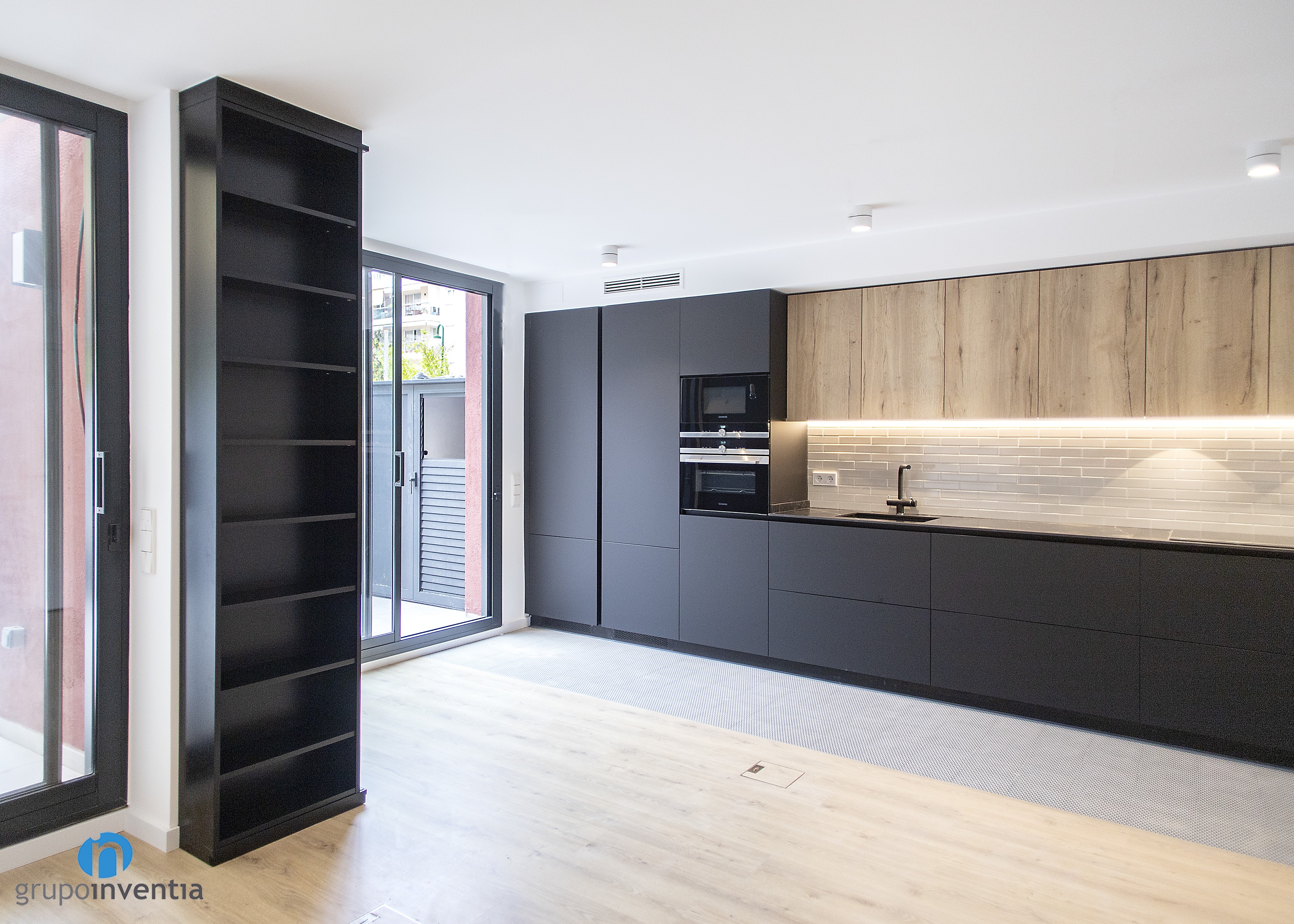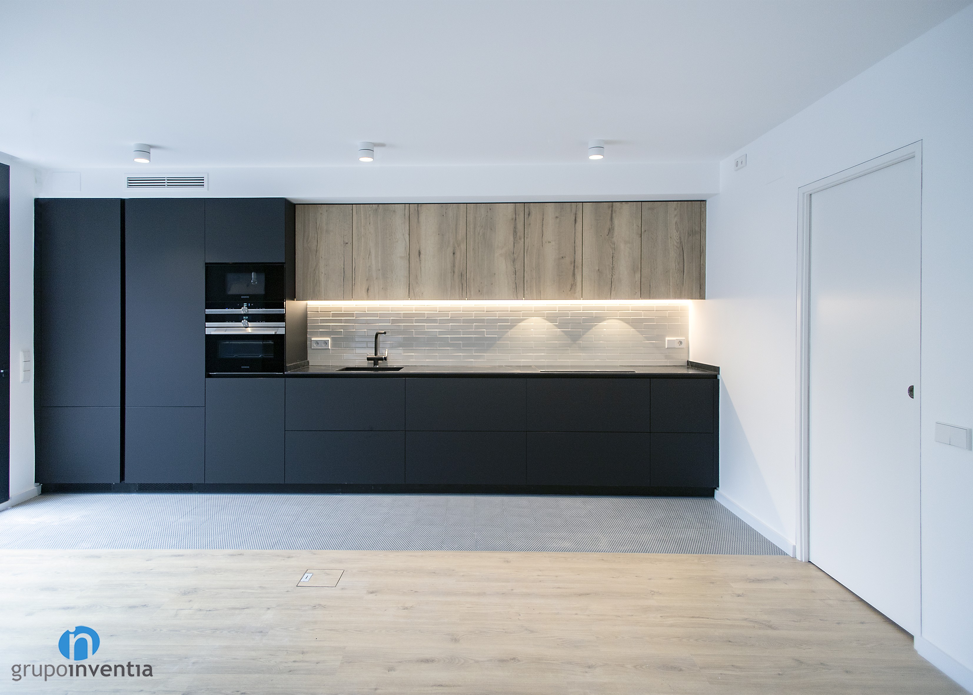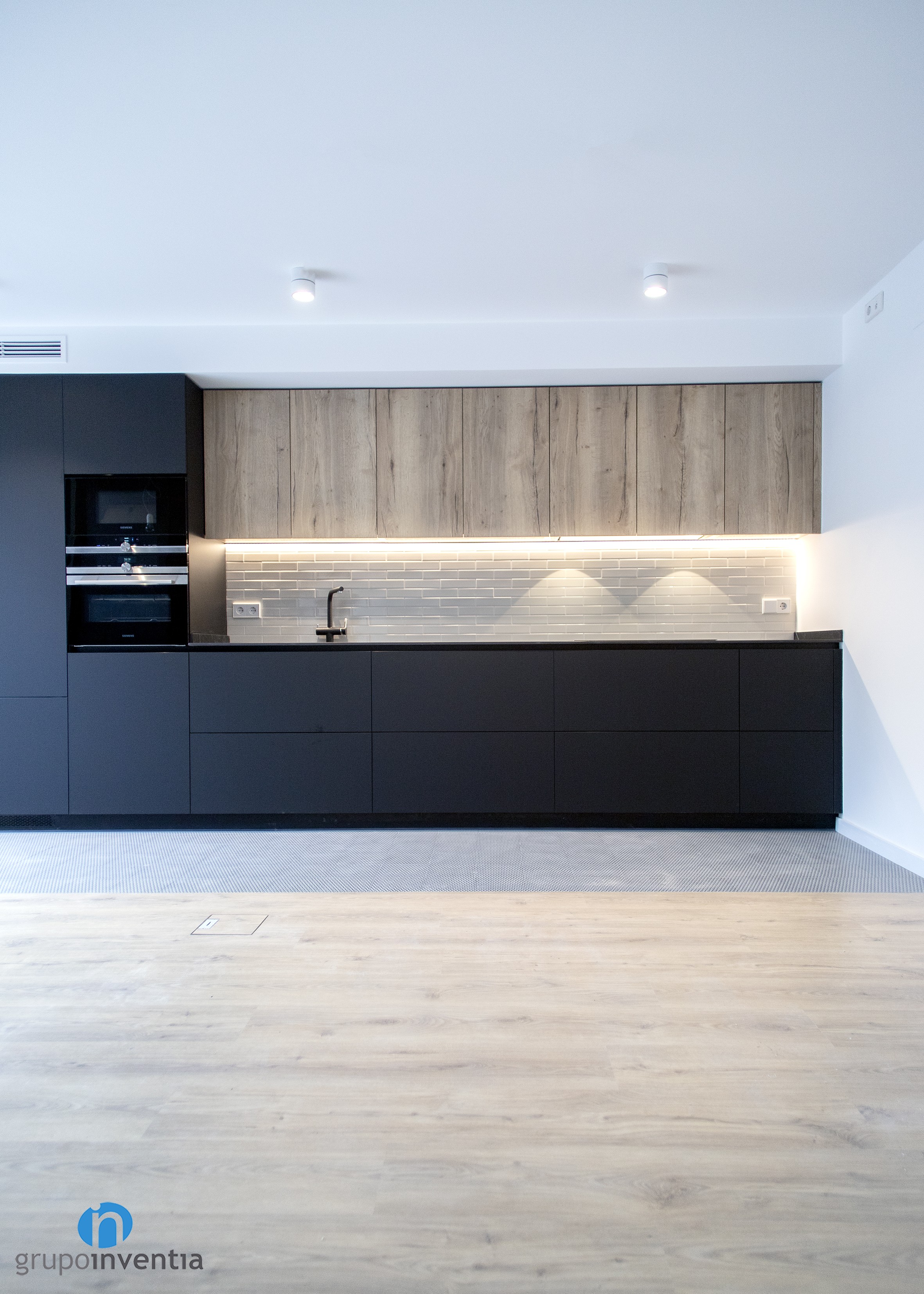 It is an open kitchen and distributed in a linear fashion. Without a doubt, it was possible to take full advantage of available space and generate a correct mobility when using any of the elements installed in this kitchen renovation. A black kitchen furniture and wooden finish was used, while its tiled panel with bevelled tile gives it a lot of personality.