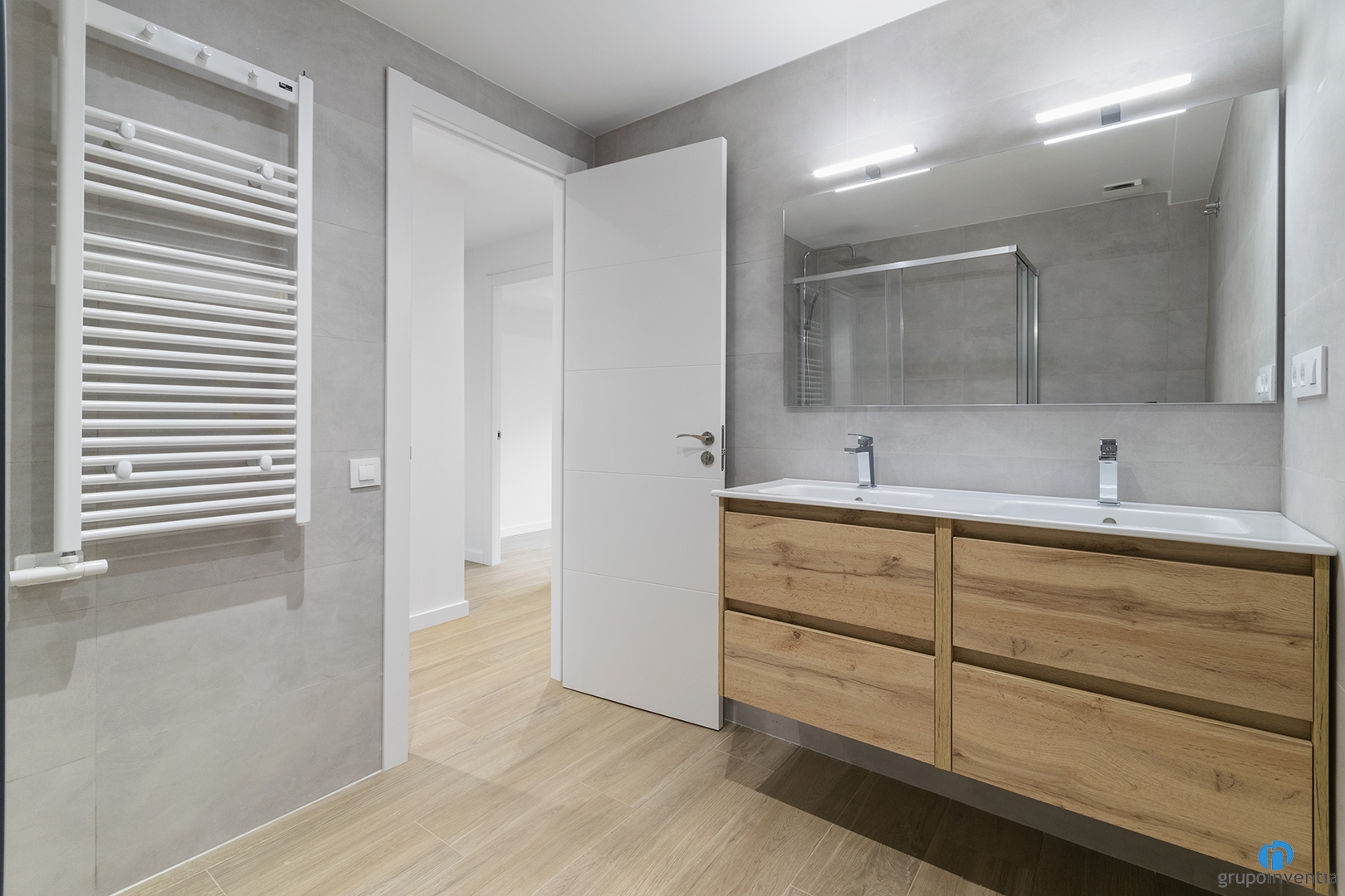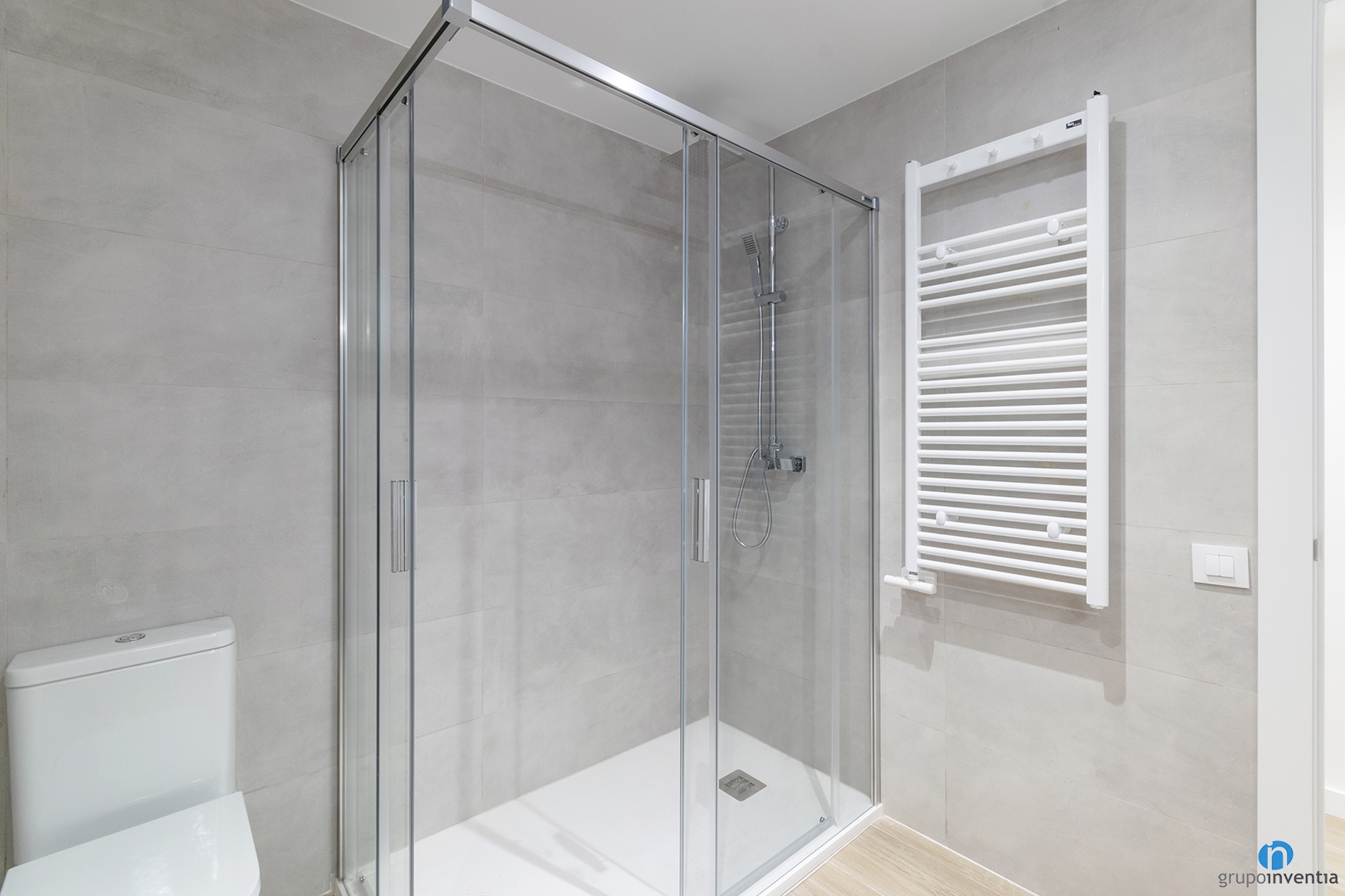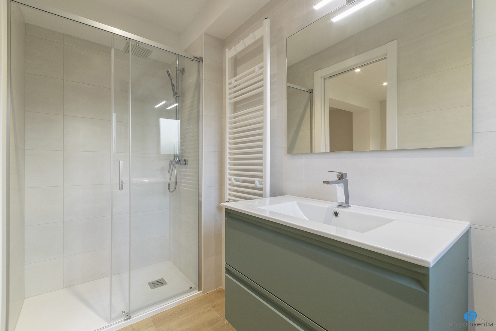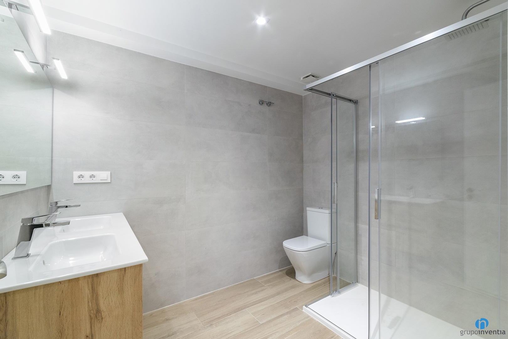 To design this bathroom renovation, we opted for neutral tones that generate fresh and pleasant environments. In this way we have tiled the walls with gray tone tiles that allow the light to flow easily. For the flooring we have kept the parquet imitation ceramic floor. In addition to generating continuity, it also generates warmth.
