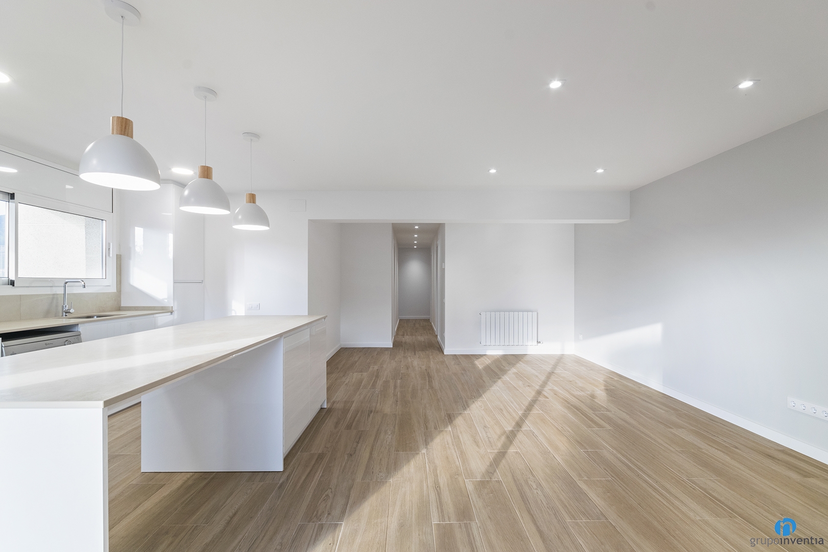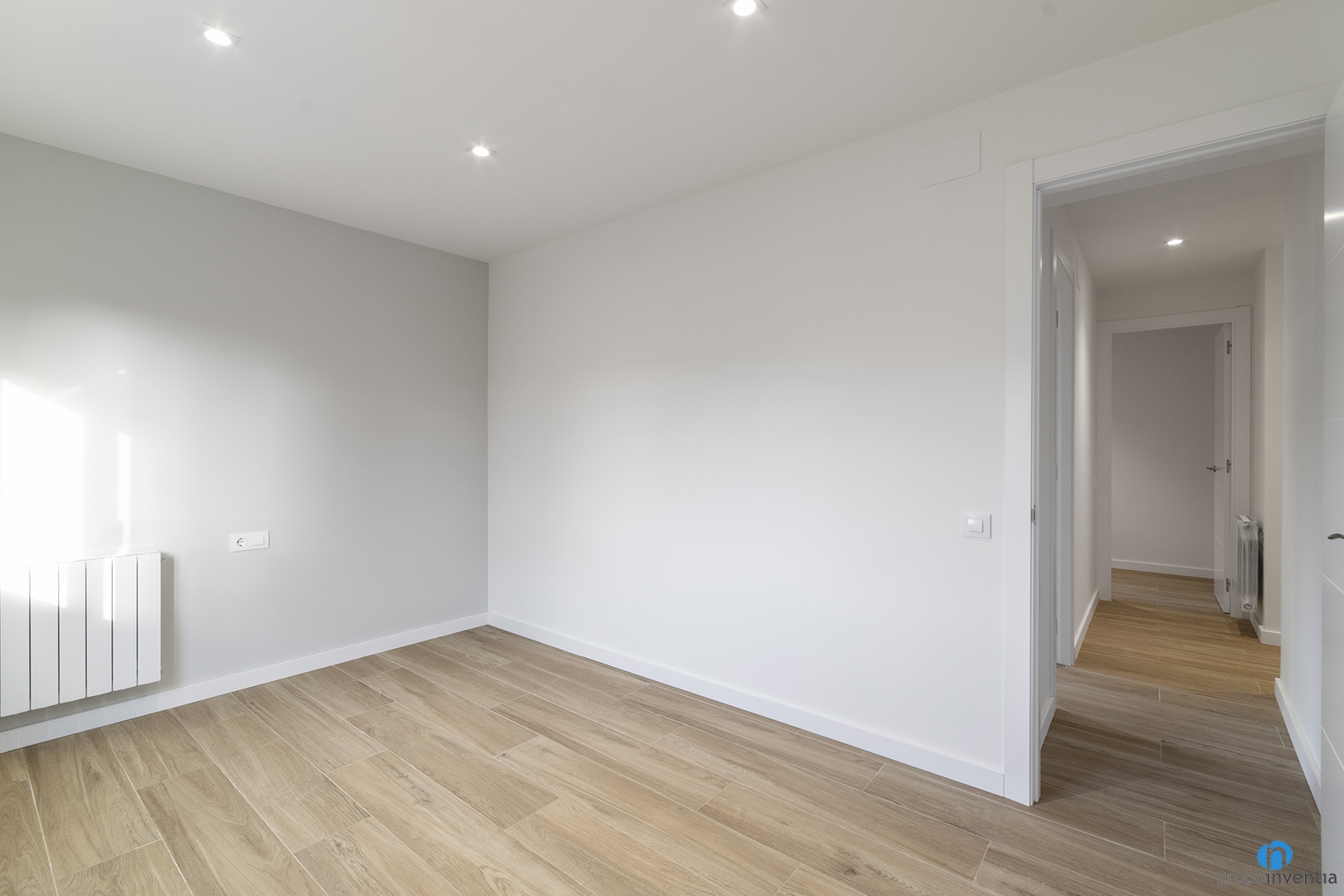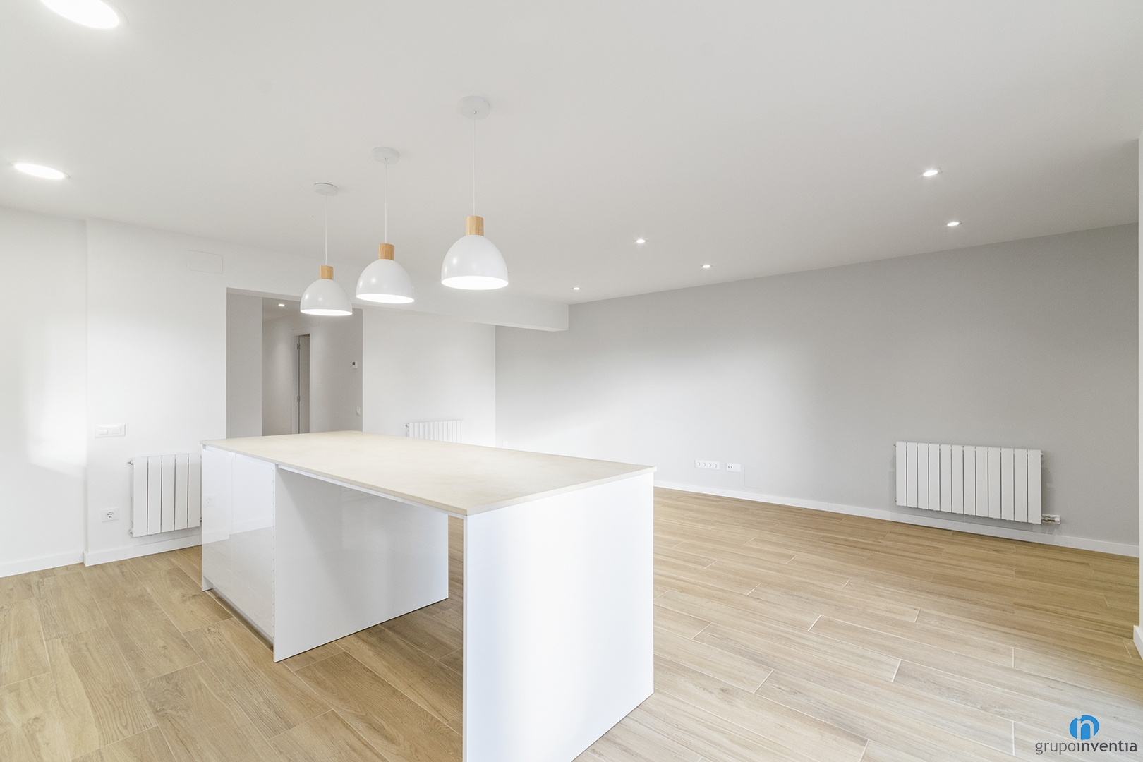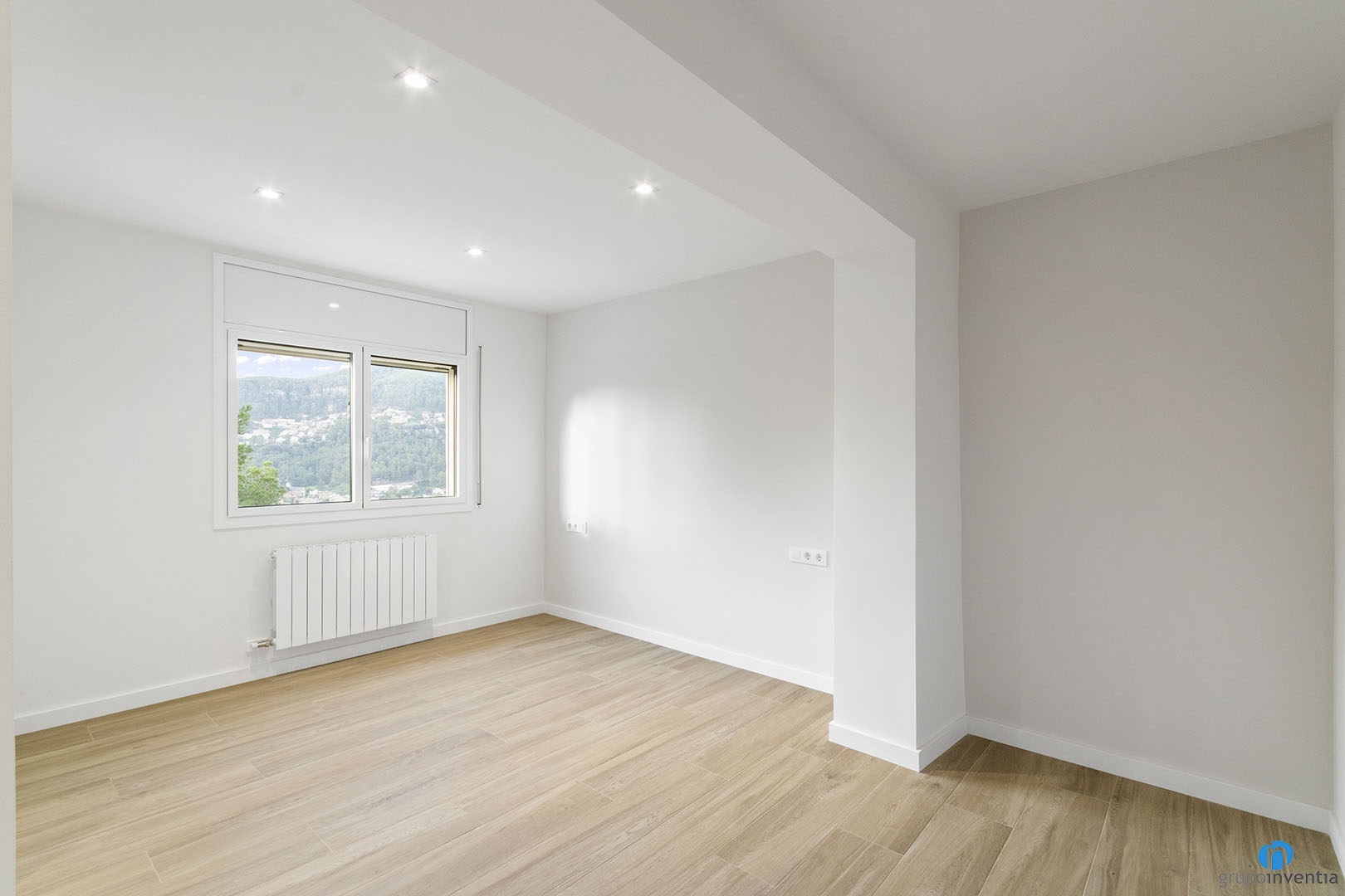 We have painted the walls in an off-white tone, using other tones on specific walls. Among them, the headboards of the youth bedrooms. These colors are combined with a parquet imitation ceramic floor. We have installed this new flooring in all the rooms of the new house. In addition to these improvements, we also installed new lights. In this comprehensive home renovation project, we opted for recessed lights.