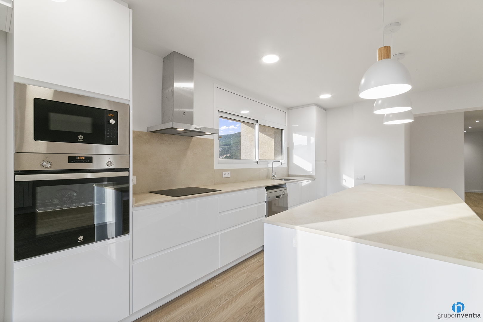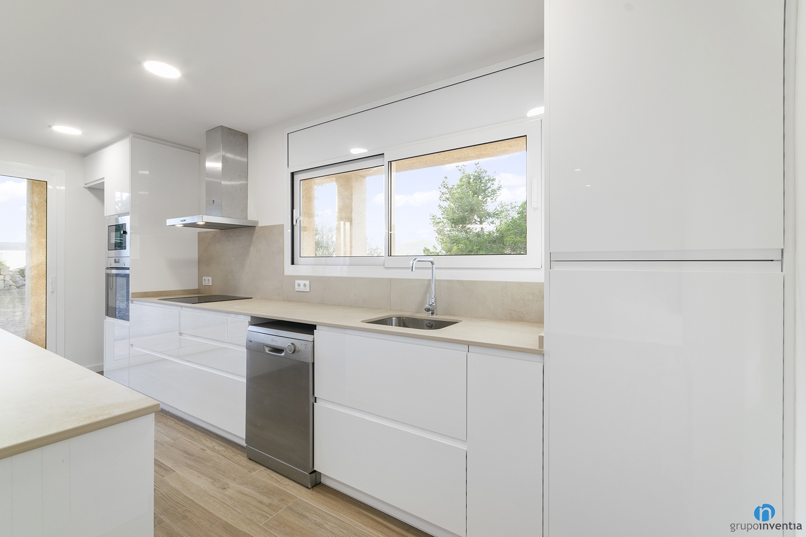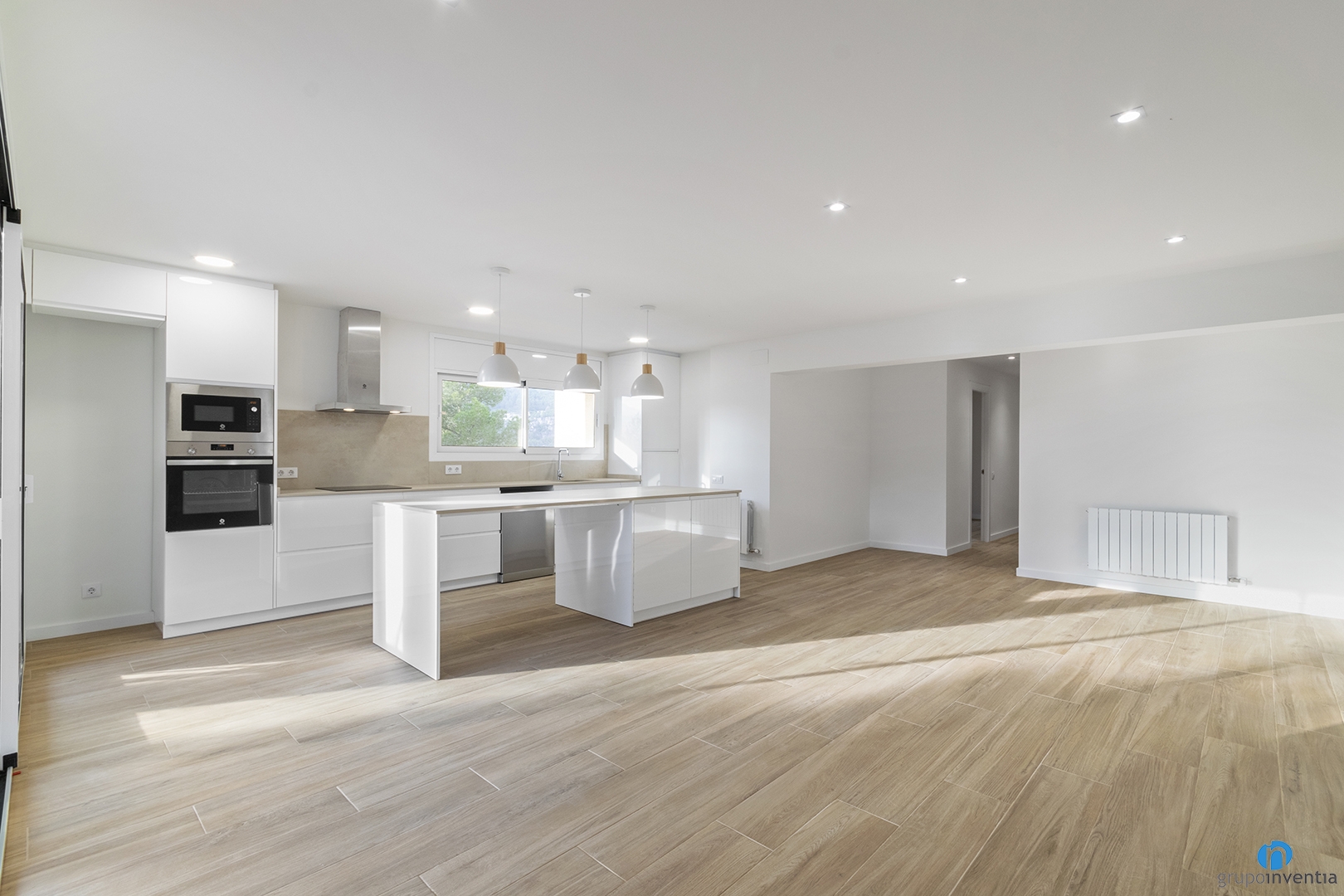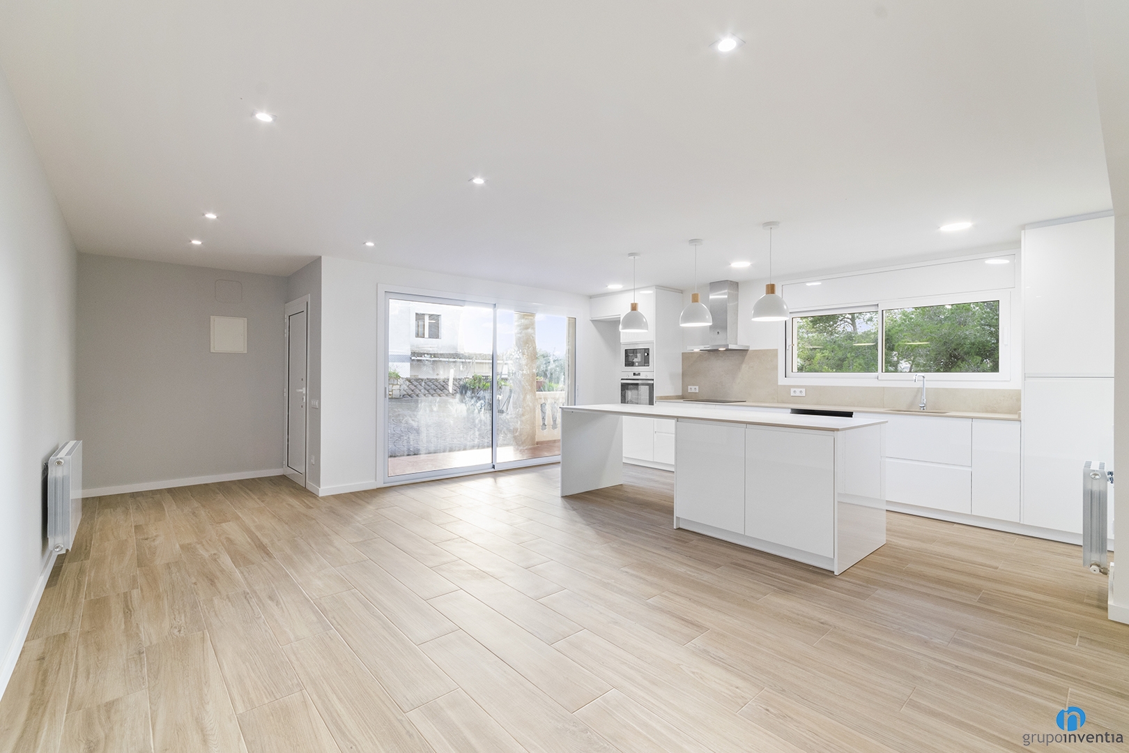 The new kitchen is open concept and has linear furniture and a kitchen island. The latter offers a large work and support surface. In addition, it has storage capacity at the bottom with double wardrobes. Enabling some stools can also be used as a breakfast bar.