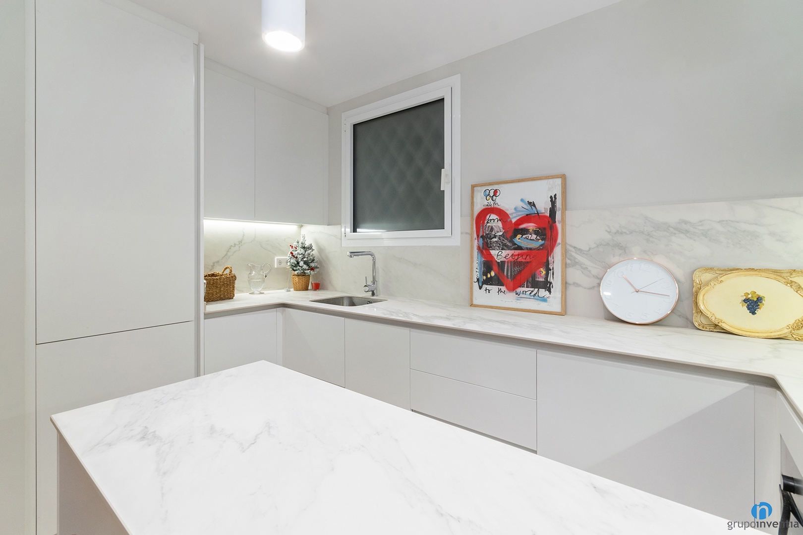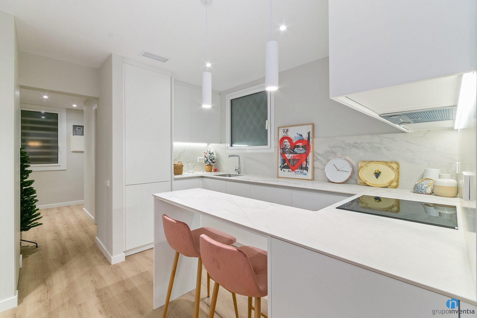 As we mentioned, the design of this kitchen renovation is integrated into the overall image of the apartment. The kitchen furniture is white and the counters have a marble finish.