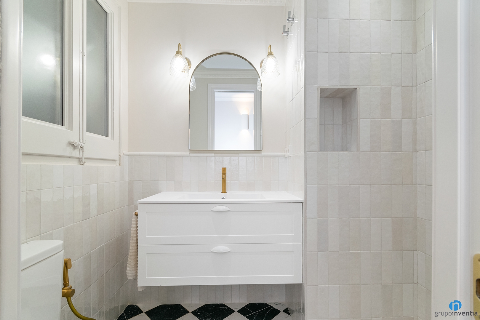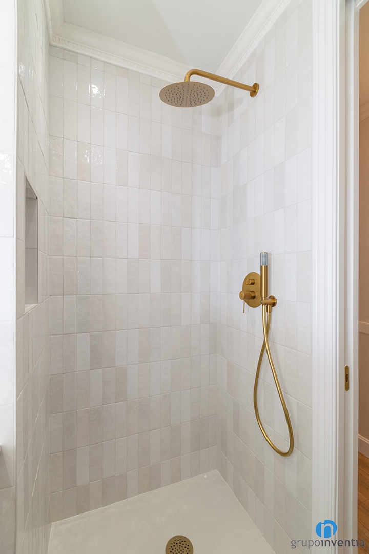 While one toilet is suspended and the other classic, the faucets are built-in and have a gold finish. At the same time, the design of the two cleaning spaces is very similar and fits into the overall image of this renovated flat. Neutral tones and a black and white floor create two comfortable and pleasant stays.
