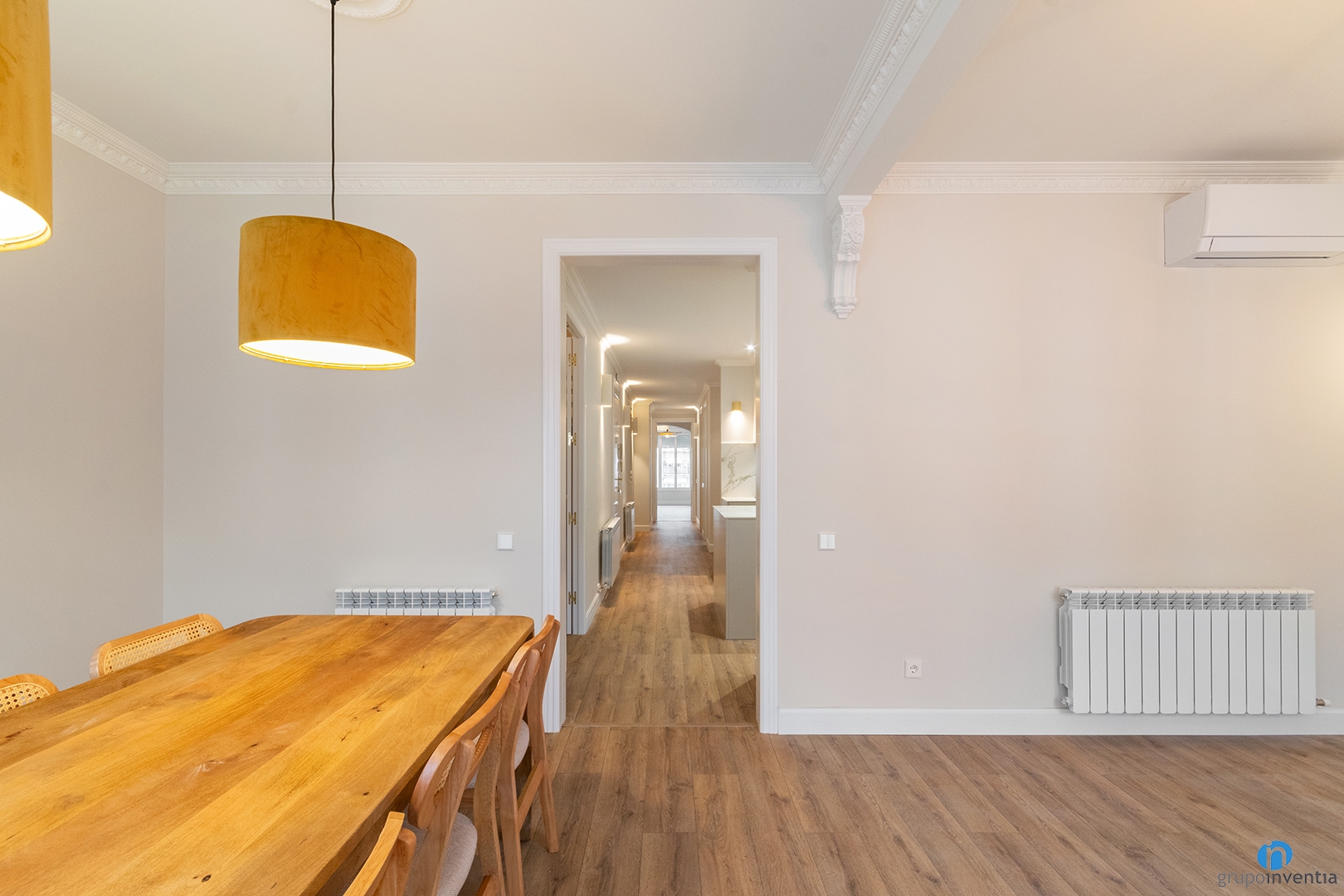 Practically every wall culminates with them and they generate an image of continuity throughout the house. In this house renovation, they are made of plaster and have been made to measure according to the needs of each room. Plus, they match the rosettes we’ve also created on each pendant light.