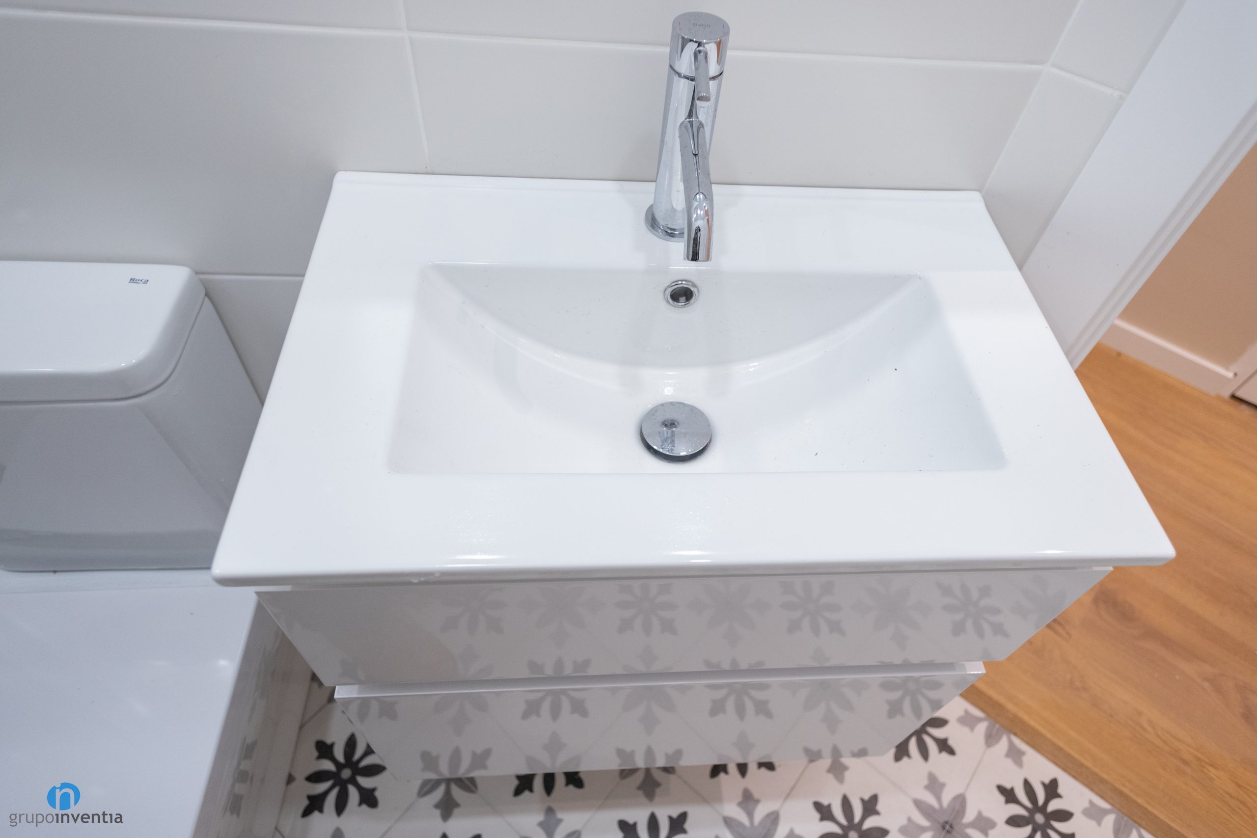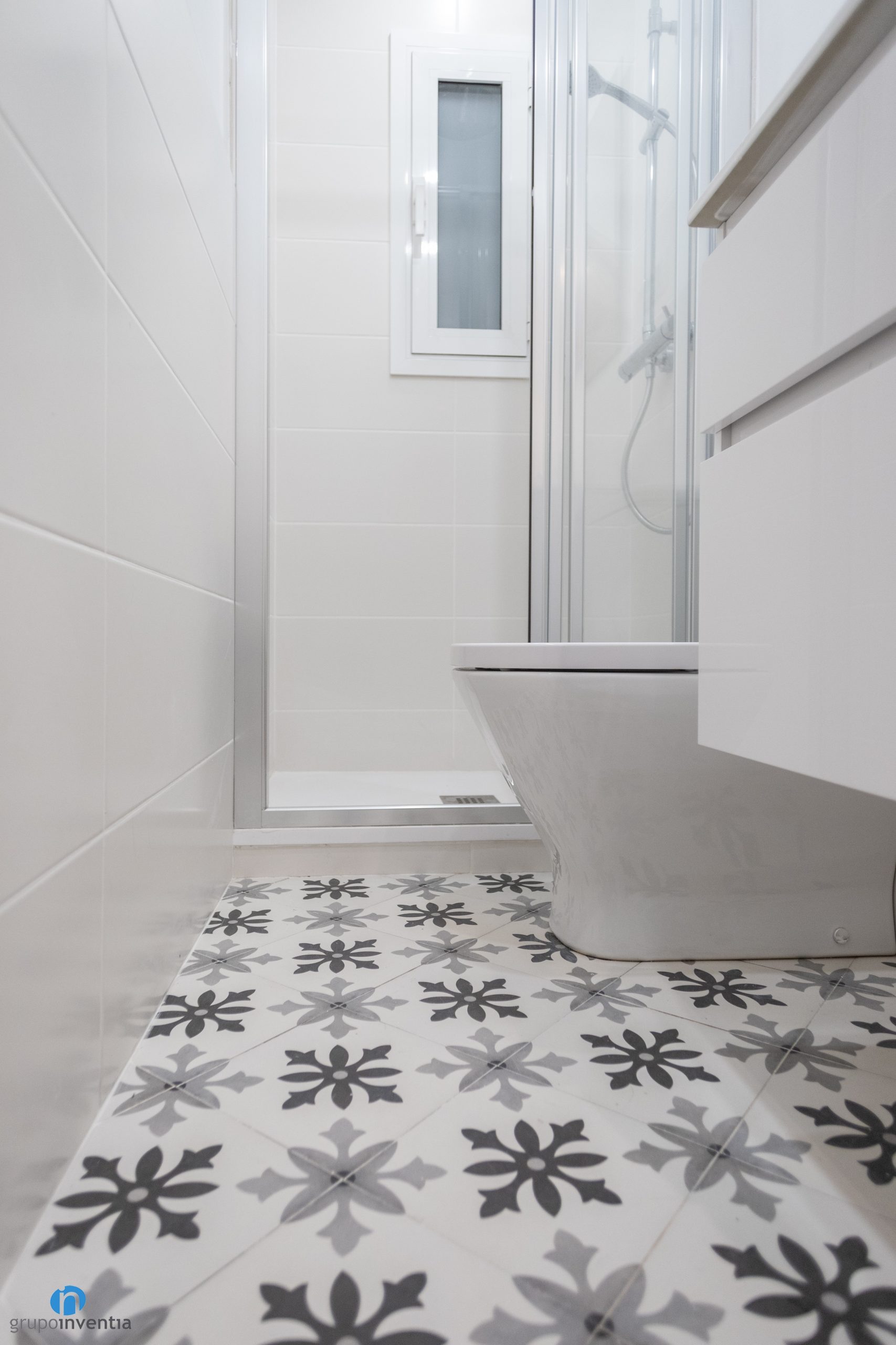 In addition to equipping it, the interior image of this bathroom renovation has also been improved. The walls have been tiled at half height with beige tiles and the rest has been painted white until it reaches the ceiling. For the new pavement, a hydraulic type floor with designs in black and gray tones has been chosen.