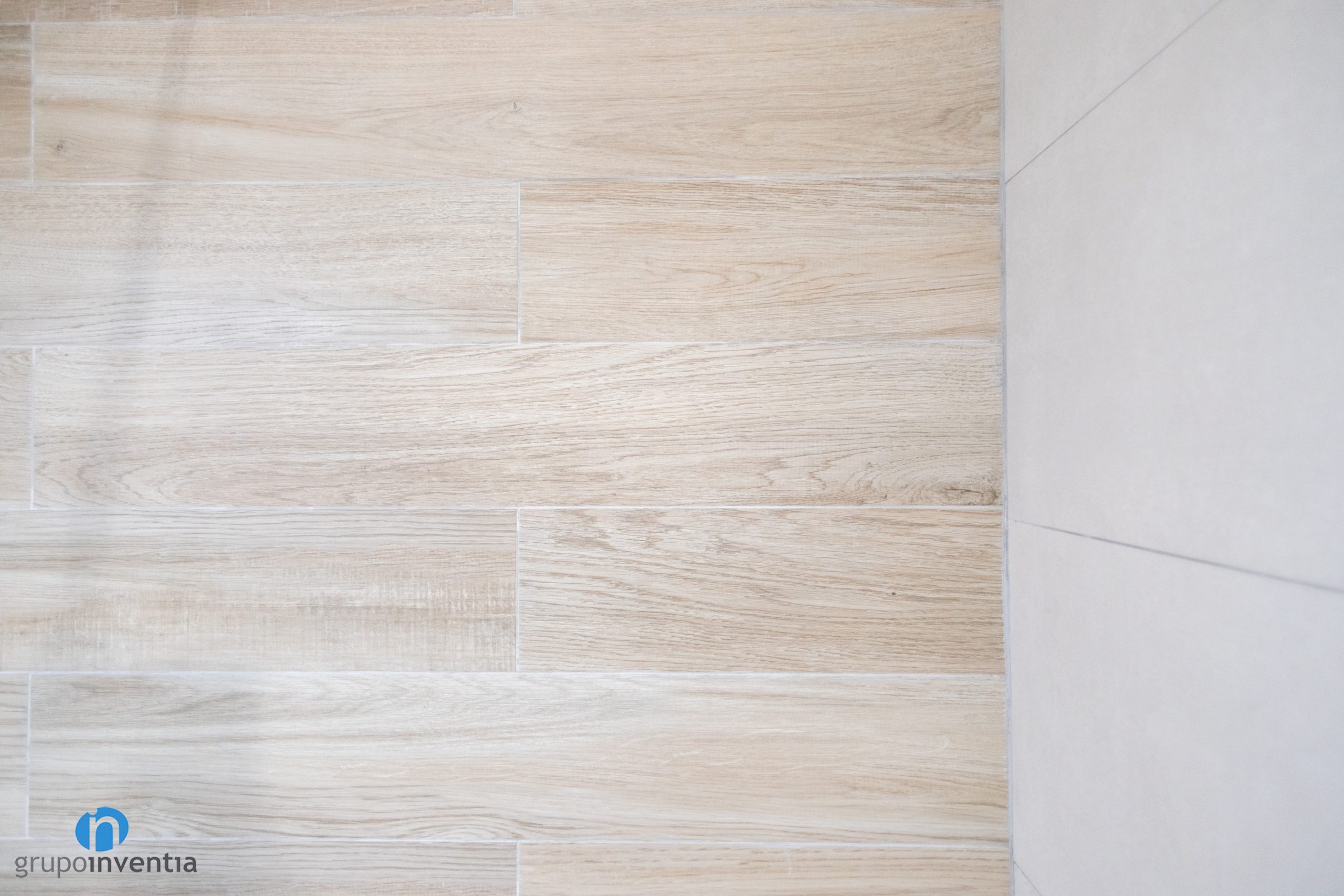 Other renovated spaces in this house renovation in Barcelona are the bathrooms. Now both have a renewed design and very suitable for everyday use. In both bathroom renovations the walls have been tiled with beige tiles and a fresh and pleasant atmosphere has been achieved. In the main bathroom the shower wall has been tiled with imitation wood tiles.