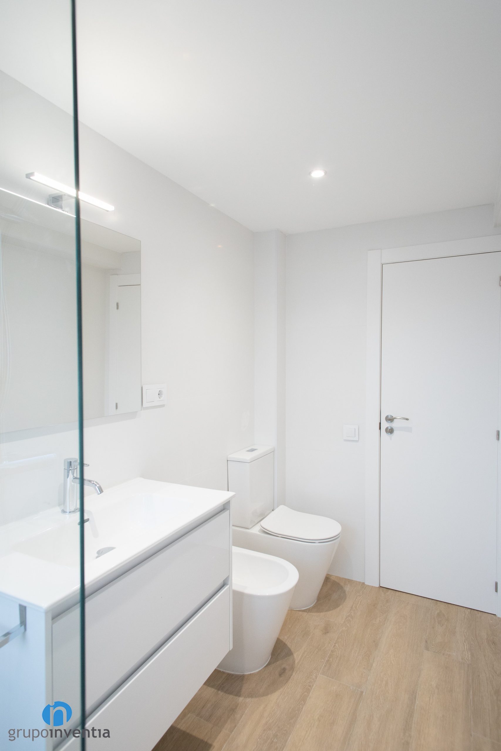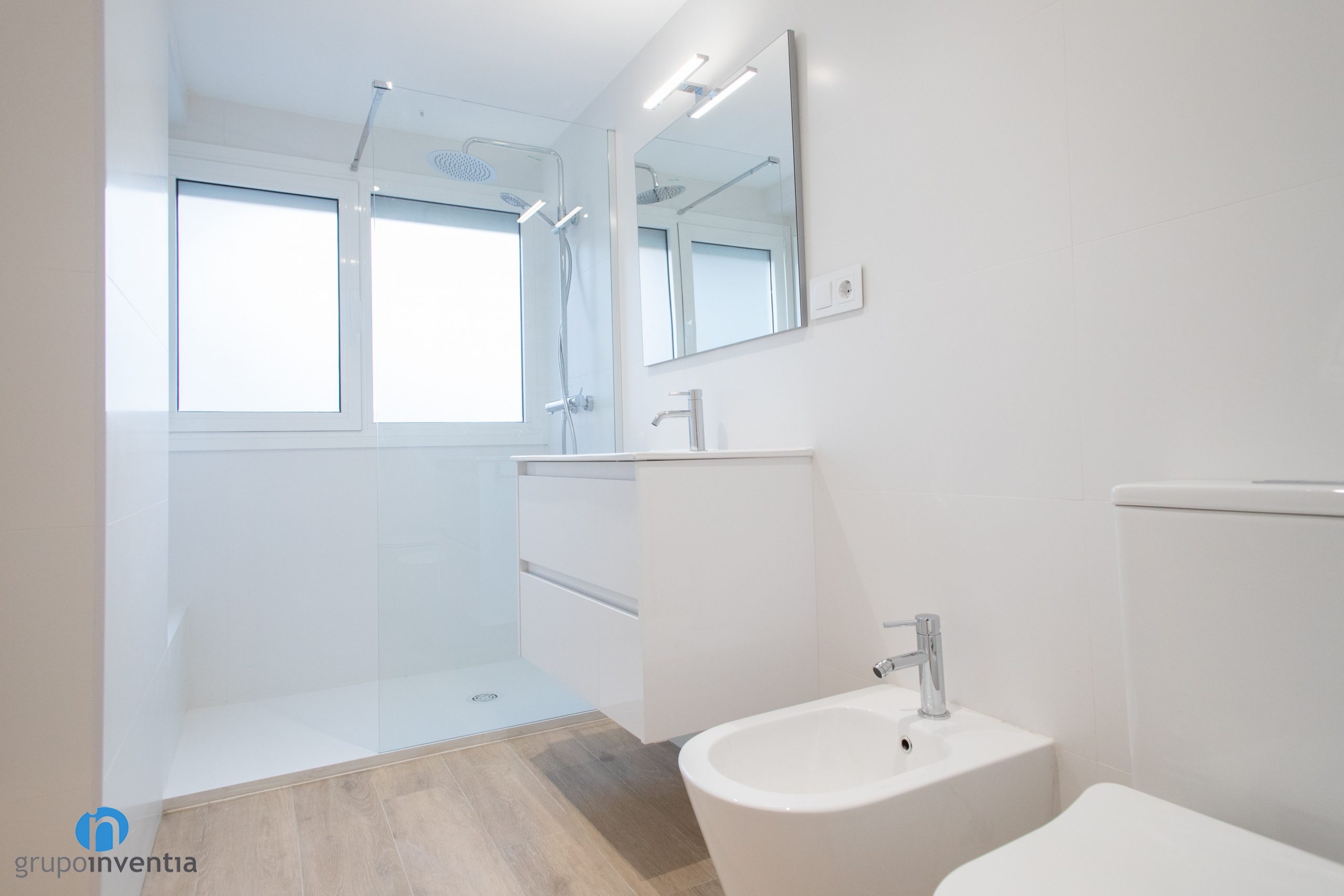 In the same way, the sanitary equipment has also been completely renewed. The first thing we find is a pair of modern line toilet and bidet. Right next to it is a washbasin with a white piece of furniture integrated in its lower area. The new shower tray is located at the end of the bathroom. It is spacious, practical and protected with a static bulkhead.