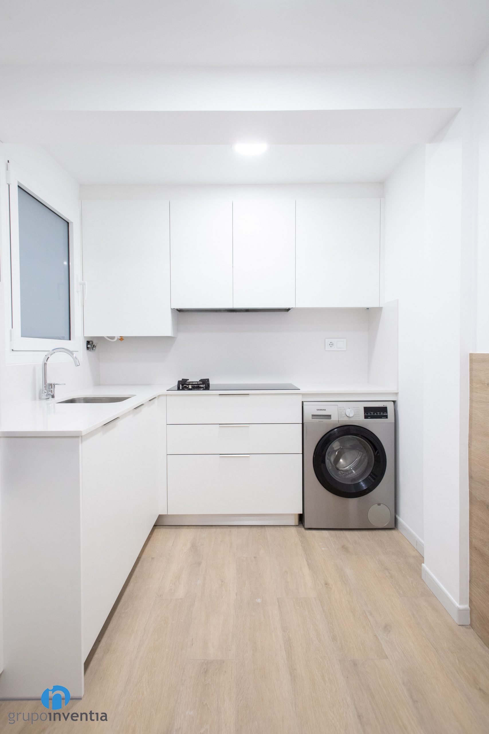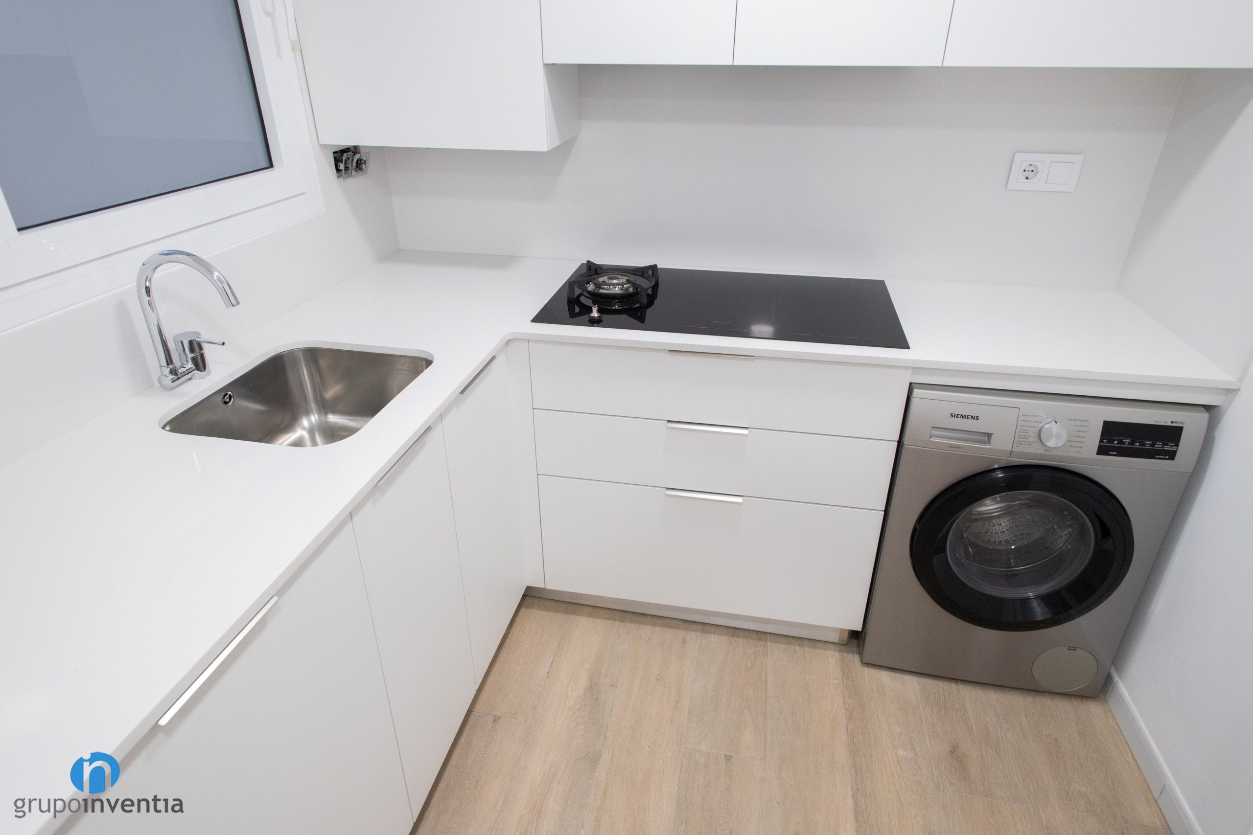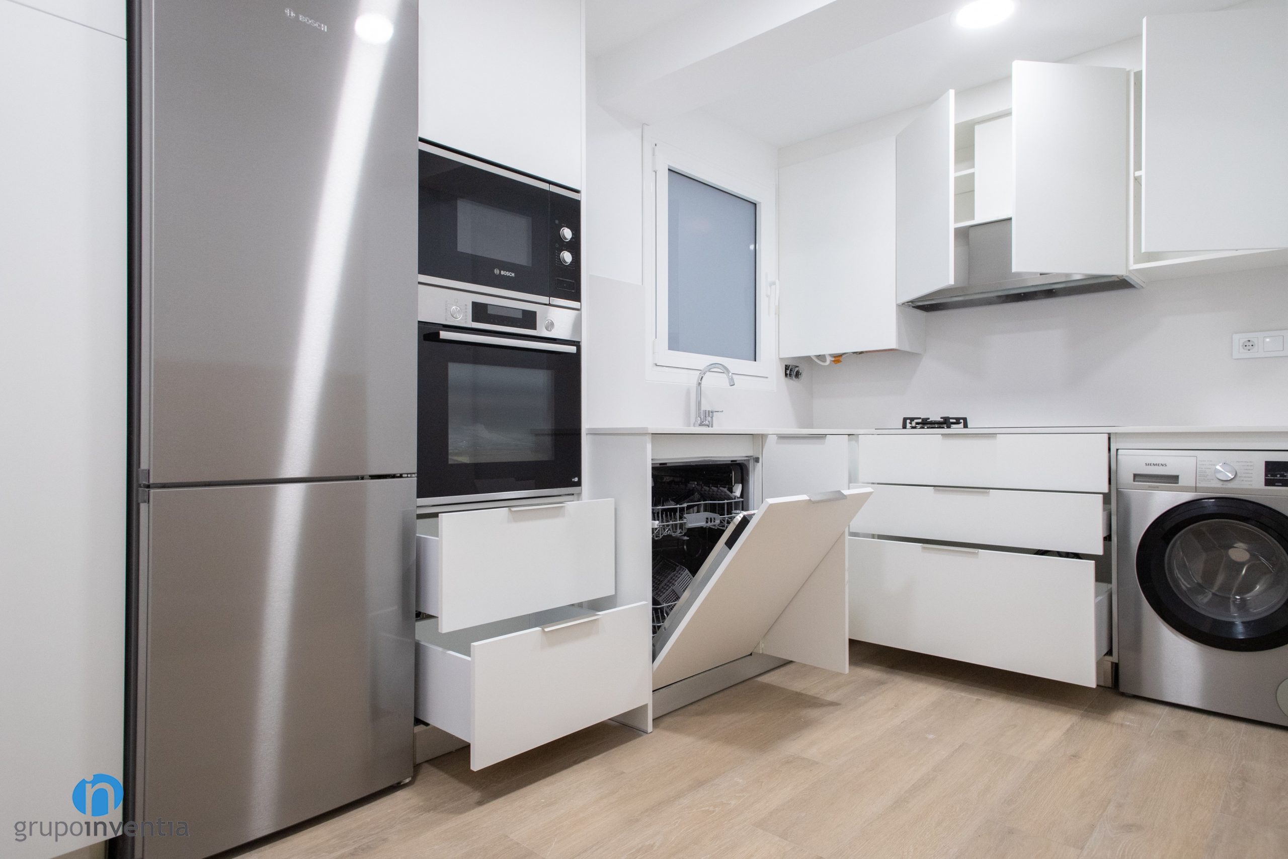 Another area to be improved in this house renovation in Barcelona was the kitchen. It is located in its own room and an L-shaped layout has been chosen. At the far left, the new appliances have been integrated, all of them with a stainless steel finish. They consist of refrigerator, oven and microwave. Immediately afterwards, the first section of the countertop appears, offering a large support surface and being the location of the sink.