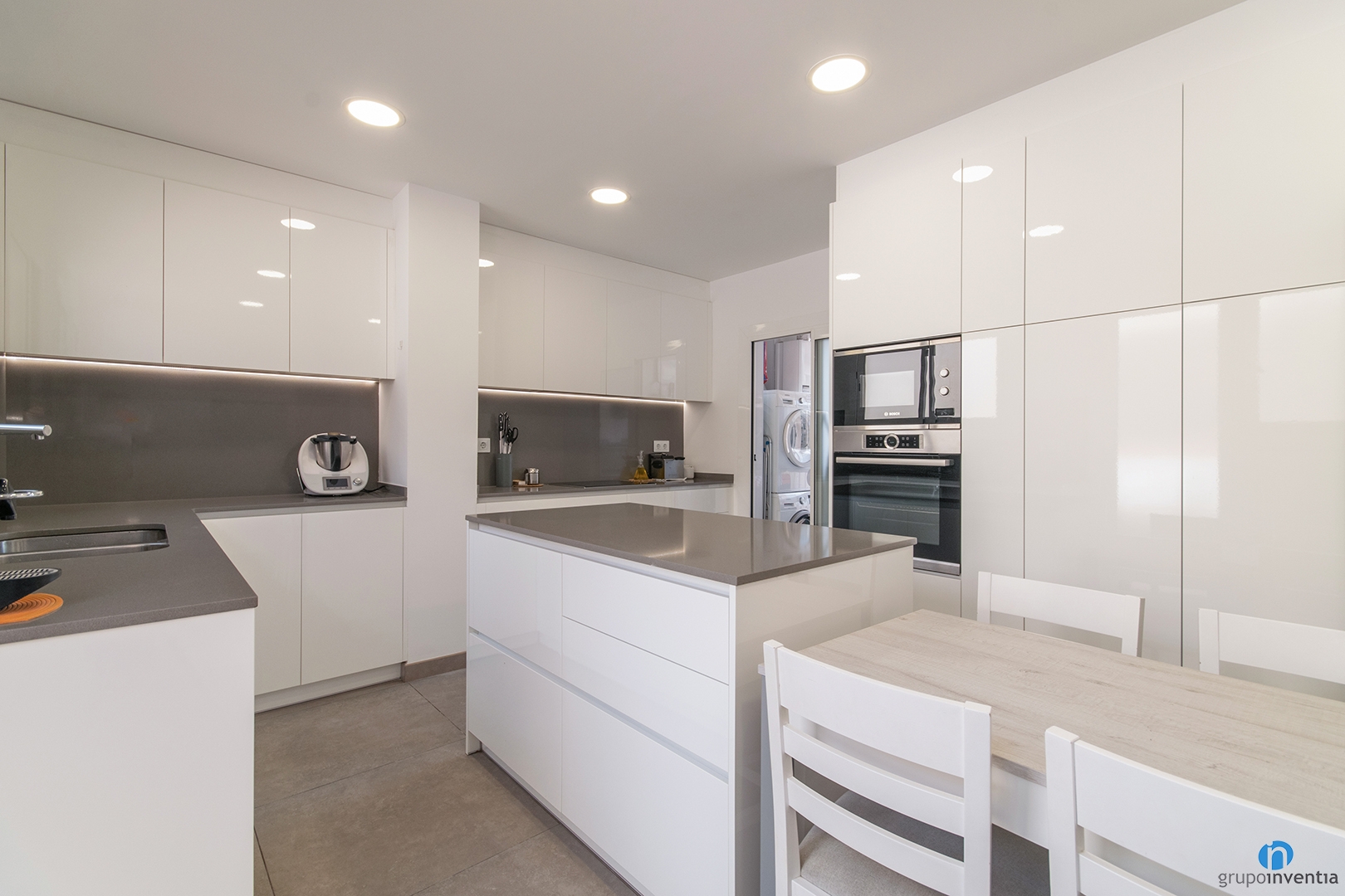 The kitchen unit is L-shaped and has storage both at the bottom and top. The finish is white and helps to enhance the brightness of the room. The counters have been equipped with a double sink and an induction hob. It has enough space to place all kinds of small appliances.