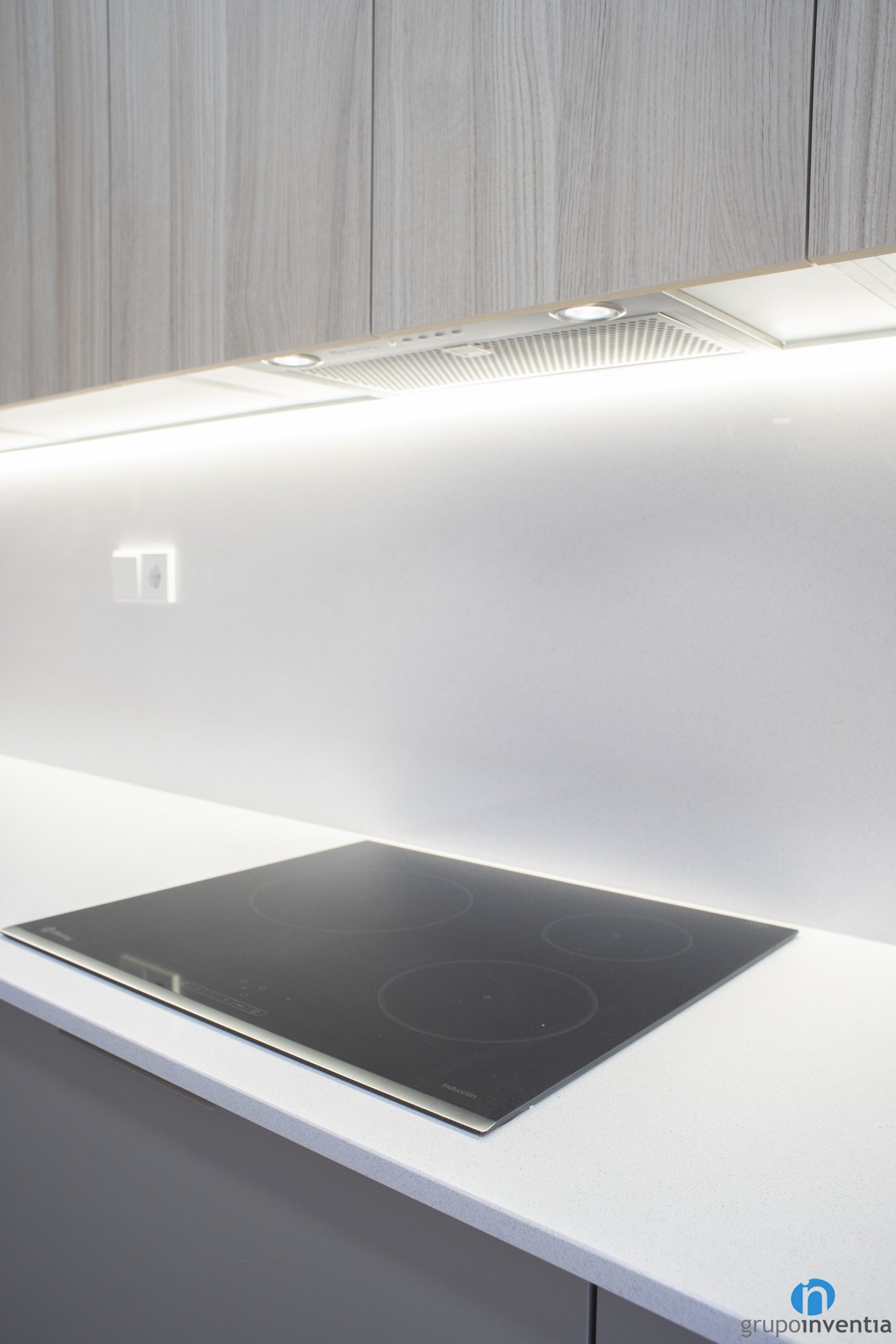 Since it is an open kitchen renovation, the image must match the overall design of the home. In this case it is a contemporary interior design with neutral tones as protagonists. The bottom of the kitchen cabinet and the ends have a gray tone finish. On the other hand, the upper cabinets have natural wood finishes. They combine perfectly with the ceramic floor that we installed.