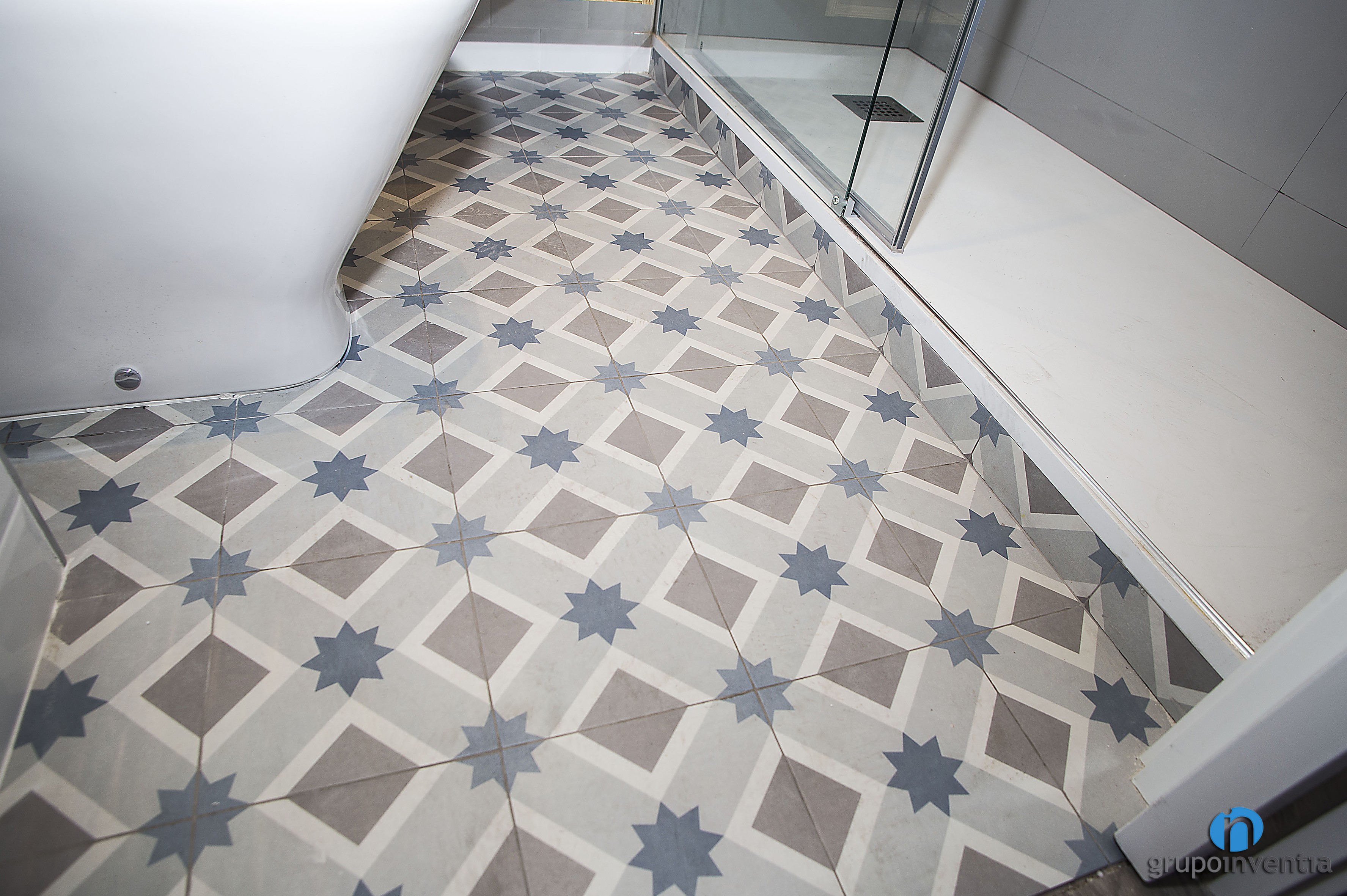 As for the interior design, the walls are tiled in medium height with white tiles, the same color with which the wall was painted. This is combined with a hydraulic flooring that adds a touch of color to the room.