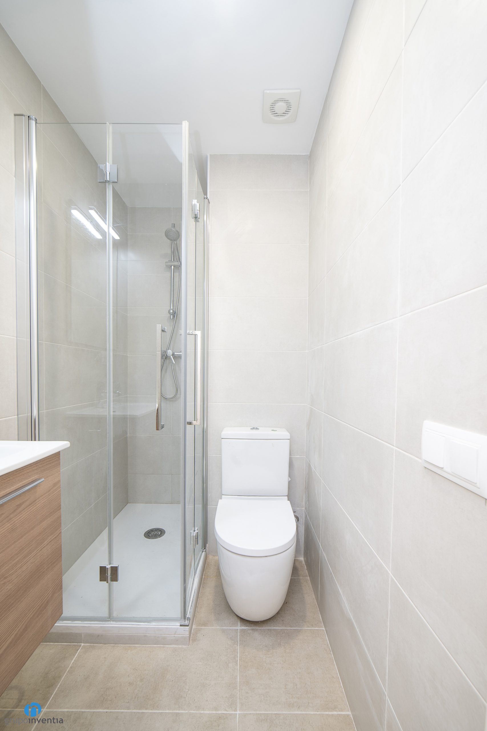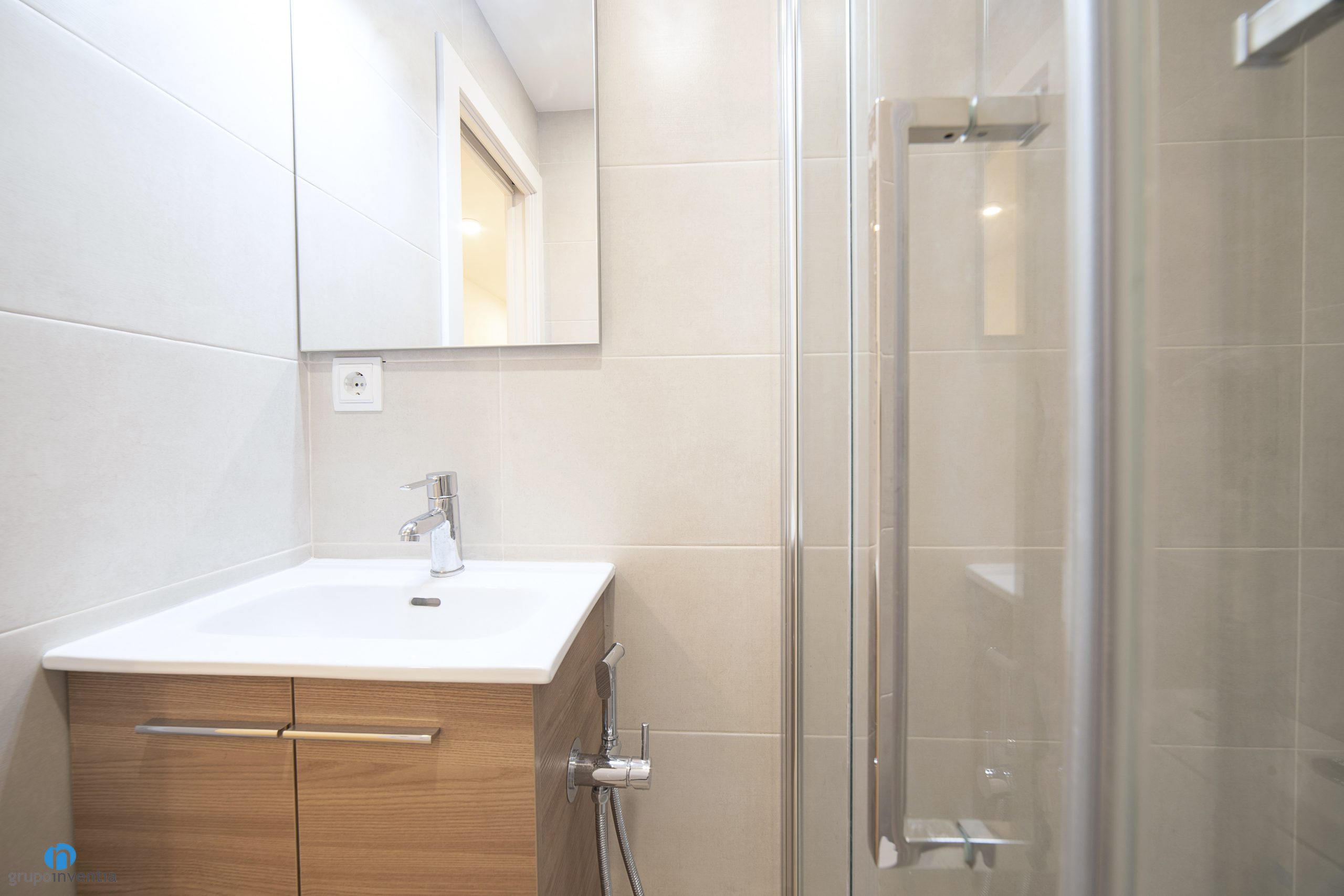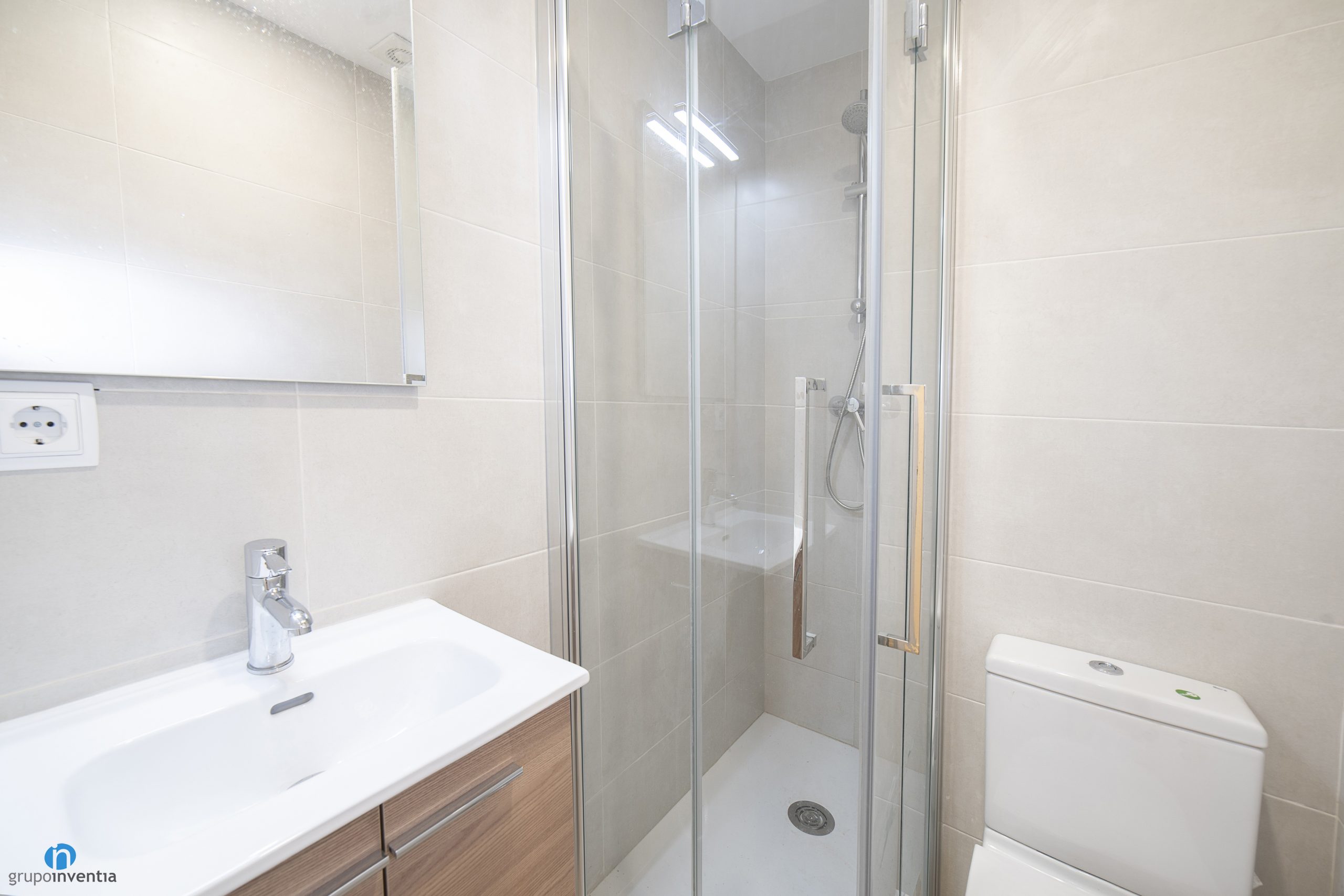 The sanitary equipment has also been changed and is now ready to offer the best features and functionality in its use. A floating sink with built-in storage cabinet has been installed. It has a wood finish and is perfect for organizing all kinds of hygiene products. It is accompanied by a toilet and a corner shower tray protected by sliding door.