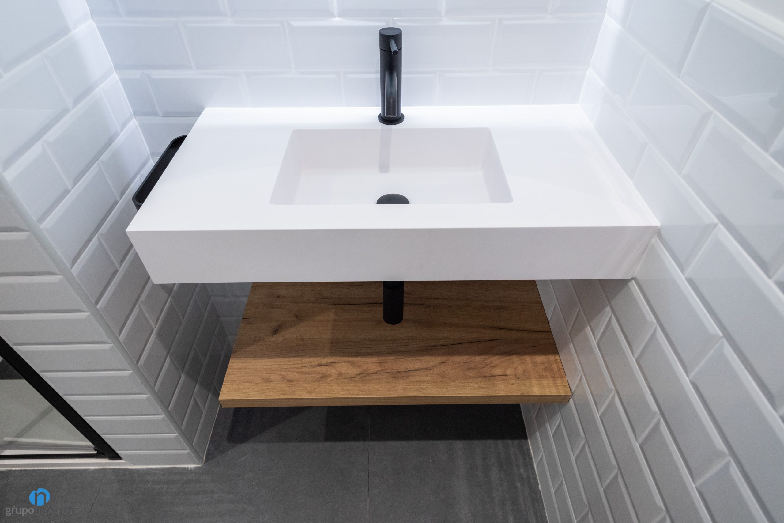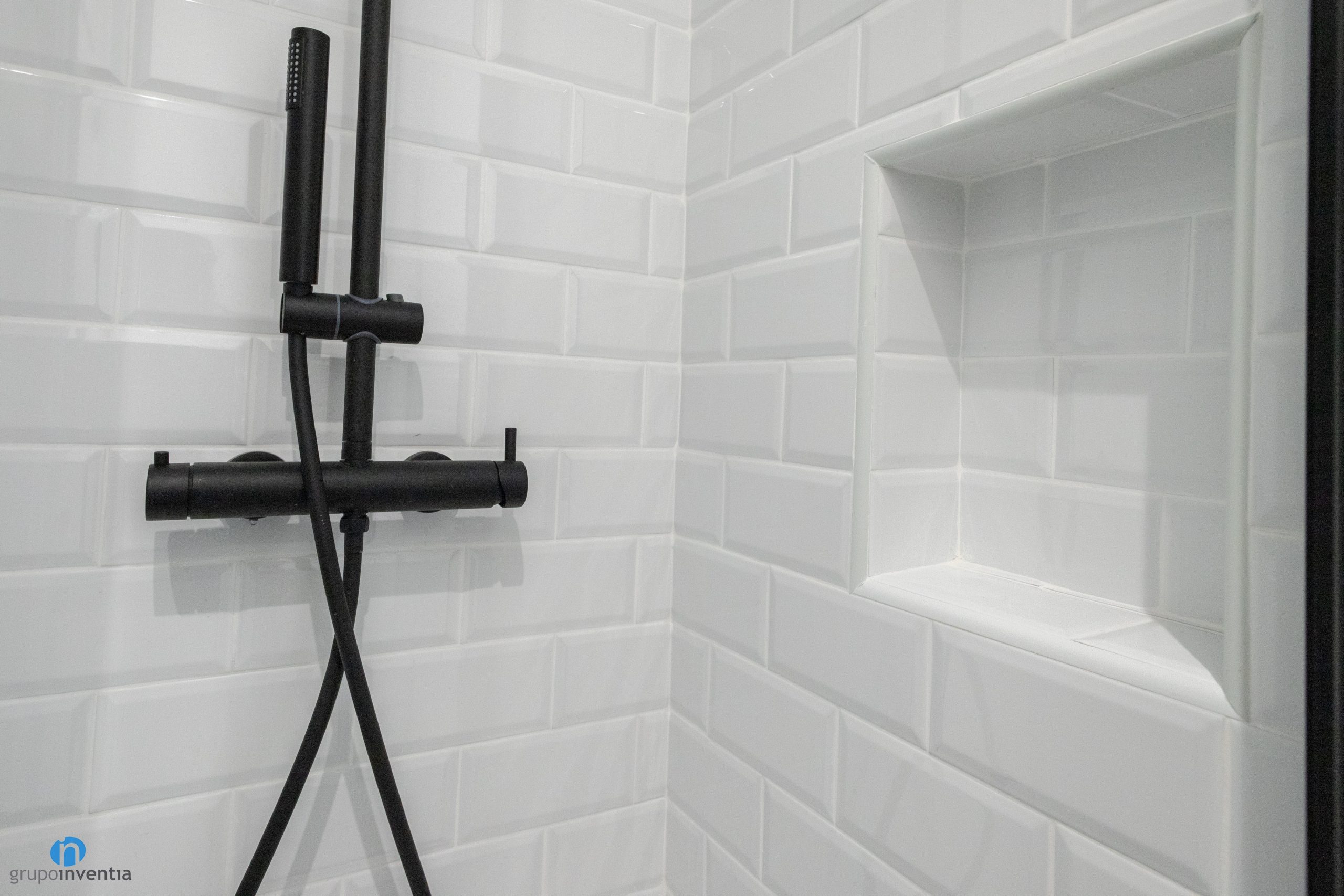 For the new image of the bathrooms, a contemporary design has been used to generate bright and pleasant spaces. In one of the bathrooms the walls have been tiled with gray tiles, while the walls in the other have been tiled with white beveled tiles. For both cases the final image is modern and current.