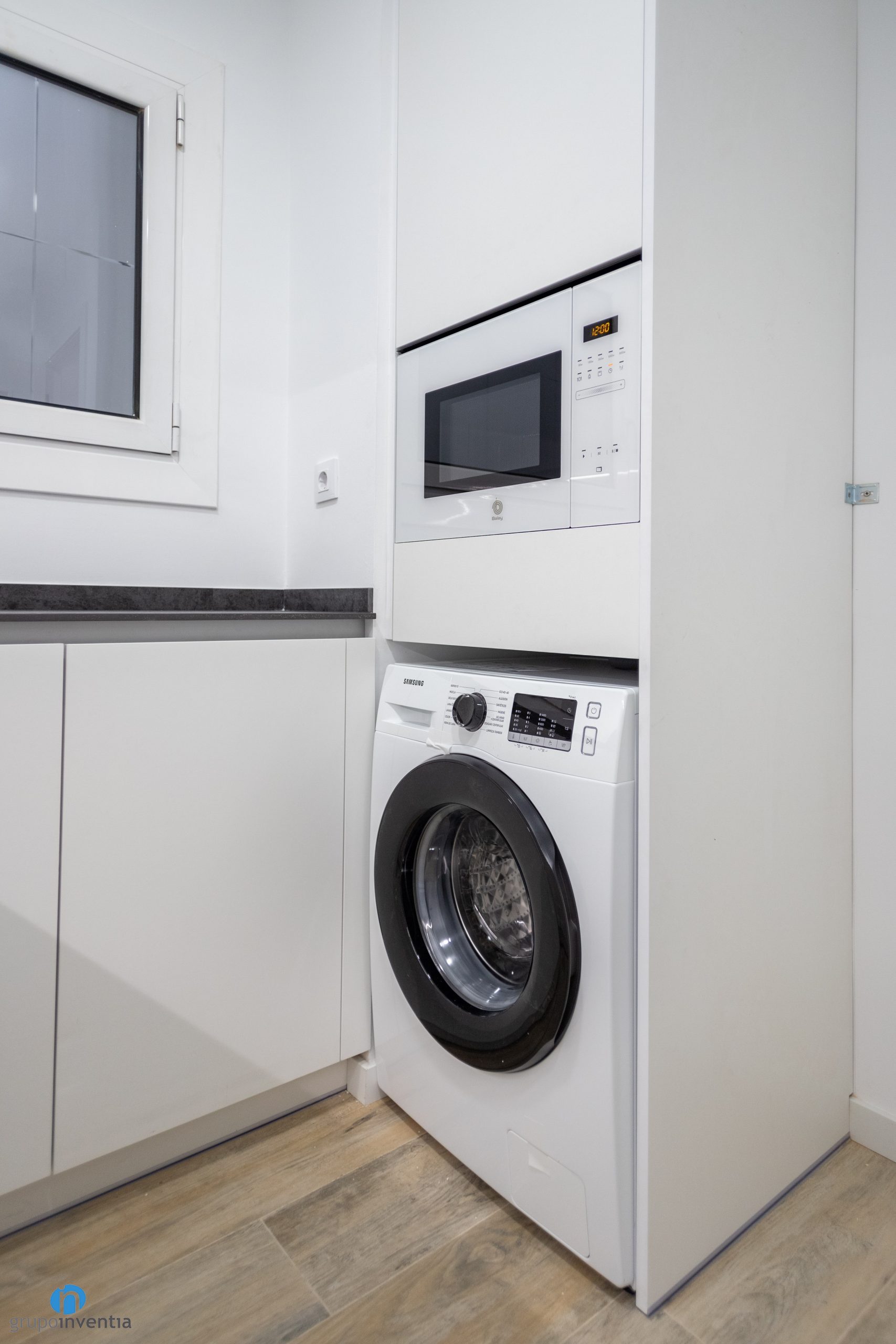 We find the kitchen in its own independent space. It has a large surface and the new distribution of the elements is U-shaped. This arrangement offers great mobility and each element is located in the best place to generate functionality in its use. All this with new white kitchen furniture and countertops with a black finish.