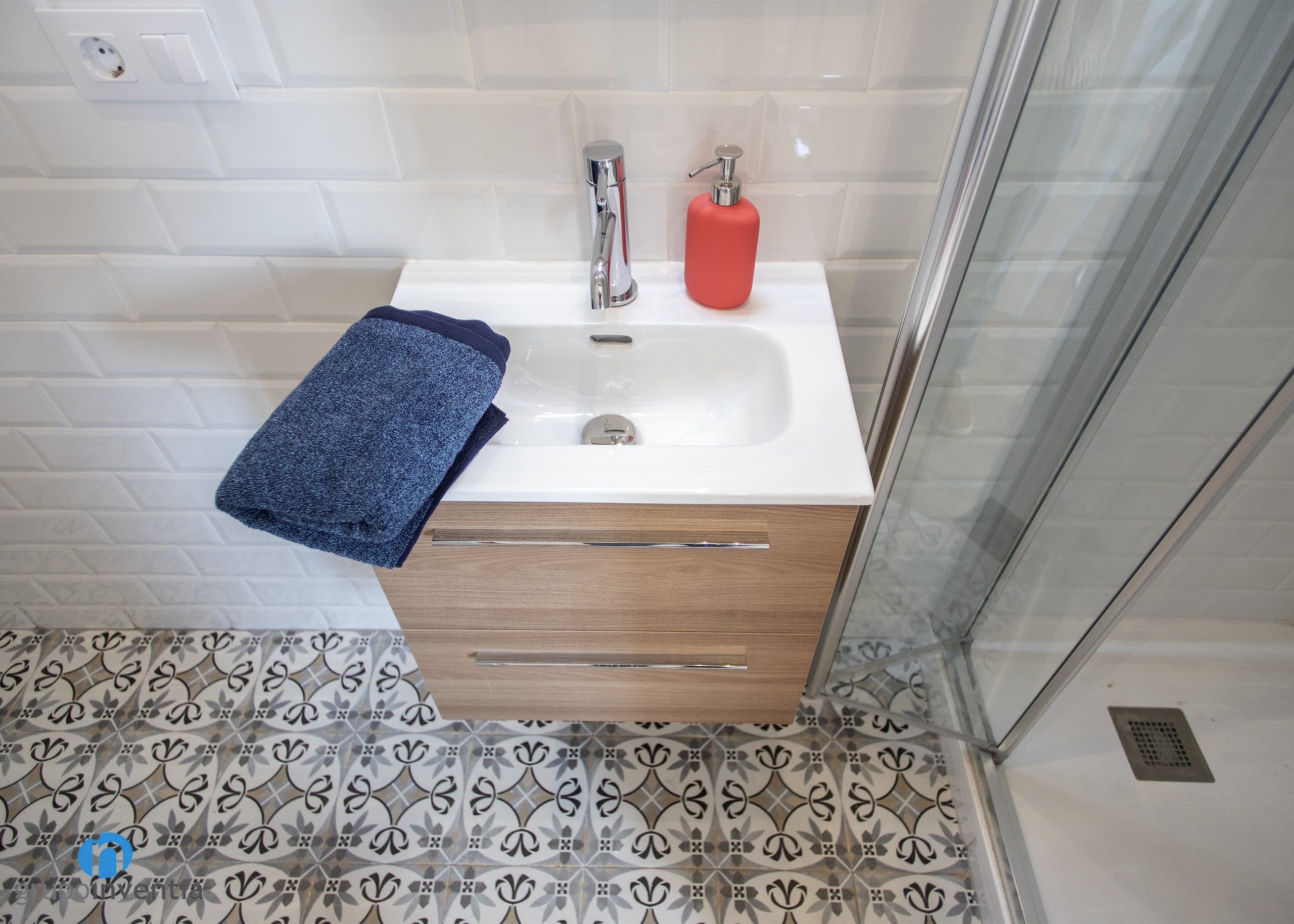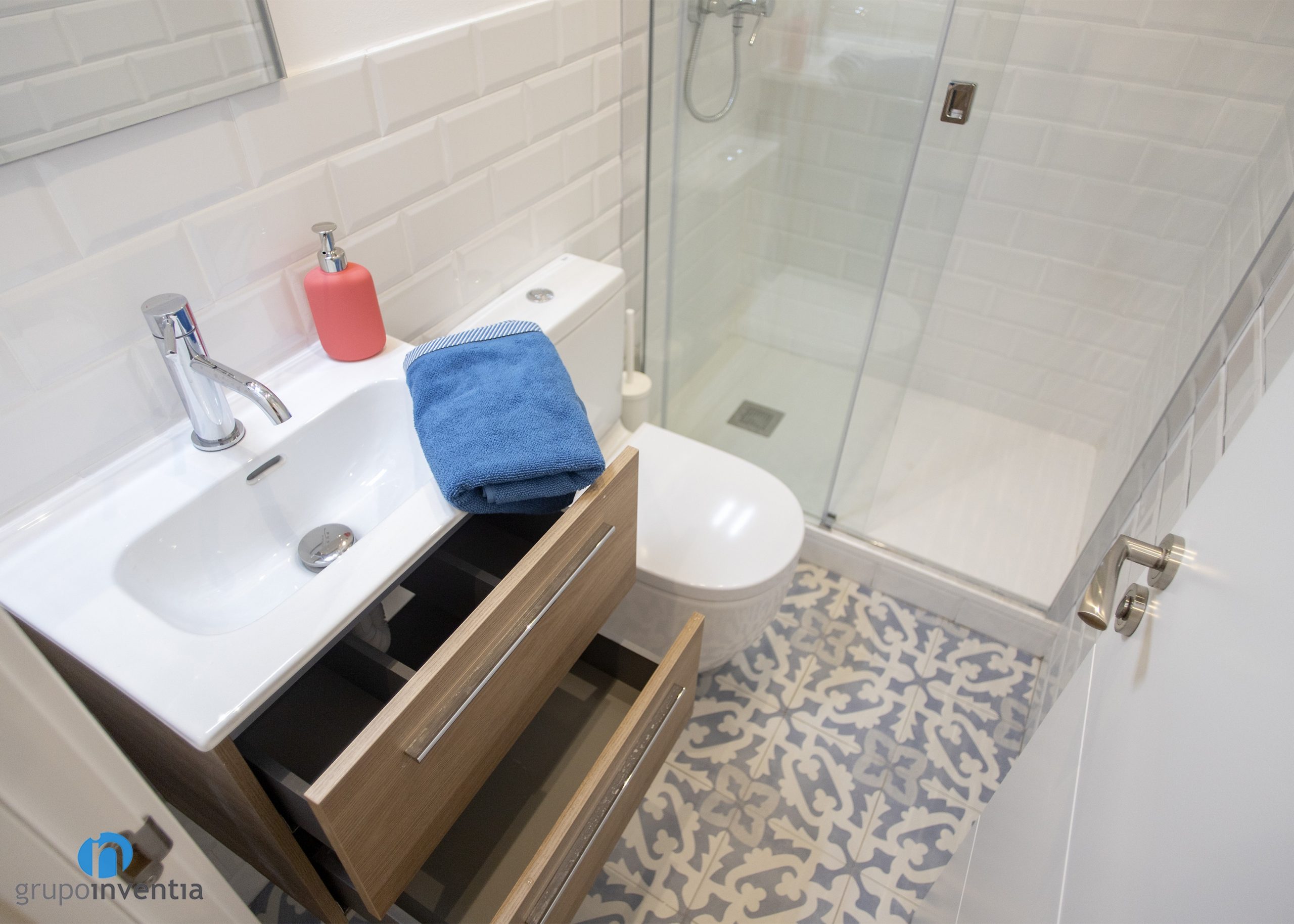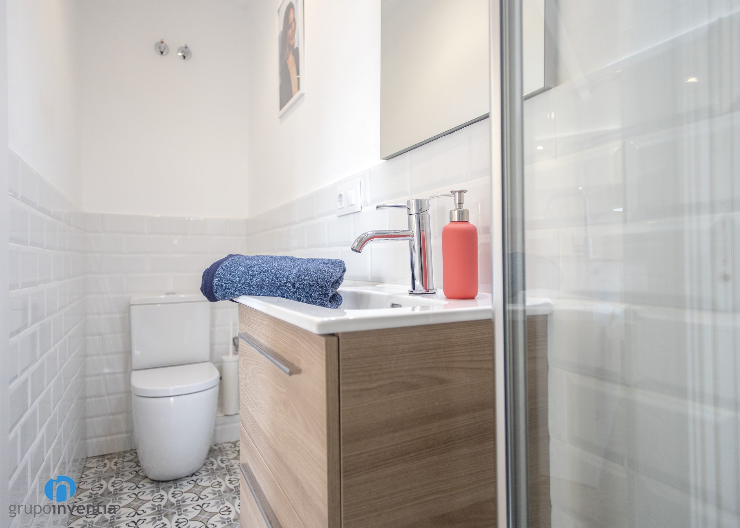 The house has two bathrooms in which the same interior design has been used for its new image. The walls have been tiled to a medium height with white bevelled tiles and a hydraulic type floor has been installed. These light and airy bathrooms also feature wooden finishes, specifically sink furniture.