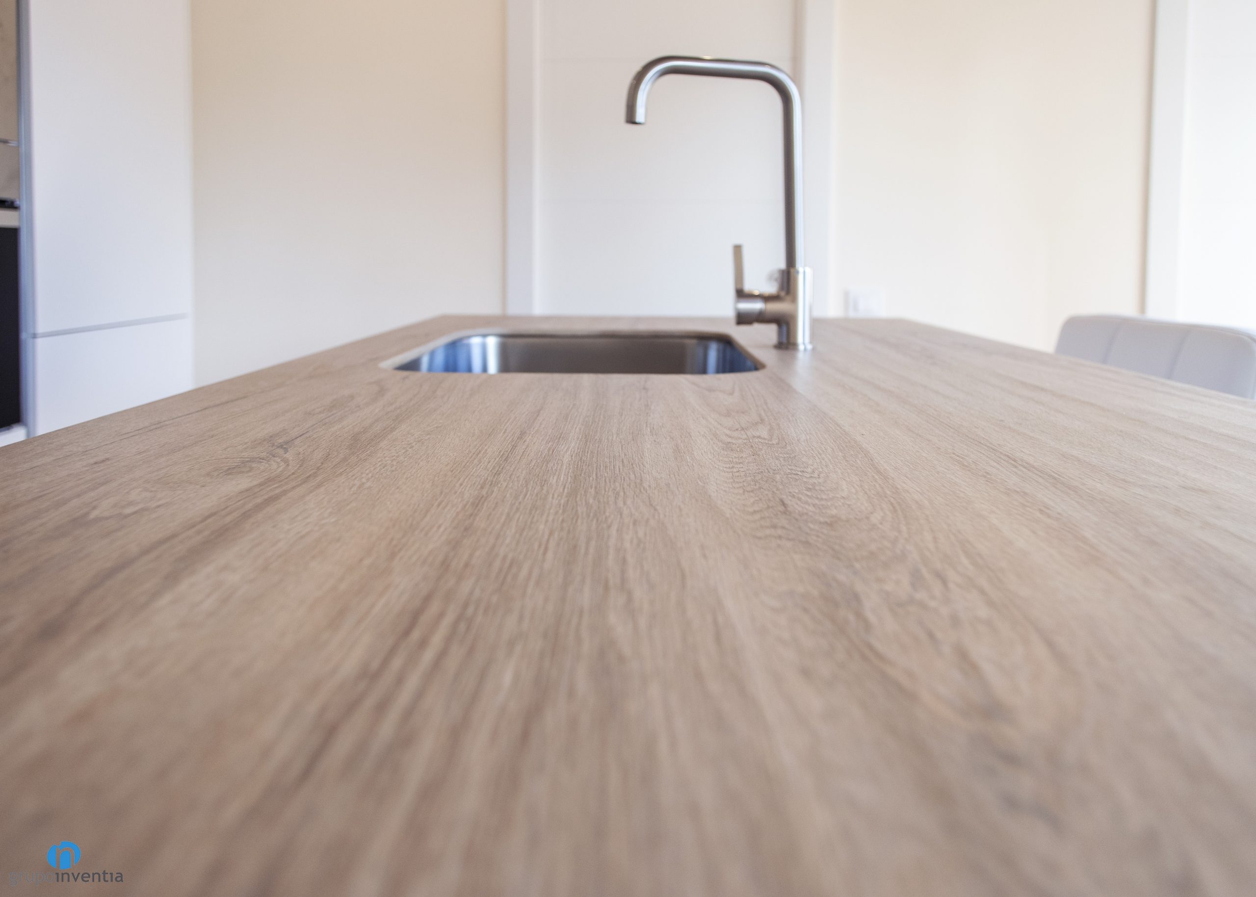 This is an open kitchen distributed on two fronts. One of them is the kitchen island, which has a support and work surface and can also be used as a breakfast bar. In addition, this has been the place chosen to place the sink. The lower area has cabinets that extend the storage space in the kitchen.