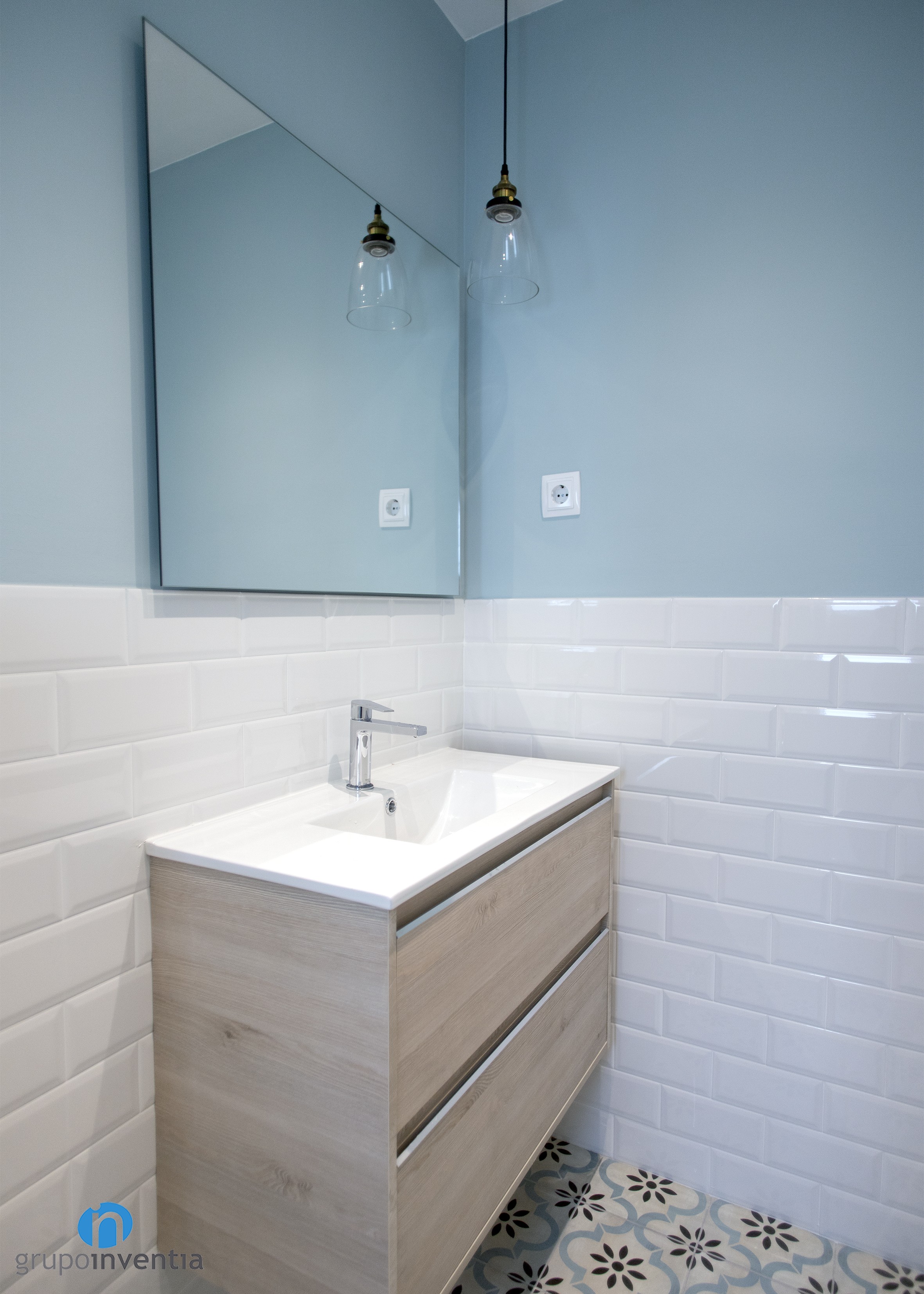 The image of the main bathroom is very cool and cozy. In it, the walls were tiled in medium height with white colored tiles and painted a soft blue tone the rest of the wall until it reached the ceiling. That better combination for that reason than to place a hydraulic pavement with motifs of the same colors.