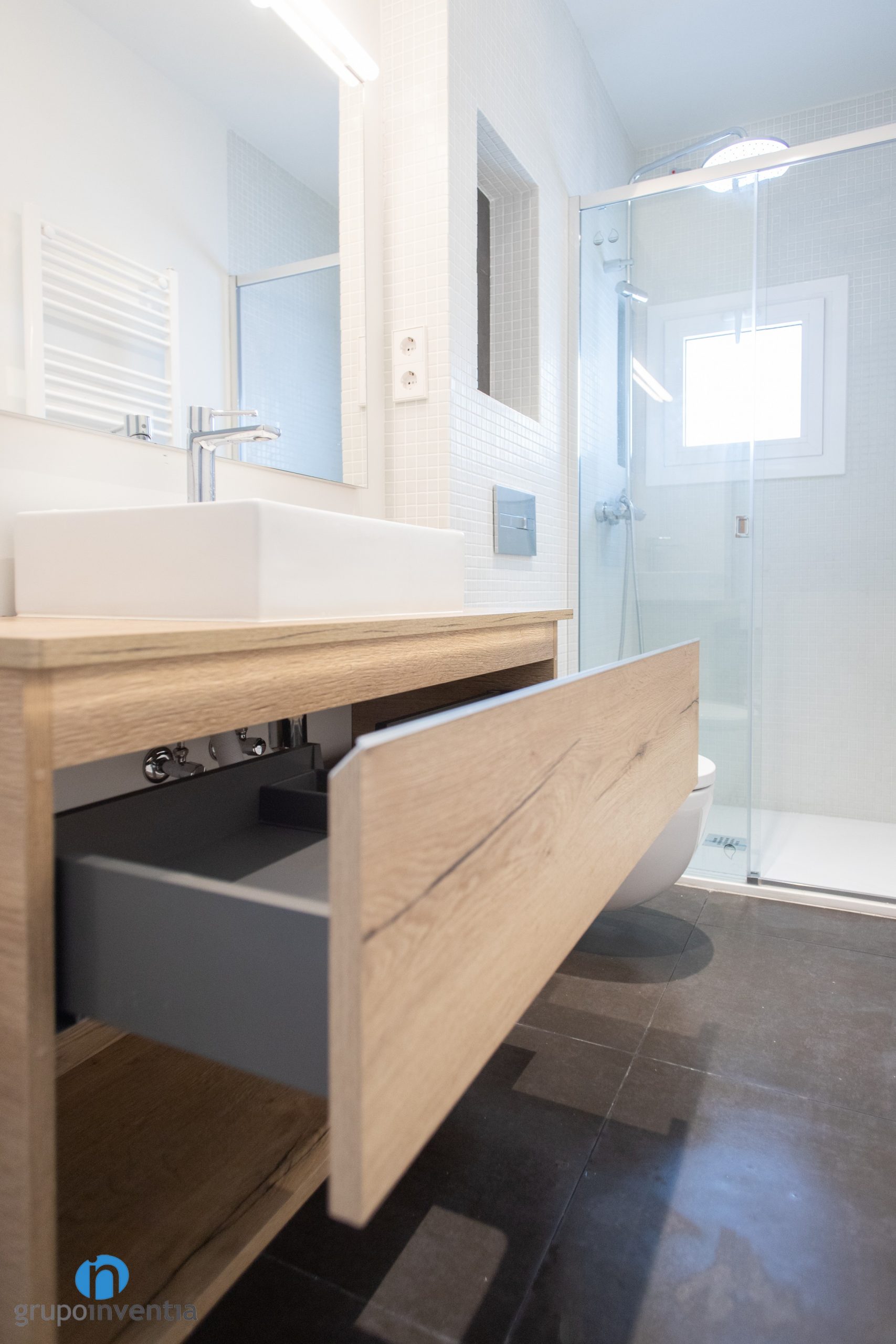 As for the new sanitary equipment, a countertop washbasin has been installed. At the bottom it has compartments and drawers for storage. For the toilet, one with a hidden cistern has been chosen, something that contributes to expanding the visual space of the bathroom. The water area is a white shower tray protected with transparent partition doors.
