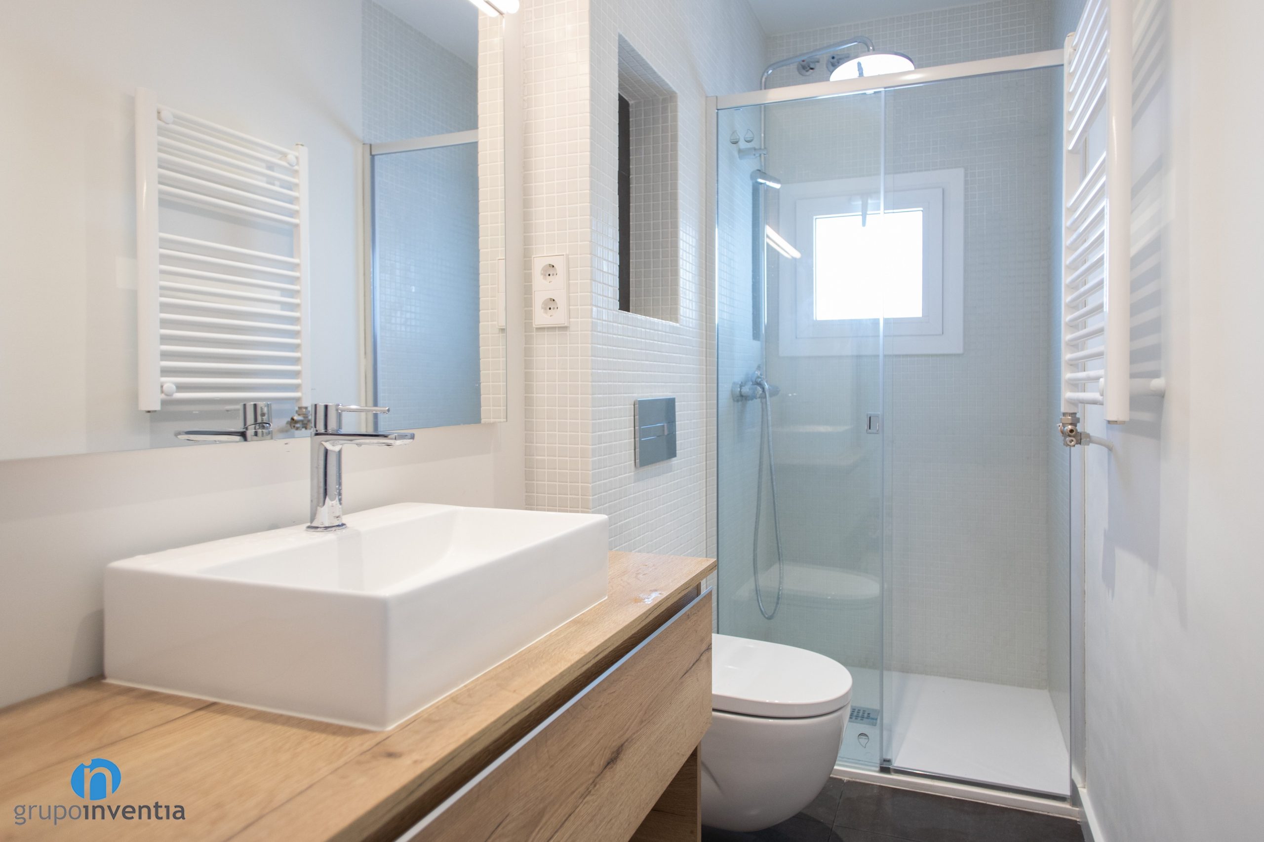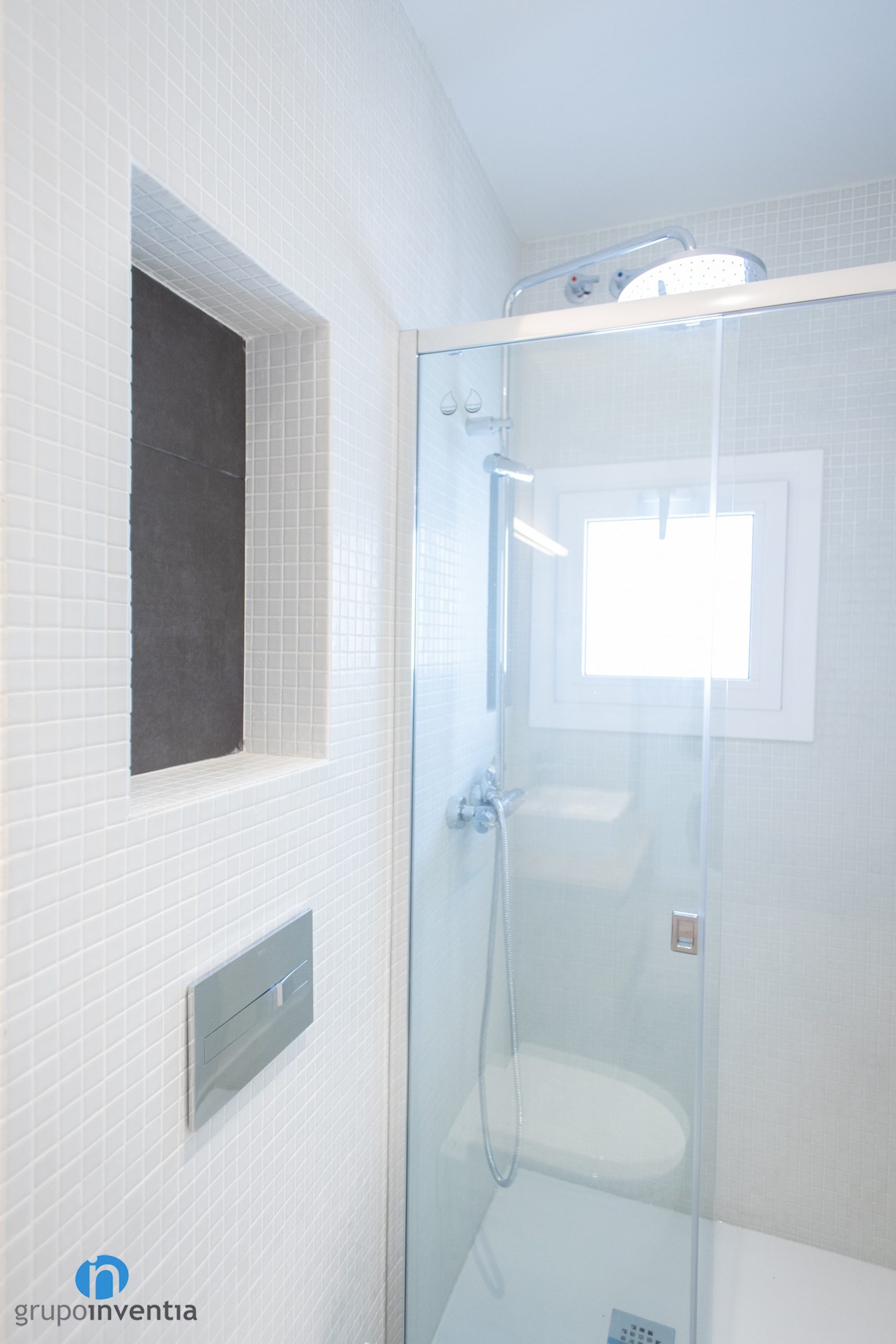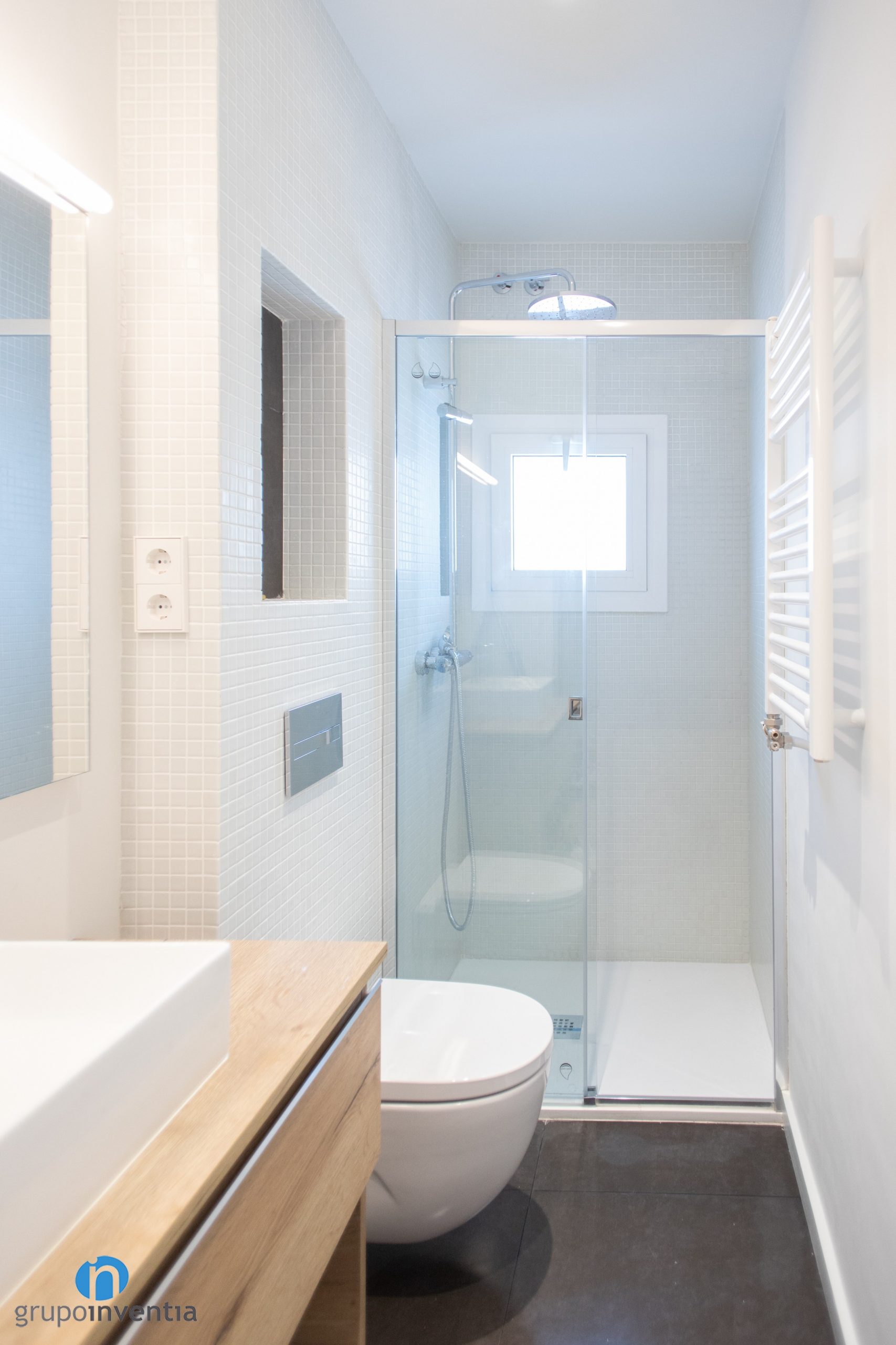 Another of the renovated rooms in this house renovation in Barcelona is the bathroom. We have improved both its interior design and sanitary equipment. It is now ready to offer the best features and functionality in its use. The walls have been painted white and a bright and spacious room has been achieved. The walls of the sink and shower have been tiled with white mosaic tiles. For the floor we have opted for a stoneware pavement in stone gray.