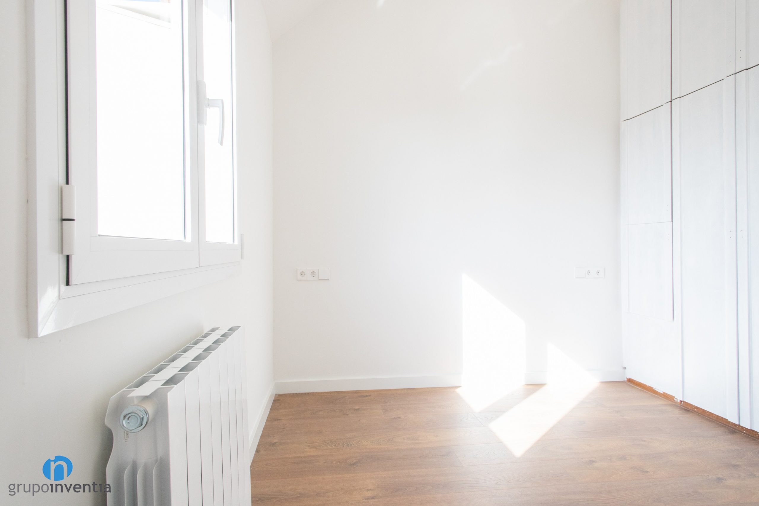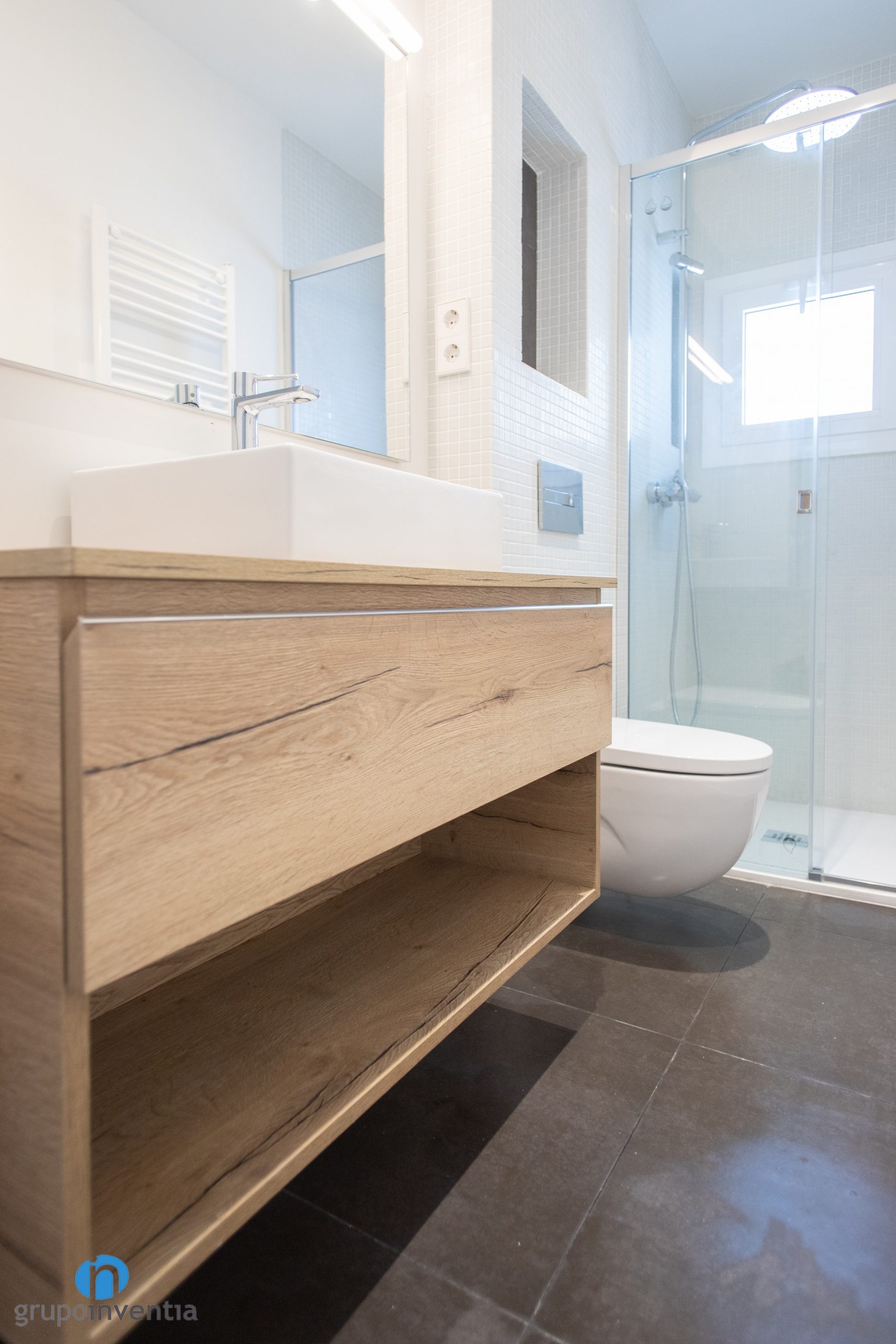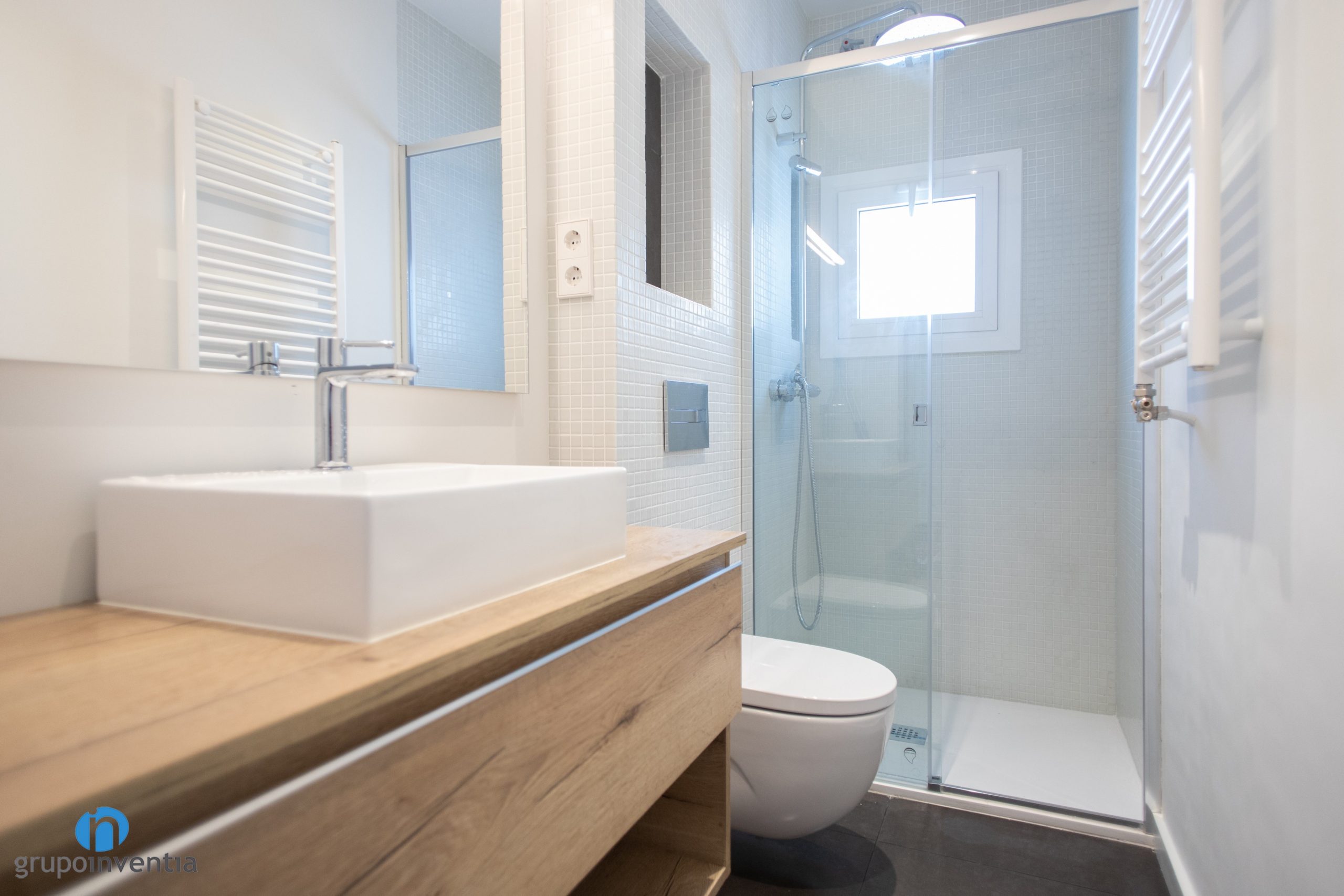 Another of the renovated rooms in this house renovation in Barcelona is the bathroom. We have improved both its interior design and sanitary equipment. It is now ready to offer the best features and functionality in its use. The walls have been painted white and a bright and spacious room has been achieved. The walls of the sink and shower have been tiled with white mosaic tiles. For the floor we have opted for a stoneware pavement in stone gray.