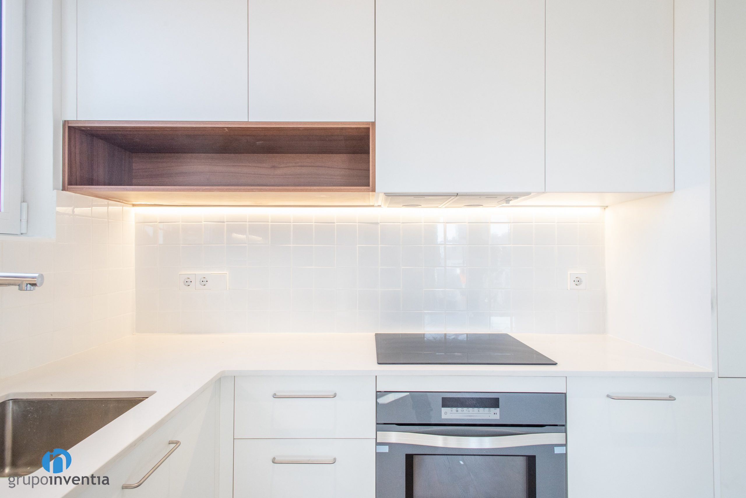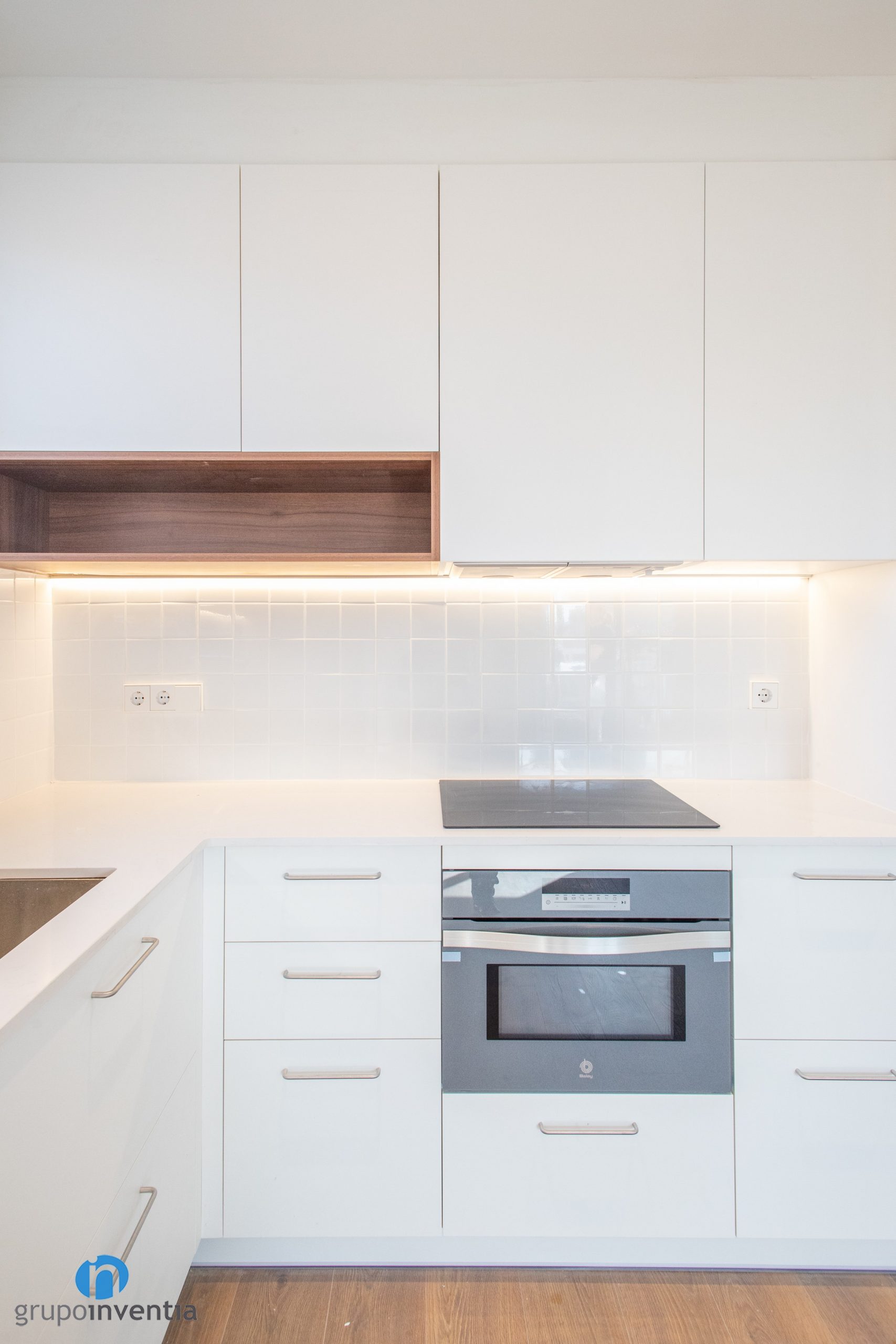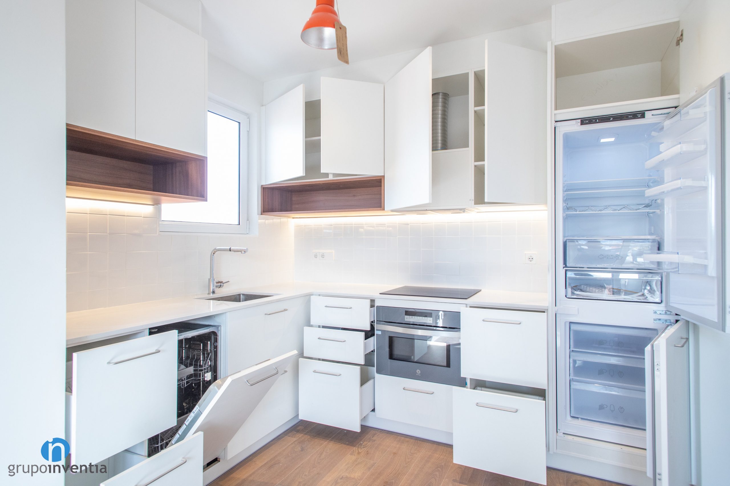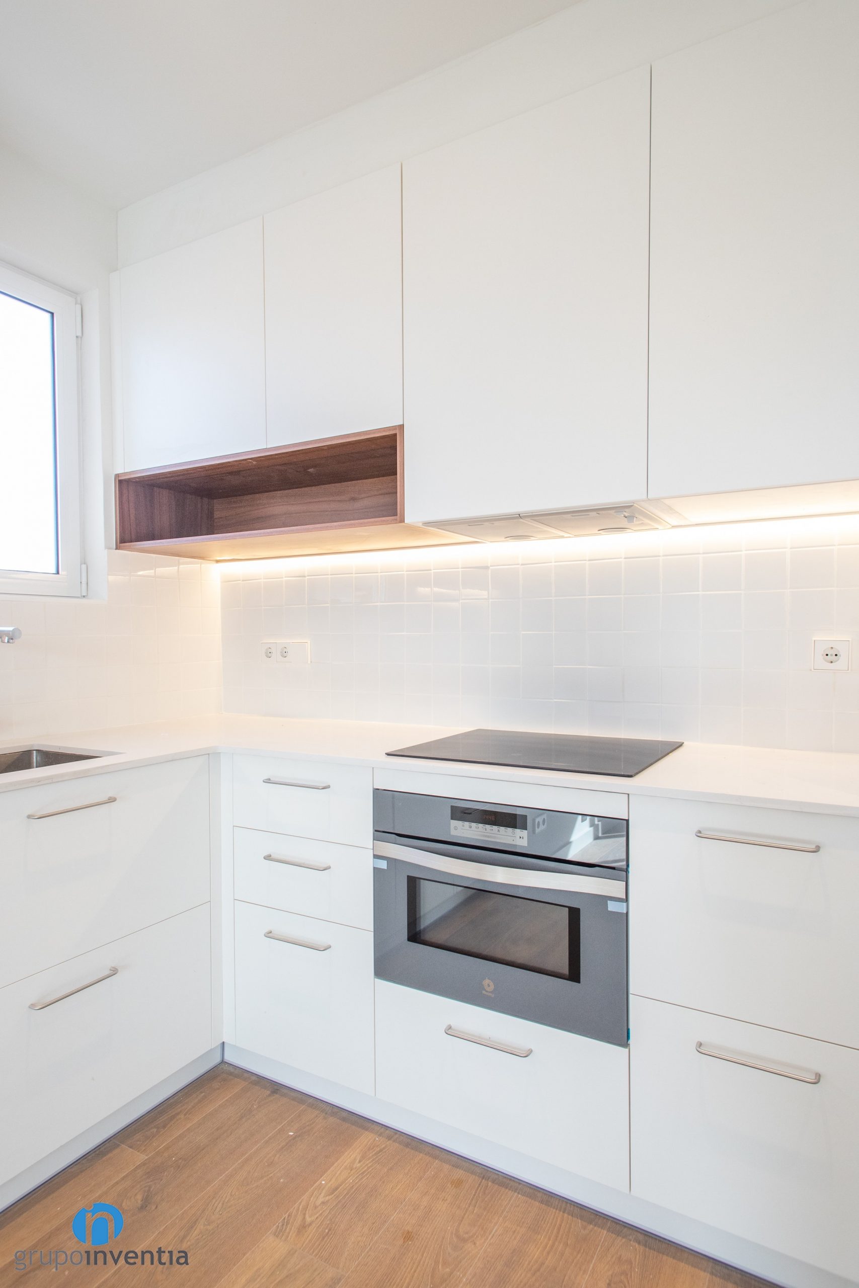 In this house renovation we work in the renovation of an open kitchen and with a distribution in the form of L. For the new furniture has chosen the color white and integrates perfectly in the global design of the house. At the far left has been integrated a refrigerator that is camouflaged by the same doors of the kitchen cabinet.