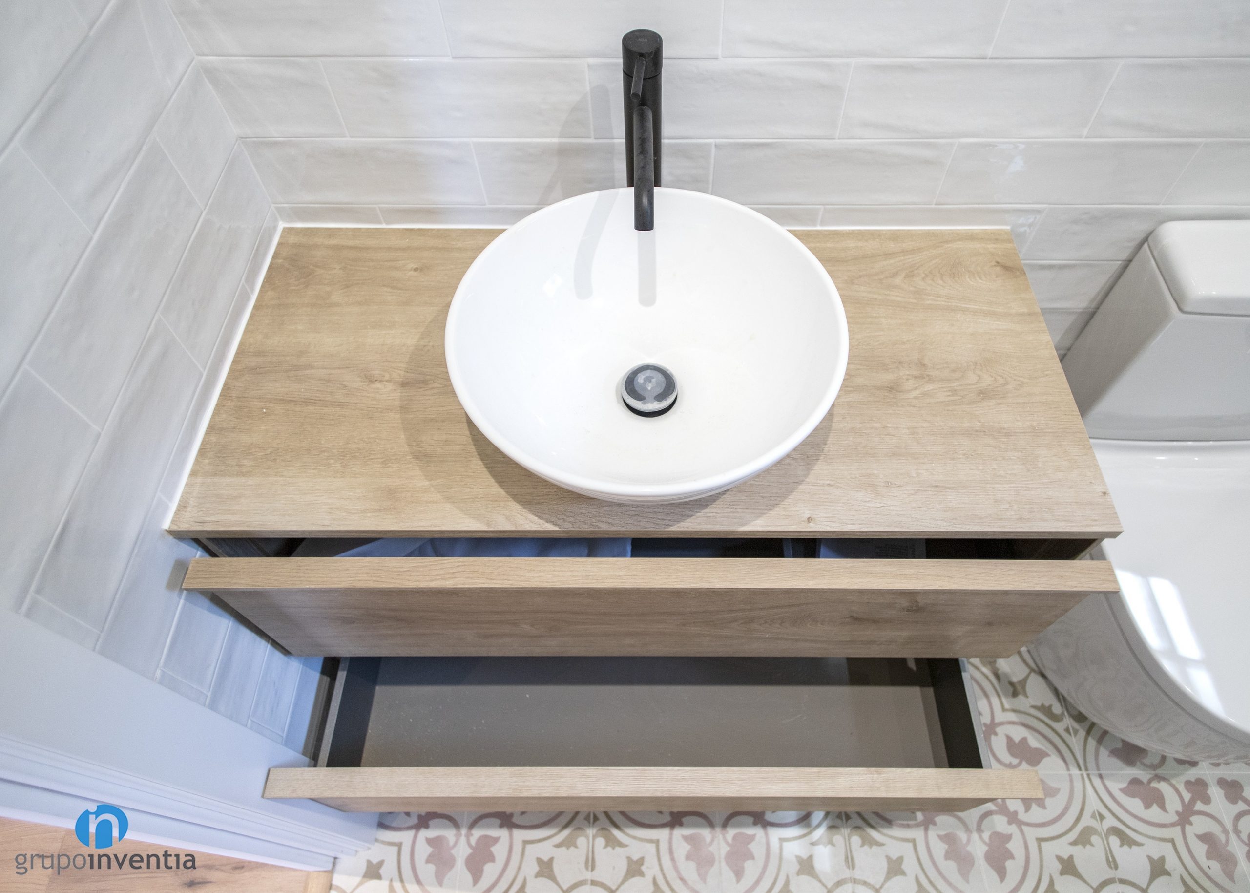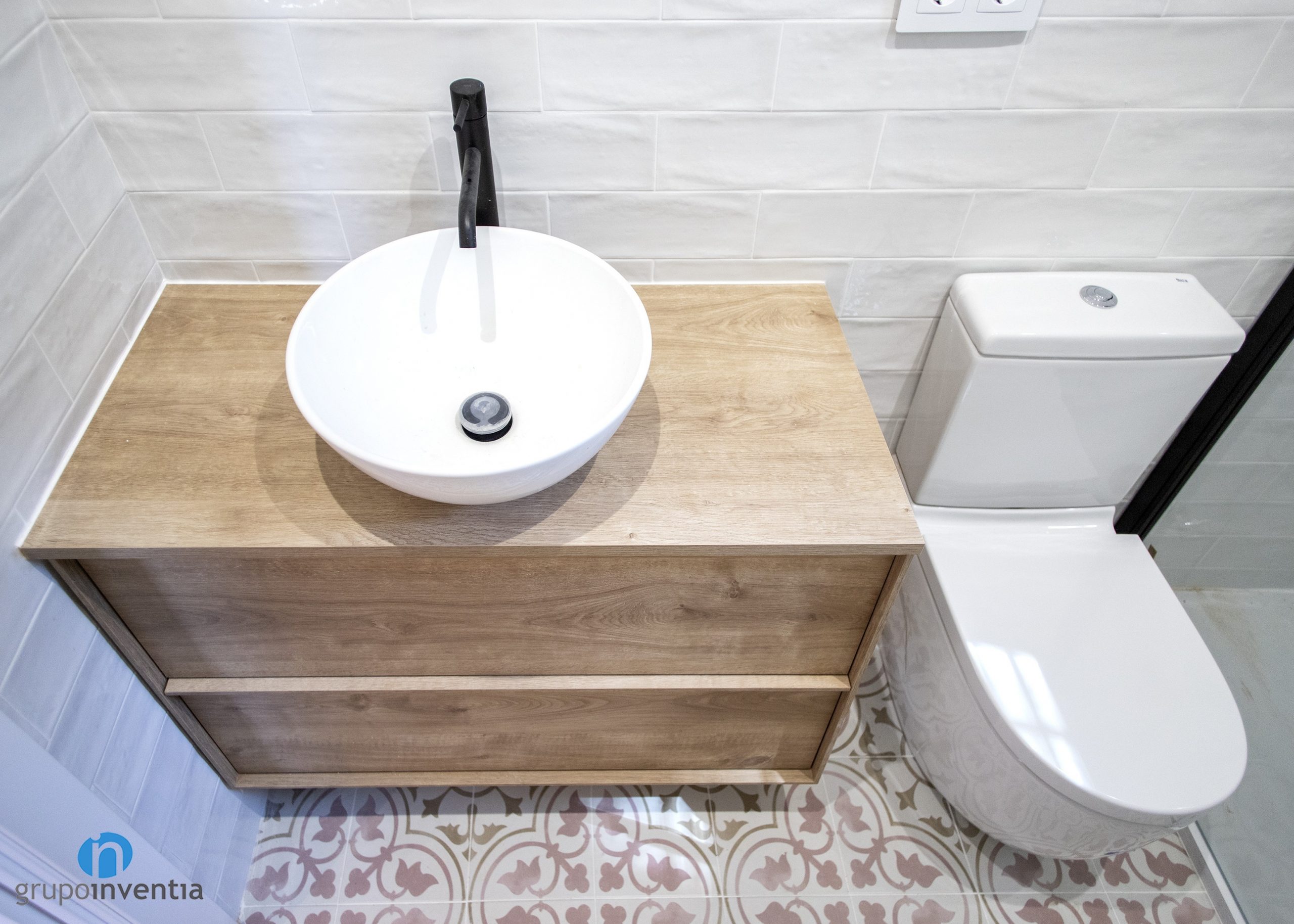 As for its new image, the walls have been tiled at medium height with white metro type tiles. The rest of the wall until reaching the ceiling has been painted beige. In both bathroom renovations a hydraulic type flooring has been installed. An excellent option both visually and practical, as it is a well-maintained surface.