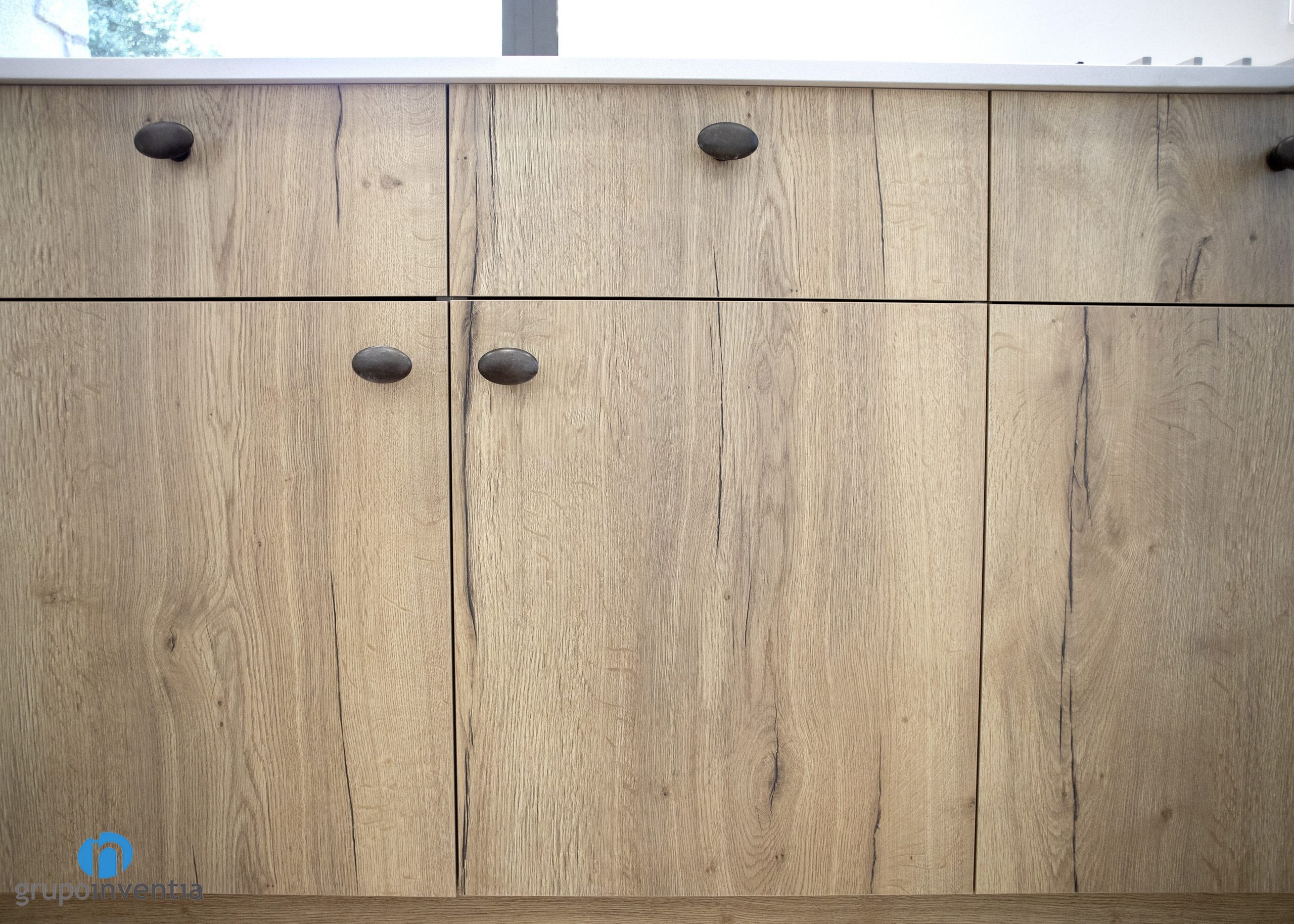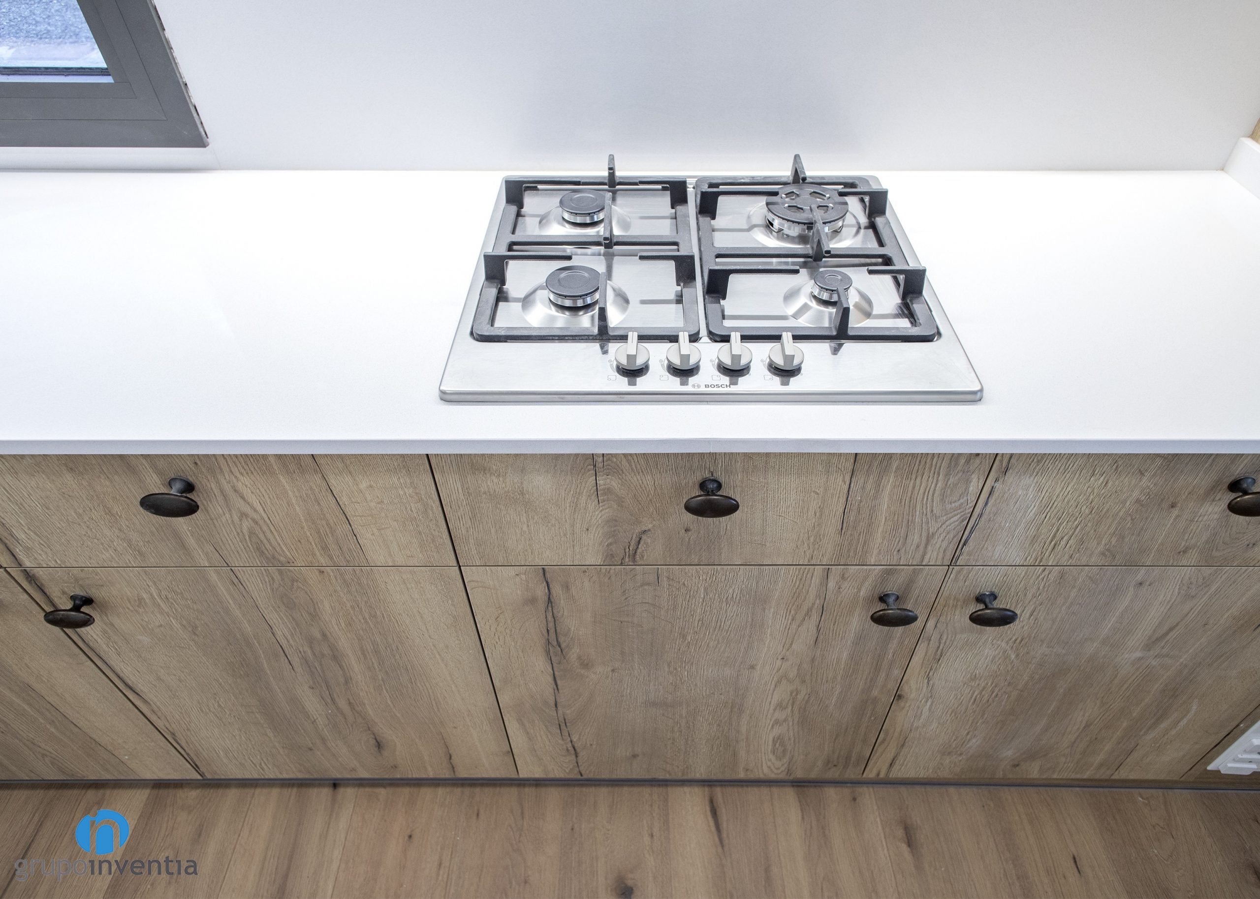 In the kitchen, the general decorative line of this house renovation is followed. The same parquet flooring has been used and the kitchen cabinet also has the same finishes in medium wood tones. All this in the lower part of the worktop, which has several drawers and cabinets that generate a large storage capacity.