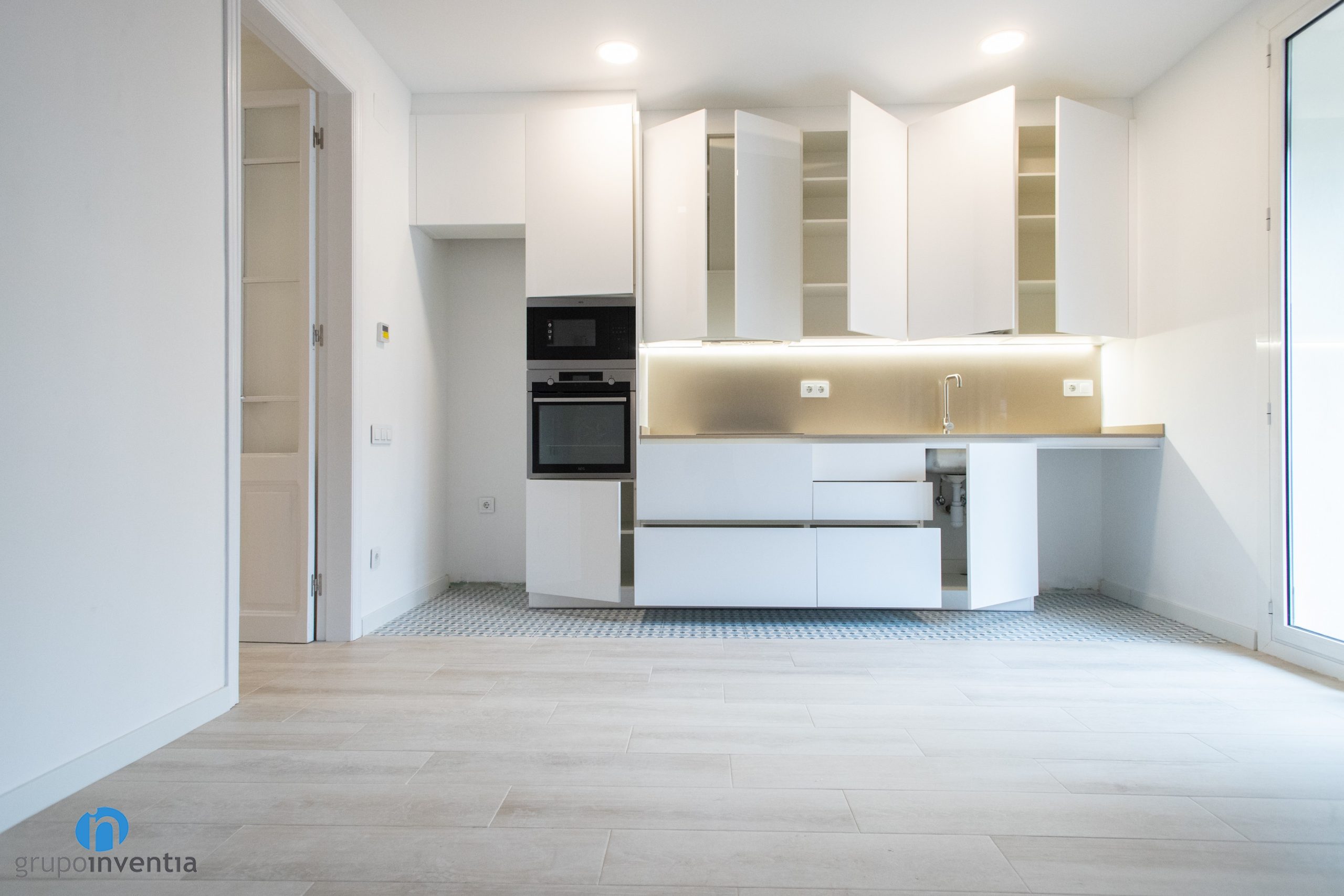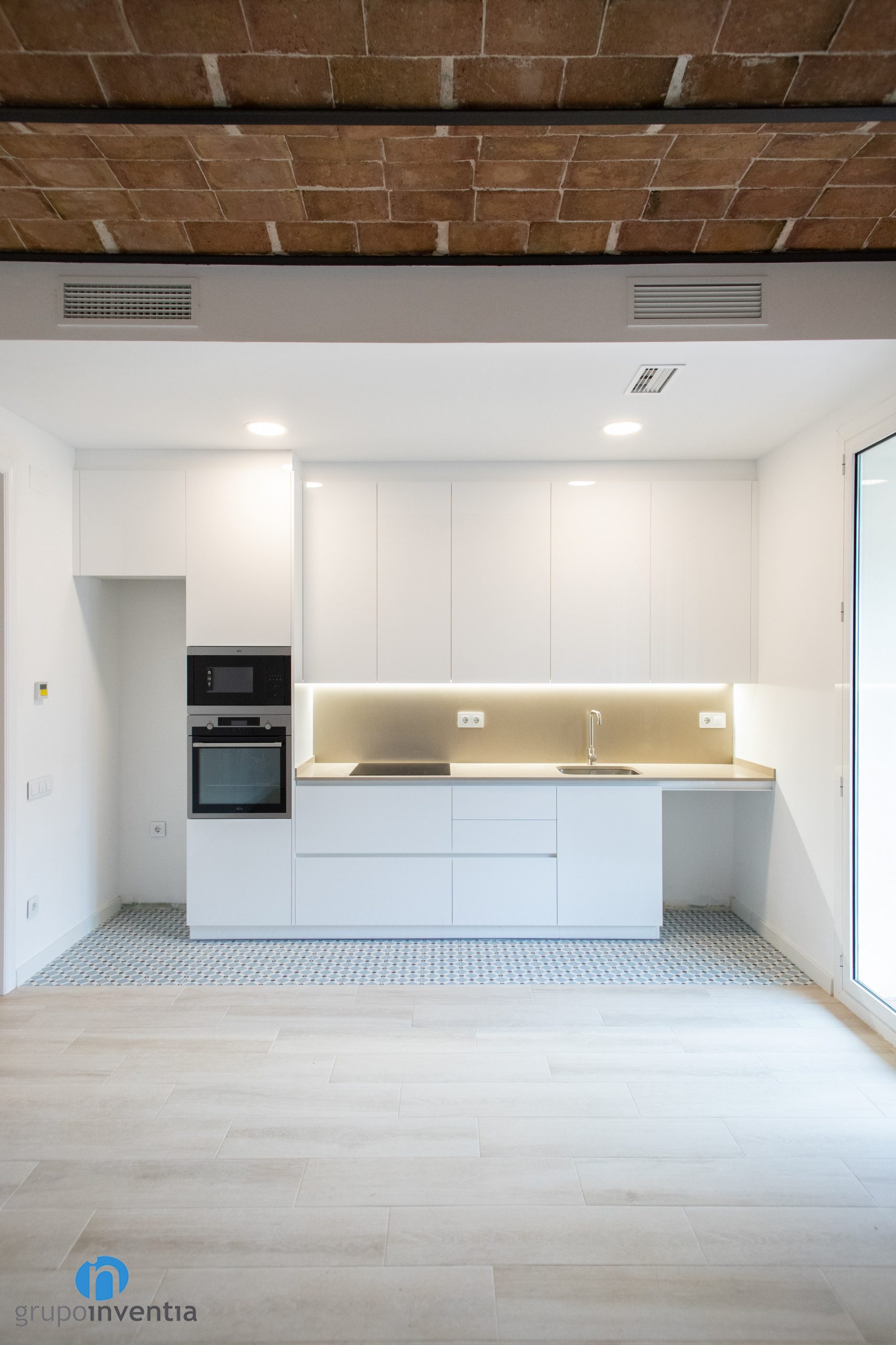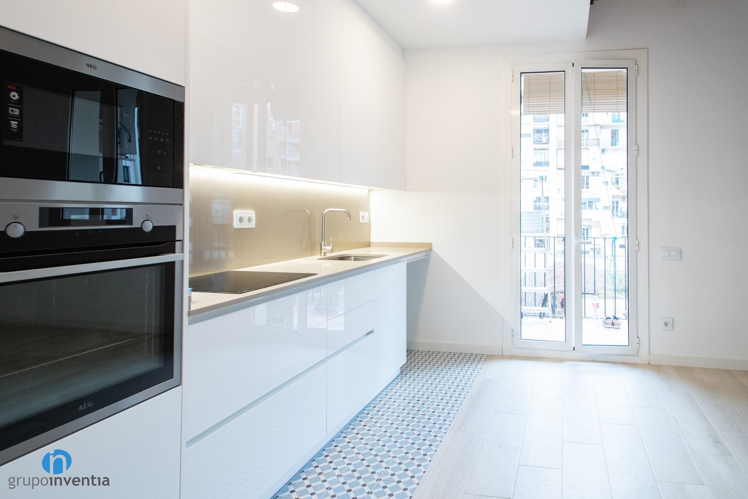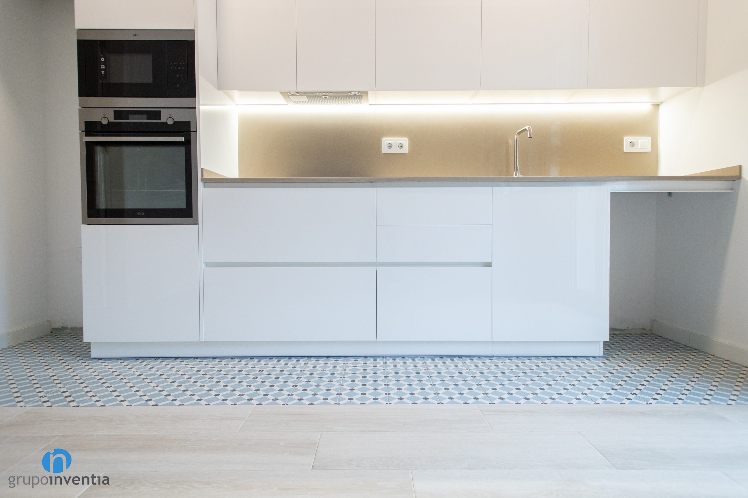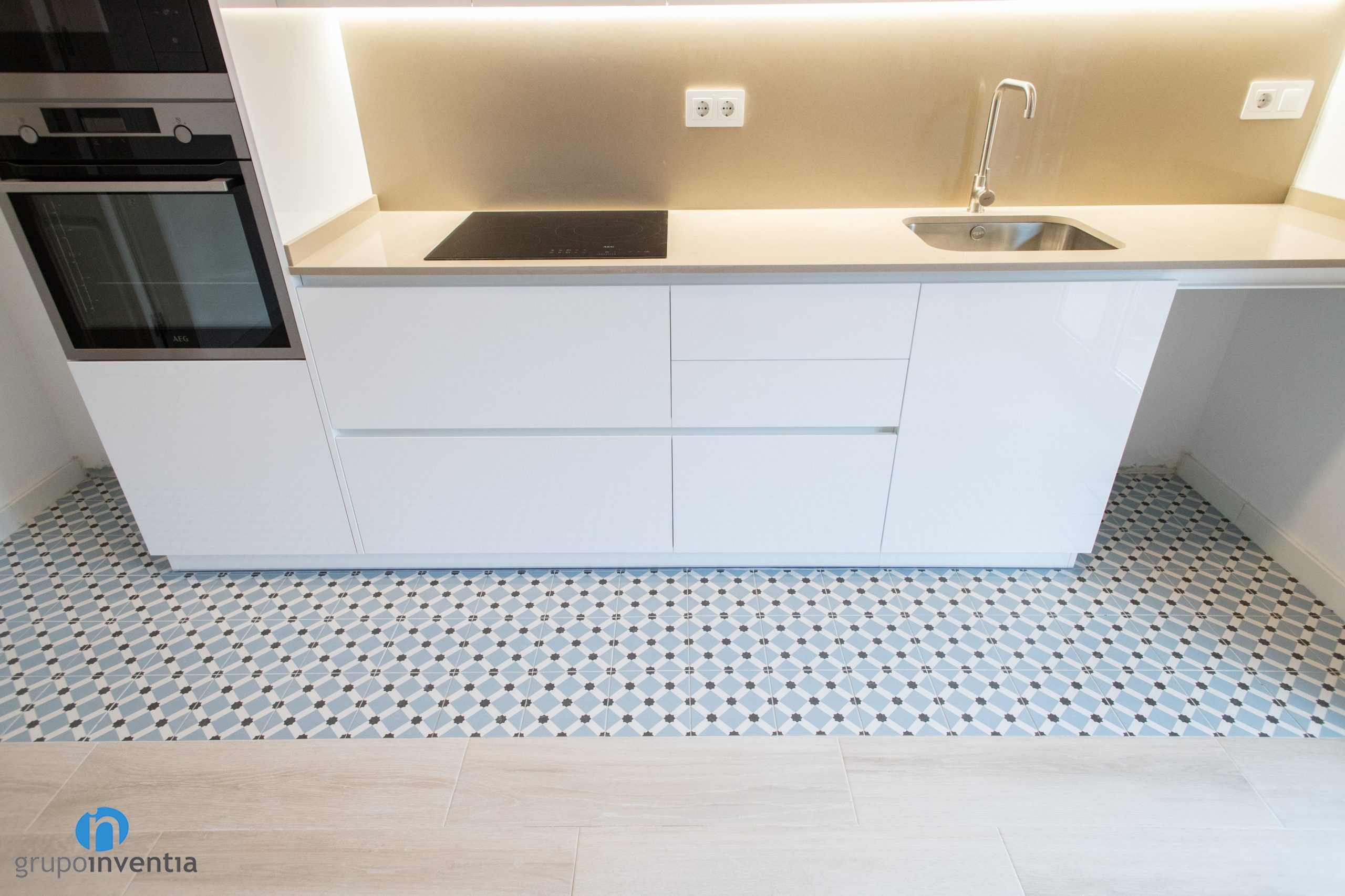 Then an elongated countertop appears. A ceramic hob and an integrated sink have been installed on it. Both at the bottom and top there are drawers and storage cabinets. A white kitchen furniture that follows the general decorative line. Another novelty in this kitchen renovation is the pavement. A hydraulic type floor has been placed that visually delimits the kitchen space.