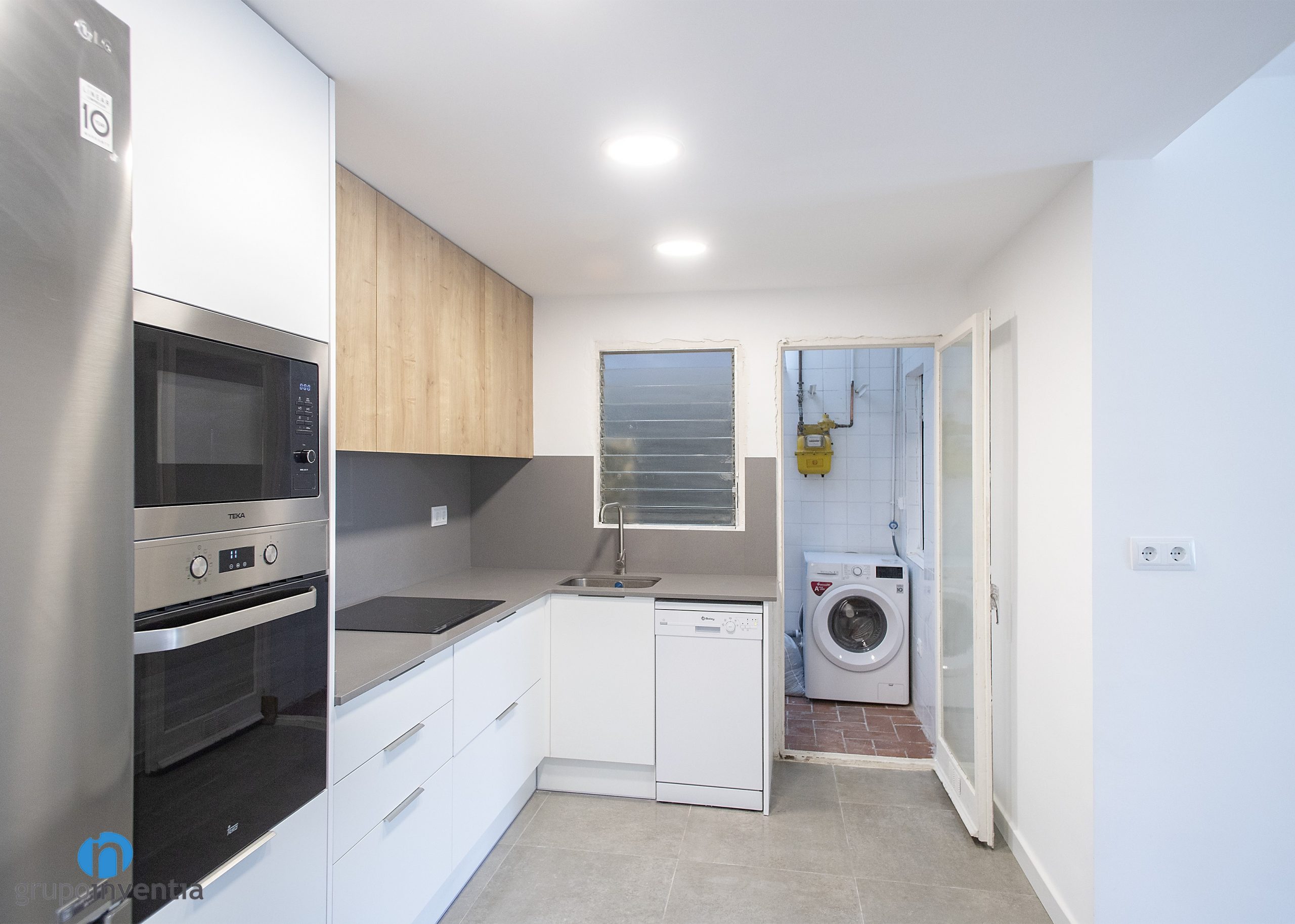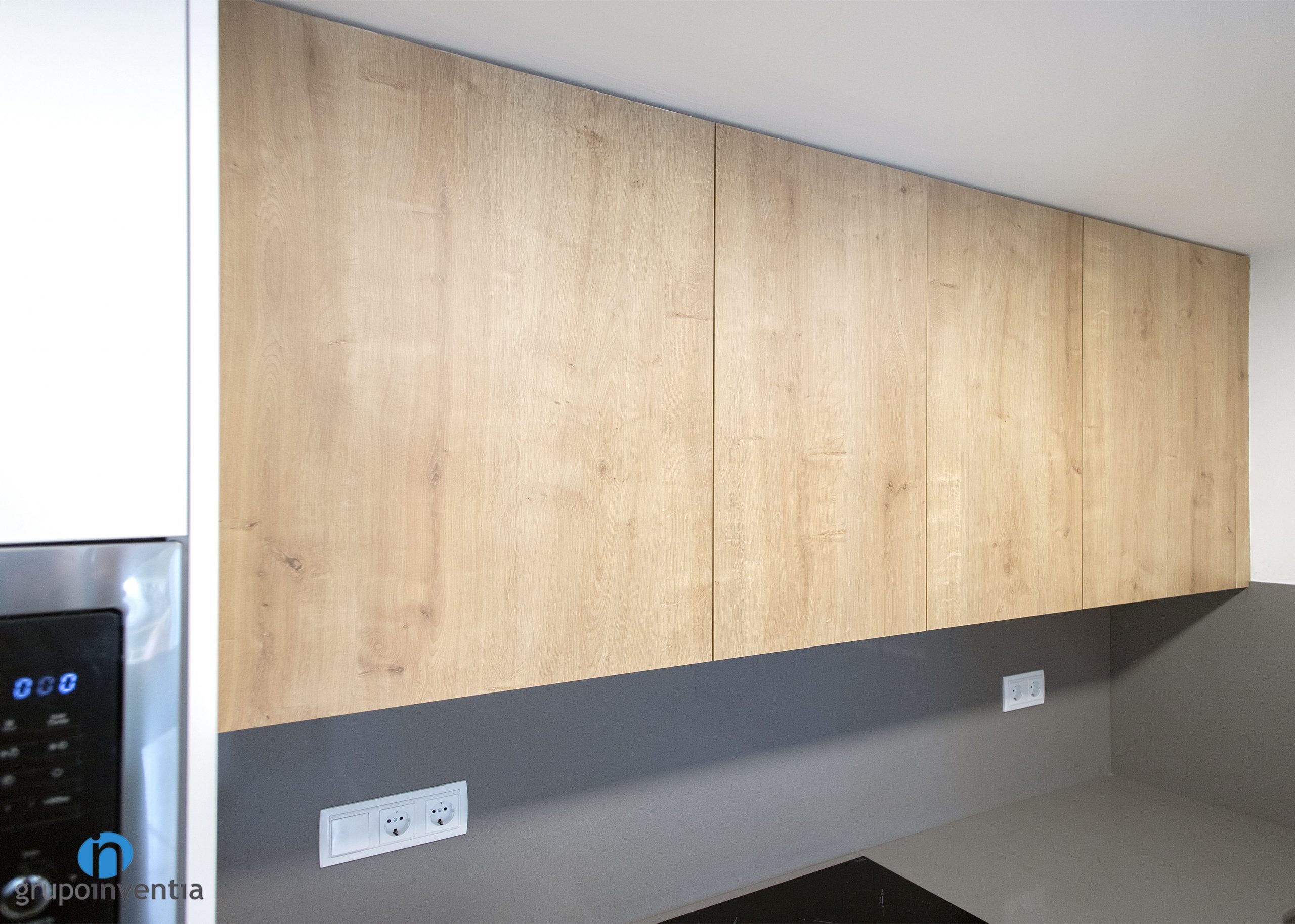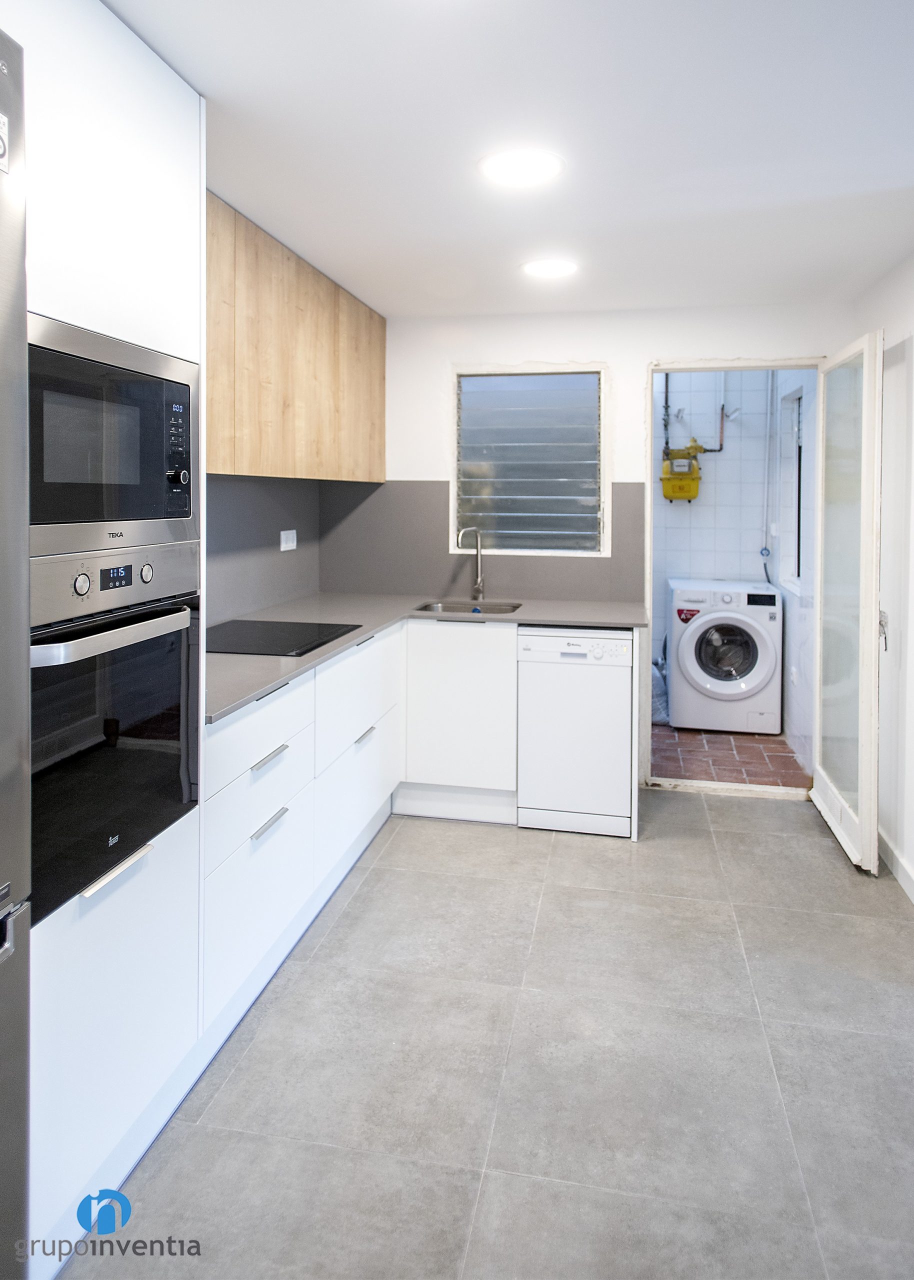 The countertop turns to the right, giving rise to a second section with a sink and a wide support surface. This kitchen renovation combines a white piece of furniture on the lower floor and cabinets with wooden finish on the upper. For their part, the tiles are gray, matching the tiled tile.